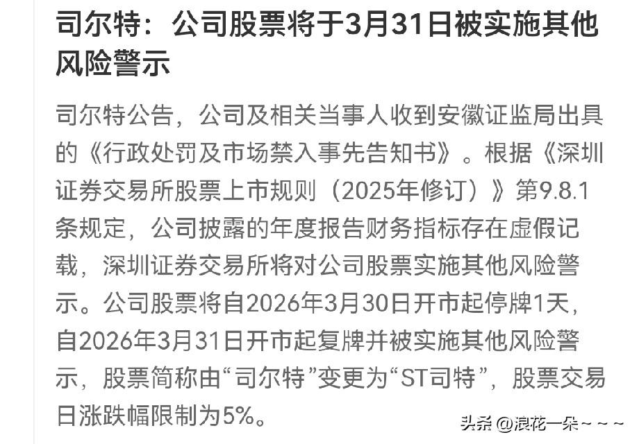 股市风险有多大? 这不,又逮到了一个财务造假的? 司尔特公告:公司股票将于3月31日被实施其他风险警示。 原因是公司披露的年度报告财务指标存在虚假记载。这不就是财务造假吗?说 难听一点,是非常严重,性质恶劣的,也是监管部门严打的重点之一。 看了一下该公司目前的基本面也还算是可以的。市盈率才28左右,市值60多亿,2025年三季度报盈利1.5个亿左右,该公司是磷化工一体化龙头,还拥有稀缺高品位的磷矿资源…这可都是当前的热点啊。 然而,看上去这么好的公司还涉嫌了财务造假?不知道是为了啥?是什么原因?如果被ST了,主力还继续看好还可以,如果不继续看好可别连续好几个跌停啊。请大家注意股市的风险啊,本来钱就不好赚,别到时候踩个坑。
