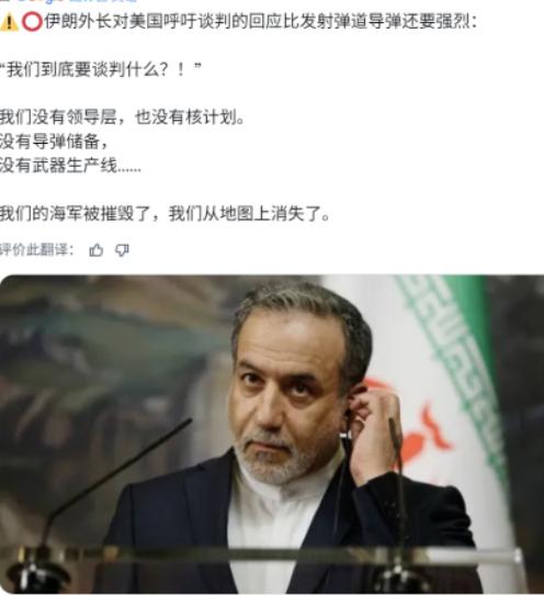 伊朗外长这话说的太有水平了! 他说:我们要谈什么?我们的领导人已经被炸没了,没有核计划,没有导弹库存,没有武器生产线……我们的海军已被摧毁,我们已被从地图上抹去。 猛一听,这简直是低头的台词,可你稍微一品,味儿不对,这哪是认怂,这分明是呛火呢。意思就是,你们都把我们捶成这样了,还假惺惺地要谈啥?这不纯纯是讽刺吗! 那伊朗到底被揍得有多惨呢?事实摆在那儿,确实不轻。就上个月底,美以一次空袭,直接把伊朗最高领袖哈梅内伊和一大票军队、政府的头头脑脑给端了。 这打击,搁哪个国家身上都是伤筋动骨,等于大脑指挥中枢被人猛敲了一闷棍。接着,那个能在政府、军队和宗教圈子之间传话搭桥的关键人物,也让人给暗杀了。 这之后,又有好几个高级军官接连出事。前前后后,四十多个高级别官员没了,这种打法,摆明了就是不想让你这个国家机器正常转悠。 海军更惨,说出来都令人惊讶。美军那边自己说,伊朗海军那些像样的大船,九成以上都已经被击沉了。一百多艘舰艇没了,包括他们当宝贝似的无人机航母。 最惨的一次,一艘护卫舰在印度洋那边被潜艇打了,一船一百多个官兵,都没回来。为啥输这么惨?一方面是战备松懈,船都停在港口里,成了活靶子;另一方面,装备也确实老旧,在美国那些先进飞机导弹面前,有点不够看。 这么一看,伊朗好像真是被按在地上摩擦,没有还击能力了。所以美国那边觉得,是时候了,通过一些中间人传话,想赶紧停下来。 可伊朗外长的回复,就显出了他们的态度。他说,我们要的是彻底结束战争,可不是那种暂时歇口气、过段时间接着打的“停火”。 这话就硬气了,直接把皮球踢了回去。而且他们还开出了条件,总结下来就是:你们先全停手,赔我们损失,保证以后不再打,还有海峡那地方,得我们说了算。 最后这一条,可是戳到肺管子了,那地方是全世界石油运输的重要水道,美国怎么可能轻易答应?所以说,这谈判,压根就没在一条线上。 那伊朗的底气到底从哪儿来呢?他都被打成这样了,还敢开这么高的价码?这就是有意思的地方了。 你别看他海军没了,高级官员死了不少,但他最让邻居们害怕的那个东西:导弹,人家家里还真有不少存货。根据不少军事专家的评估,战前伊朗就是中东的“导弹大户”,存了好几千枚。 这几个月虽然天天挨炸,也往外打了不少,但据说很多深度藏在地下工厂里的新导弹,还没怎么动用呢。有个说法是,它现在的导弹生产线,开足了马力一个月还能造出几百枚新的。这就有点可怕了,意味着他有可能“边挨打,边生产,边还手”。 更绝的是,伊朗前阵子还搞了个“电视展示”,把他们地下导弹仓库的画面放出来了,隧道里一排排导弹,密密麻麻,配的文字是“这只是冰山一角”。 这明摆着是秀肌肉,告诉全世界:我的老本还没动呢。不光秀库存,他还秀了一把“手艺”,往印度洋深处一个距离伊朗几千公里远的美英军事基地附近,打了两枚导弹。 这意思再明白不过了:别以为我够不着你。 除了手里有硬货,伊朗还会玩“分化”这一手,那就是“敌国”不能通过门口的海峡。 这一下就把世界分成了两拨,朋友和敌人。这既是在展示自己对这条黄金水道的控制力,也是在给美国制造外交压力,拉拢更多国家。 美国那边,其实也有自己的烦心事。最大的问题就是,钱烧得肉疼。拦截导弹是超级烧钱的游戏,美军高层都透露过,现在每天光拦截的成本就是个天文数字,算下来每小时都在消耗上千万美金。 这谁家也扛不住长期这么耗,而且,一直吹得很神的以色列“铁穹”防空系统,最近也被打穿了,伊朗的导弹实实在在地落到了以色列的城市里,造成了伤亡。 逼得以色列不得不收缩防线,重点保护首都,其他地方有点顾不上了。这说明,伊朗的导弹,是真能构成威胁的。 更微妙的是,伊朗还在“挑人”,他们点名说要和美国副总统万斯谈,不信任特朗普派来的特使。为啥?因为他们觉得特朗普那边的人太偏袒以方。 这招挺聪明,等于在美国政治内部“掺沙子”,试图放大他们之间的矛盾。副总统如果通过谈判真促成了和平,那对他个人的政治声望是巨大加分,他就会有动力去推动。 伊朗这是在给自己寻找谈判桌上可能的“盟友”。 这场仗打到现在,其实成了一场消耗战。美国想用绝对的力量,迅速把伊朗打跪下。但伊朗用行动证明,我可能打不过你,但你也别想轻易打垮我,我能让你一直疼,一直流血,一直花钱。 双方都在咬牙硬撑,看谁先顶不住。 可问题是,你力量再强,可以把别人的军队打残,把建筑炸毁,但你很难消灭一个民族的抵抗意志。 打,只会让平民受苦,让地区更乱,谈,哪怕再艰难,也是走向和平的唯一台阶。 参考资料: 伊朗外长:伊朗经调解方与美“交流信息”,没有谈判.--上观新闻
