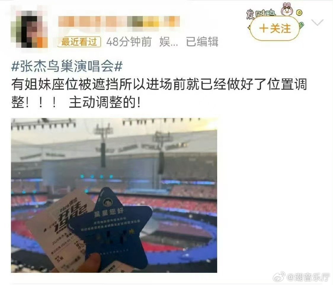 张杰鸟巢演唱会主动更换视线遮挡区 张杰鸟巢演唱会不忽视任何一个小细节,主动优化座位,体验感直接拉满