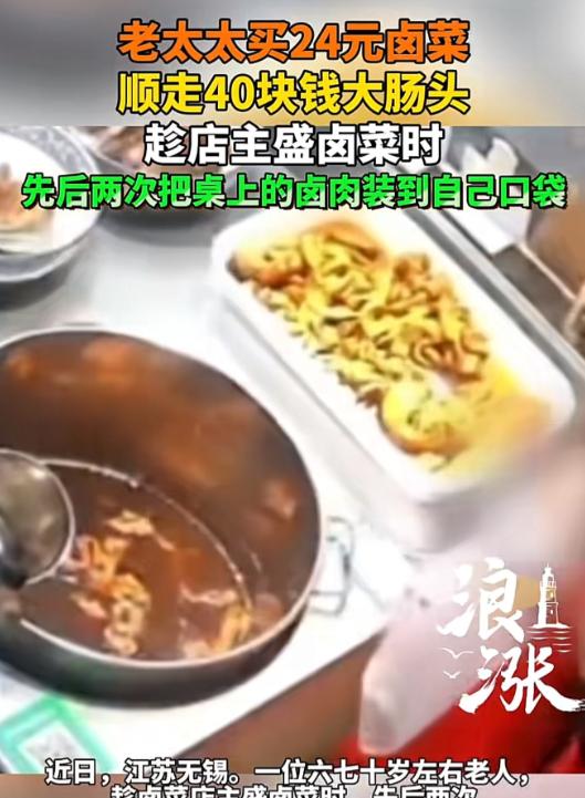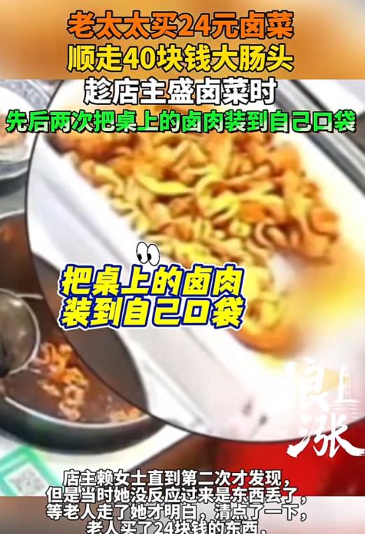 “丢人丢大发了!”近日,江苏无锡,女子经营一家卤菜店,一日,她发现托盘里的卤大肠少了,她赶紧调取监控查看,这不看不知道一看吓一跳,一六七十岁老人,付款时,趁她不注意,先后两次偷偷将肥大肠装进自己的袋子里,动作行云流水,像拿自己家的一样顺畅。女子算了一下,老人共买了24元卤菜,拿走了40元的卤大肠。女子一气之下将视频发布到网上,让网友给评评理。网友:坏人都变老了! 这年头,做点小本买卖真是不容易,江苏无锡有位赖女士,开了家小小的卤菜店,每天起早贪黑地洗卤、熬汤,赚的都是辛苦钱,本来日子过得平平淡淡,没成想前几天碰上一件让她又气又无奈的事。 那天店里生意还不错,赖女士忙前忙后地称重、切菜,根本顾不上盯着每一个角落,等忙过一阵,她想整理一下货品,这一看不要紧,发现摆在外面的卤大肠明显少了数,而且少的还是那种最值钱的大肠头,算下来大概有40多块钱的货。 赖女士当时就犯嘀咕,这大肠头也不是小物件,那么一大块,拿起来多显眼啊,谁会顺手牵羊呢? 越想越不对劲,赖女士赶紧去调监控,这一看,差点没把她气晕过去,监控画面清清楚楚地拍到,顺走大肠头的不是别人,竟然是一位看起来六七十岁的老太太。 这老太太戴着帽子、口罩,穿得干干净净,看着还挺慈祥的,她在店里先是正常挑了些卤味,一共花了24块钱,付完钱也没马上走。 就在赖女士转身给别的顾客装菜的空档,老太太左右瞟了一眼,看没人注意,那手就跟练过似的,飞快地伸到盘子里,抓起一块大肠头就往随身带的袋子里塞。 塞完之后,跟没事人一样站在原地,大概过了一分钟,看赖女士还在忙活,老太太又凑过去,故技重施,再拿了一块大肠头。 这两次动作行云流水,一点都不慌不忙,那熟练劲,不知道的还以为她在拿自己家东西呢。 赖女士回忆说,第二次老太太伸手的时候,其实她余光瞥见了,可当时太忙,脑子没转过弯来,以为老人只是不小心碰了一下,压根没往偷东西那方面想,等老太太慢悠悠地走了,她一清点才发现,这单生意不仅没赚,还倒贴进去40多块钱。 这大肠头可不是大风刮来的,赖女士说,为了这几十块钱的货,她得提前好几个小时准备,光是把生大肠反复清洗、去油、去腥,就得至少洗三个小时,然后再卤上四个小时才能出锅,成本高、费功夫,就指望这点东西赚点辛苦钱养家糊口。 赖女士越想越觉得荒唐,就把监控视频剪了一段发到了网上,想让网友们评评理,也给同行提个醒。 视频一出来,立马引起了热议,网友们的评论基本是一边倒。有人说:“这不是老人变坏了,是坏人变老了,这么大岁数还干这种偷鸡摸狗的事,真是丢人。” 也有人心疼赖女士:“小本生意太难做了,起早贪黑赚点钱容易吗?被人这么顺走,换谁心里都不好受。”还有人说:“24块钱都知道付,40块的大肠就舍不得掏钱了?这算盘打得也太精了吧!” 也有不少网友劝赖女士报警。但她琢磨了一下,最后还是算了,她说,不是不在乎那点钱,主要是觉得老人年纪大了,真要报警处理,对老人的名声、家里人的影响都不好,万一老人有个好歹,自己心里也过意不去,就当是花钱买个教训,吃个亏,以后看店多留个心眼。 从监控里能看出来,这位老太太两次下手的动作都特别熟练,眼神稳、手速快,一点都不紧张。 不少网友都推测,这大概率不是她第一次干这种事了,只不过这次正好碰上有监控的店,被拍了个正着。 这事虽然不大,也就几十块钱,但让人看着心里特别不舒服,大家尊重老人,那是尊重他们的品行和阅历,不是说年纪大了就可以倚老卖老,随便贪小便宜、顺手牵羊。 小生意人本来就艰难,每天守店十几个小时,赚的每一分钱都是血汗钱,这样顺手拿走,说轻点是贪小便宜,说重点这就是偷窃,不管金额多少,这事都不地道。 赖女士把视频发出来,也不是为了网暴谁,就是觉得自己委屈,觉得这事太荒唐,现在她看店比以前仔细多了,柜台边的贵重卤味都往里面挪了挪,要是有人站在那久一点,她就多留意两眼。 只是她怎么也想不通,那么大年纪的人了,为了几十块钱的一口吃的,连脸面都不要了,值得吗? 这事也给不少开店的朋友提了个醒:不管顾客看着多老实、年纪多大,该有的防备心还是得有。 监控要装好,货品摆放也要讲究点,不然自己辛辛苦苦赚的钱,不知不觉就被人顺走了,到时候哭都来不及。 对此你怎么看? 信源:荔枝新闻