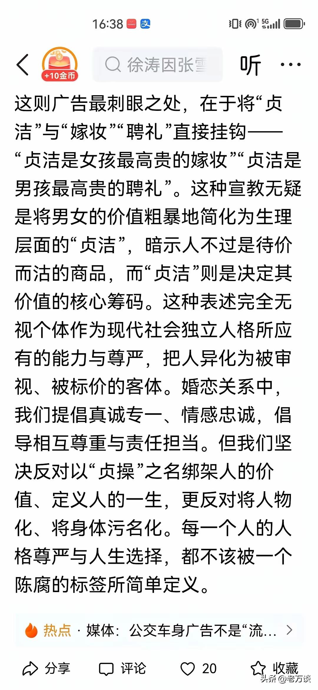 中国妇女报下场批判贞洁是女性最高贵的嫁妆的宣传广告了,给出的题目是:公交车上的“贞节牌坊”:警惕公共空间中的封建糟粕回潮。扣的帽子真不小,为什么这些媒体对这句话会有如此强烈的?反感难道真的戳到了这些媒体的痛点吗?否则为什么会表现得如此的反感 这家贴这条广告的公司不过是在提醒未婚男女要自尊自爱,一定要重视自己的婚前行为,同时也为了防止艾滋病泛滥,如此好的初衷,居然被媒体批得一无是处,封建、糟粕、牛皮癣等等。总认为贞洁是待价而沽的产品,认为这是把贞操物质化,为什么会有这种想法呢?难道自尊自爱不好吗?难道婚前性泛滥才是这个社会的主流嘛?为什么媒体这么不待见贞操呢?贞操呢?