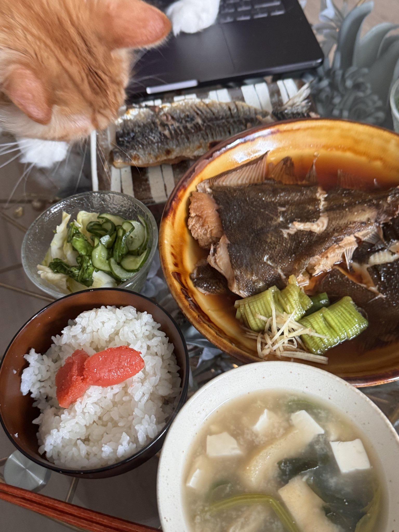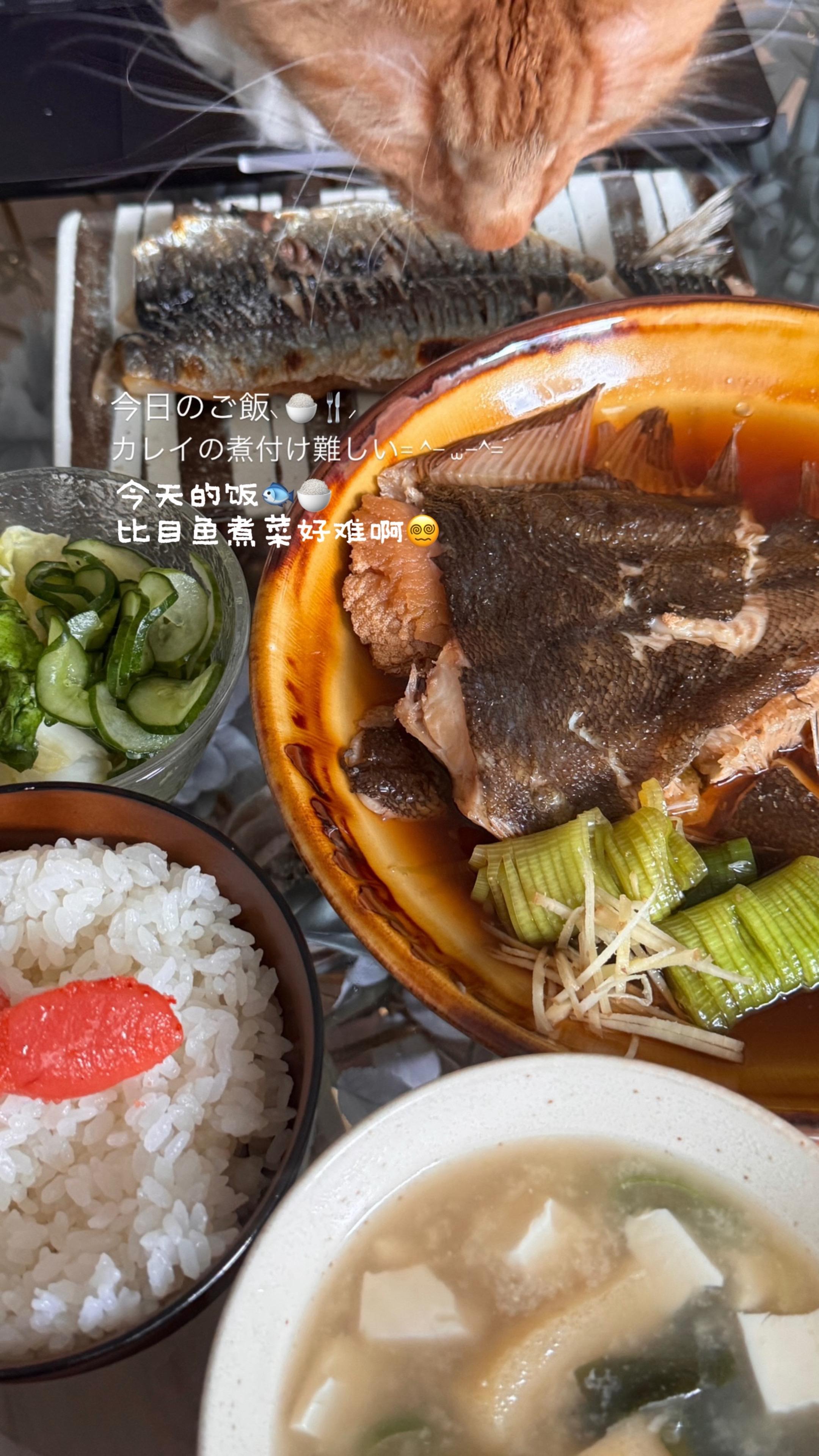 今日餐食⸜ 🍚🍴⸝。第一次做了煮比目鱼! 从现在开始要学会做各种鱼...