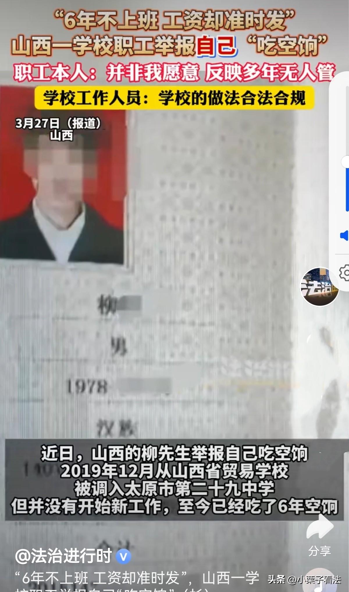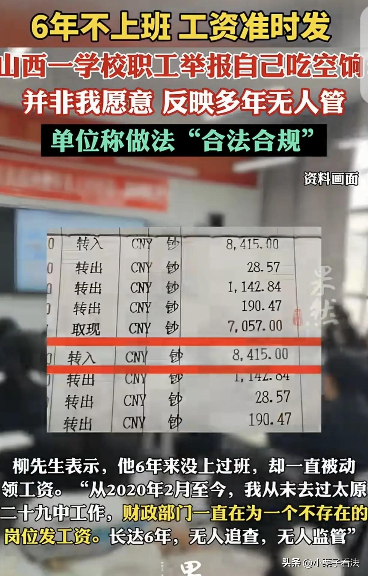 置之死地而后生?山西太原,男子在原单位被调入一所中学入职,只工作了一个月,他就发现调动手续漏洞百出,他不想趟这趟浑水,要求返回原单位。谁知原单位回不去,他一气之下拒绝去新单位工作。这事一拖就是6年未上班,工资却一直发,期间他反映多年无人管。他认为自己被动吃空饷是侵占,涉嫌犯罪,于是,一狠心将自己举报了!网友:这是36计的哪一计? 柳先生做了一件在外人看来难以理解的事。整整6年,他没去新单位上过一天班,工资却按月打进卡里,这笔钱拿着如坐针毡! 走投无路之下,他只能选择自我揭发,6年“被动吃空饷”,主动举报自己,背后满是无奈! 事情要从2019年年底说起,当时柳先生从原来的工作单位,被调动到太原当地一所中学。 原本以为是正常的工作调动,他满心欢喜去新单位报到,还踏踏实实上了一个月的班。 可越做心里越犯嘀咕,仔细核对调动手续后,他惊出一身冷汗,发现这次调动满是漏洞。 先是关键的调动审批表,本该由调出地人社部门盖章的地方,居然一片空白,连个公章影子都没有。 再看审批时间,更是离谱至极,上级部门的批准日期,比申请单位提交请示的时间还早了十几天。 完全违背了先申请、后审批的正常流程,明眼人都能看出不对劲。 除此之外,他的岗位职级也被弄错,原本的专业技术岗位级别,硬生生被改成了普通科员级别,这些明显的违规之处,让柳先生心里彻底没了底。 “这调动根本不合规矩,我不能在这待着。”发现问题后,柳先生一心想回到原来的学校工作。 他本以为只要说明情况,就能顺利退回原单位,谁知,原单位回不去了,他一气之下没再去新单位上班,这一折腾,就是整整6年。 这6年里,柳先生过上了一种无比煎熬的生活。 他没去单位上过一天班,可每个月到了发薪日,财政发放的工资总会准时到账。 看着银行卡里的钱,他没有丝毫开心,反而满是惶恐,这不是他辛苦劳动所得,是明摆着的“空饷”,他是被动卷入其中的。 《刑法》第382条:工作人员利用职务上的便利,侵吞、窃取、骗取或者以其他手段非法占有公共财物的,是贪污罪。 《刑法》第271条:公司、企业或者其他单位的工作人员,利用职务上的便利,将本单位财物非法占为己有…数额巨大的,处3年以上10年以下有期徒刑,并处罚金… 他心里清楚,长期这样下去,迟早要触犯法律,说不定会背上职务侵占、贪污的罪名,到时候百口莫辩。 为了摆脱这个困境,柳先生跑断了腿、操碎了心。 他一次次找相关部门反映情况,递材料、说问题,可得到的回应要么是互相推诿,要么是石沉大海。 无奈之下,他还把相关部门告上了法庭,也向纪委举报了自己吃空饷的事,能走的途径几乎都走了一遍。 可除了偶尔有人出面安抚,帮着解决一点基本的生活困难,关于违规调动的核心问题,始终没有任何部门给出明确的解决方案。 他就像个皮球,被踢来踢去,看不到一点希望。 6年时间,两千多个日夜,柳先生每天都活在担忧和焦虑里。 这笔来路不正的工资,成了压在他心头的一块大石头,他不想稀里糊涂地违法,更不想因为这笔钱毁了自己的一辈子。 面对别人的疑问,他坦言自己主动举报,就是怕时间越拖越久,罪责越来越重。 “这些钱本来就不是我的,国家要收回,我毫无怨言”,他只想要一个清白,想要这件荒唐的事有个最终的了断。 其实,涉事学校也曾承认,在柳先生的调动事宜上,工作做得不够细致,考虑也不周全,还曾发函希望把他调回原单位,可不知为何,这件事一直没能落实。 随着柳先生自我举报的事情被曝光,相关部门也做出了回应。 涉事学校工作人员面对采访,只坚称学校的做法合规合法,不愿再多说其他。 当地教育主管部门则表示,已知晓此事,目前正在处理当中。 有人说,刘先生聪明,这是以退为进,这玩意儿是颗雷,啥时候爆了就得踩缝纫机! 有人质疑:嘴上说的不愿意违法,可是每个月都按时把工资领走,说着不愿意违法,其实一直在违法。钱也领了名也落了,真是打着一副好算盘! 一场漏洞百出的违规调动,让一个普通人陷入了6年的被动困境,自己举报自己,听起来荒诞,背后却是满满的无奈。 如今,大家都在等待一个公正的处理结果,不仅是给柳先生一个交代。 更是要查清这6年无人监管、无人追责的背后,到底藏着怎样的问题,给公众一个明明白白的答复。 对此您怎么看?