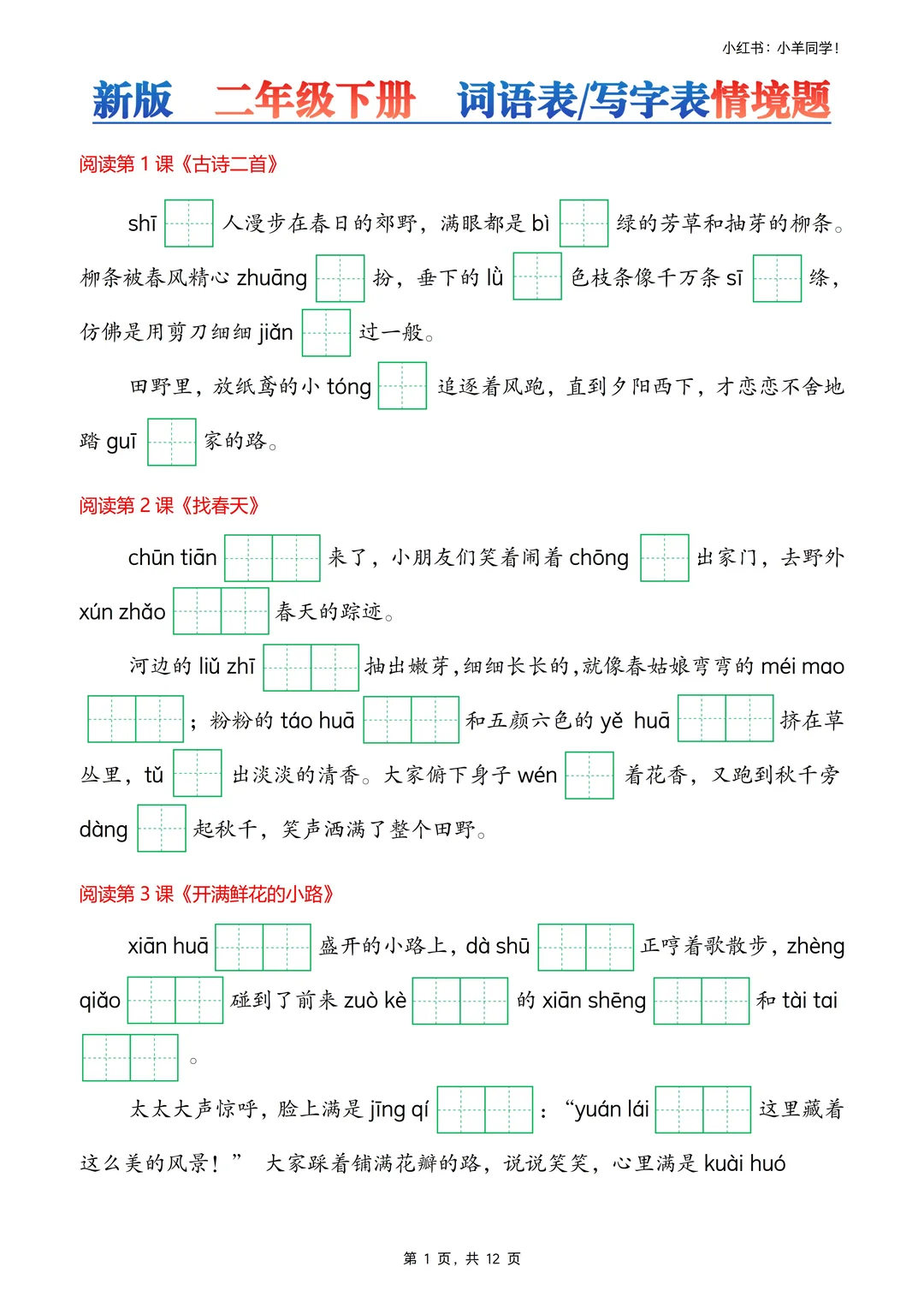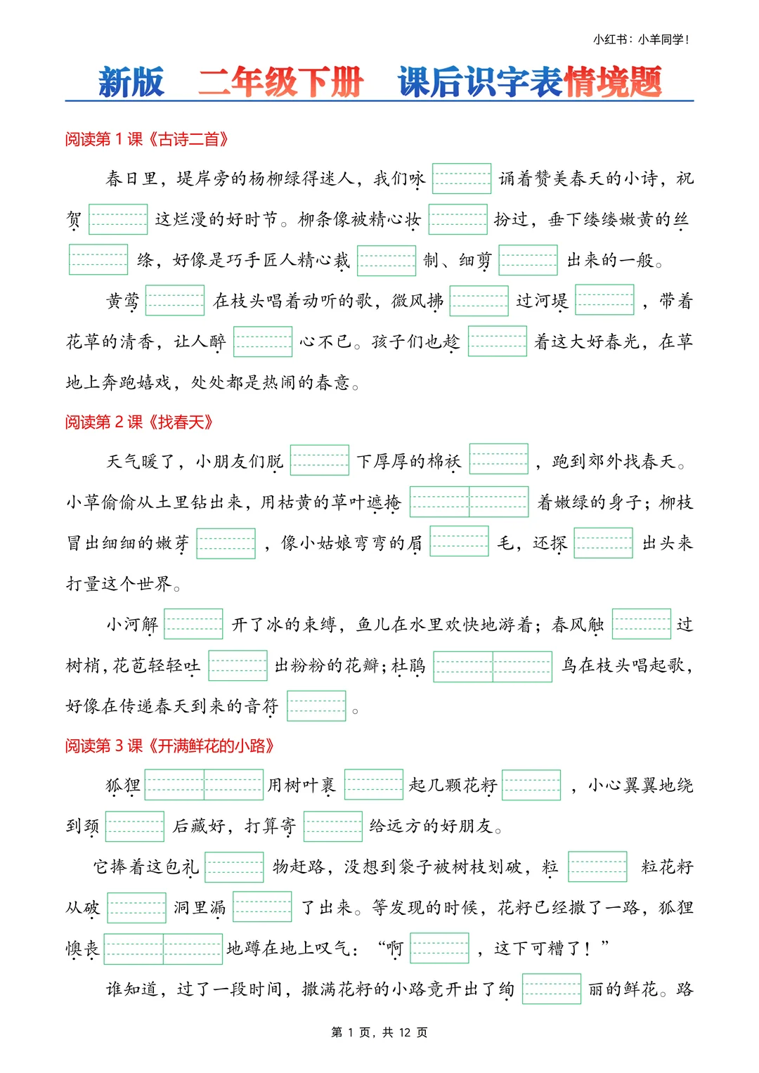 📄考试再也不是简简单单的看拼音写词语啦,都是情景题,这份就是结合课后识字表+写字表+词语表整理的一份“情境”挖空练习题。“大语文”考试方向的必kao题型。
