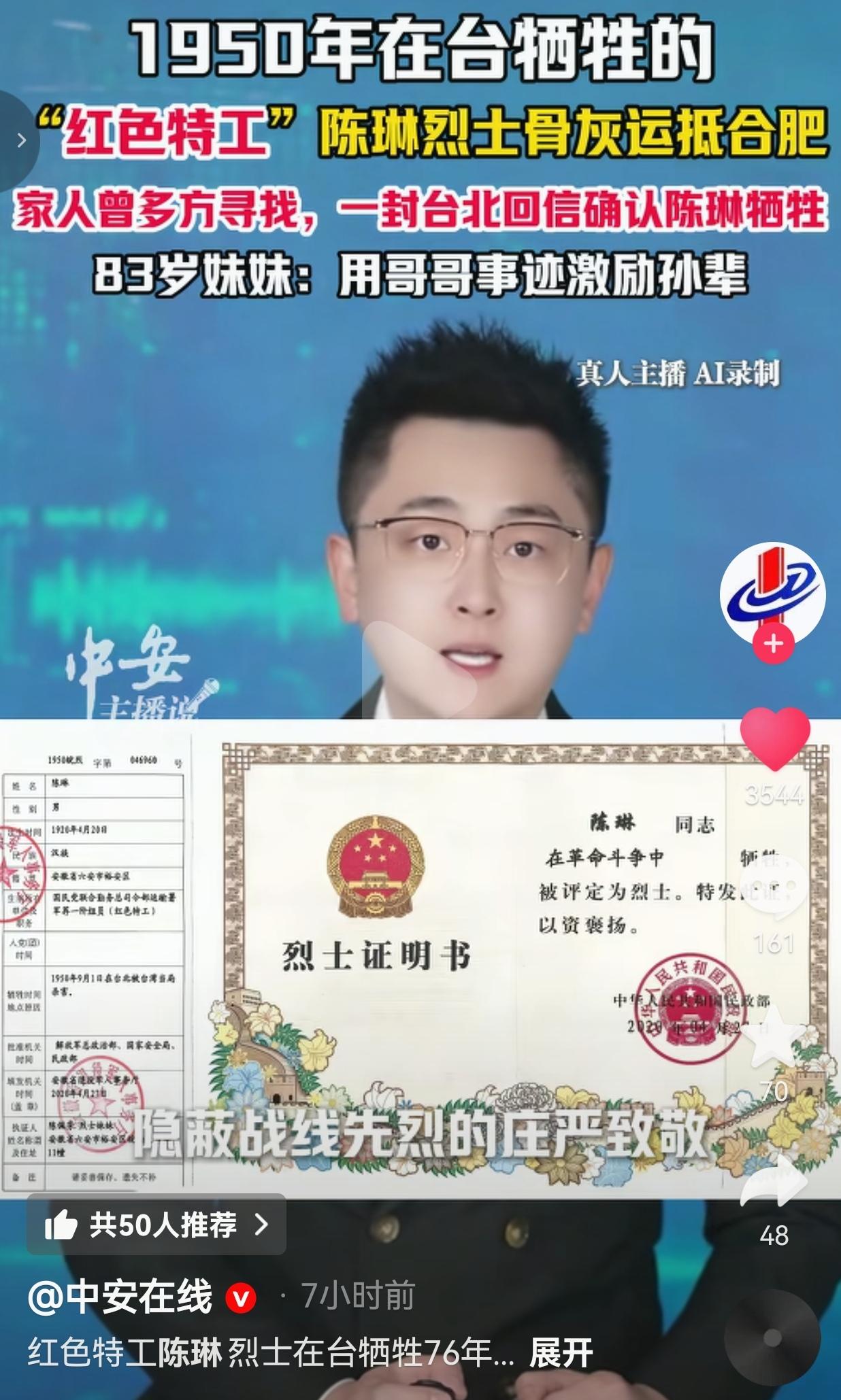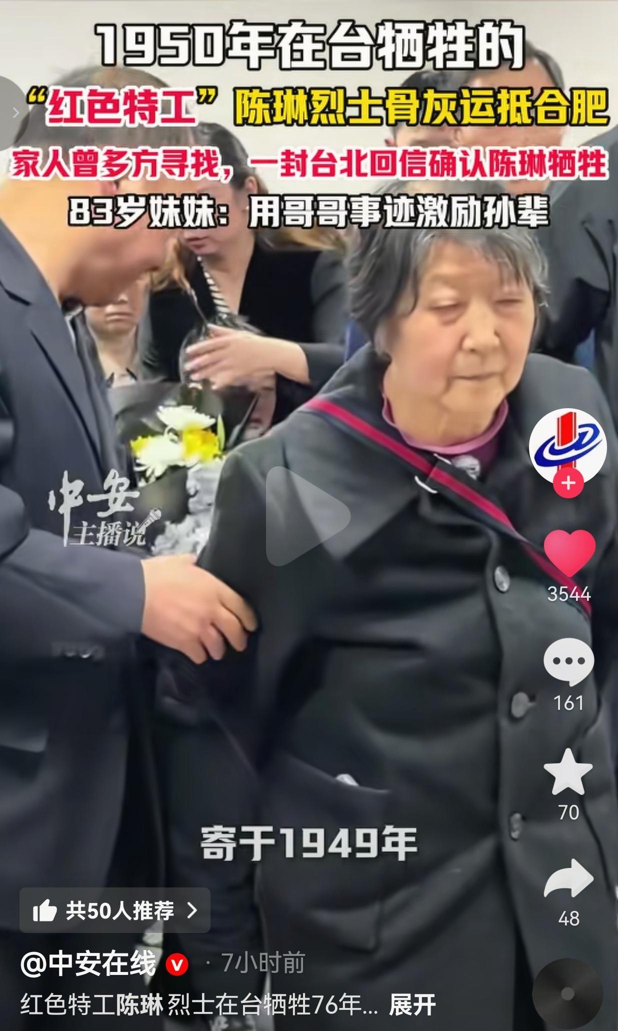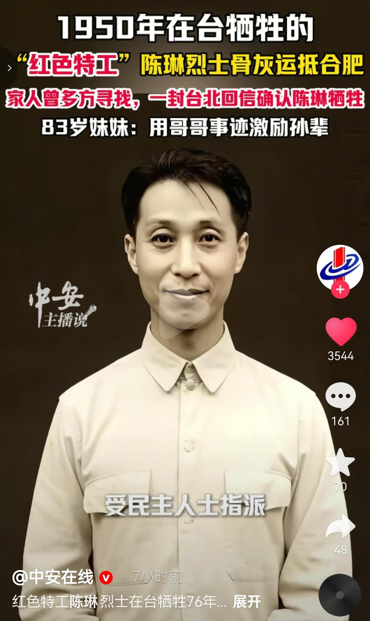 看哭了!30岁就义,76年等待!陈琳烈士终于魂归故里,这一幕看哭全网! 3月27日,安徽合肥机场,一个黑色背包被紧紧抱在怀里——里面装的是1950年在台湾牺牲的红色特工陈琳的骨灰。 76年了,这个30岁就慷慨就义的安徽汉子,终于踏上了回家的旅程。 1949年,陈琳受民主人士指派,以国民党联合勤务总司令部运输署军阶一等组员的身份,肩负隐蔽战线的使命赴台工作。 他给家里写的最后一封家书里,只轻描淡写说“出趟远差”,谁也不知道这趟“差”,是一条再也回不来的绝路。 1950年9月1日,他在台北被台湾当局杀害,敌人给他挂上“叛乱犯陈琳”的牌子,拍下那张让人心碎的照片时,他才30岁。 此后几十年,家人多方寻找他的下落,直到一封来自台北的回信,才确认了他早已牺牲的消息。 2020年,民政部正式颁发《烈士证明书》,白纸黑字写着:“陈琳同志在革命斗争中牺牲,被评定为烈士”,这张迟来的证书,终于洗清了他身上的污名,告慰了英灵。 83岁的妹妹陈佩芳,从青丝等到白发,今天终于在合肥见到了哥哥的骨灰,她抹着眼泪说:“我要把哥哥的故事讲给孙辈听,让他们知道,我们家有个英雄。” 网友看到后评论说:“看哭了!30岁啊,正是最好的年纪,为了国家把命都搭上了,这才是真正的民族脊梁!” 也有的网友说:“以前只在课本里见过隐蔽战线的英雄,今天才知道他们的故事这么痛,陈琳烈士,一路走好!” 还有的网友说:“欢迎英雄回家!我们合肥的好儿郎,76年了,终于魂归故土了!” 也有的网友说:“哪有什么岁月静好,是这些无名英雄替我们挡在了黑暗里,向陈琳烈士致敬!” 我看完这段视频,鼻子酸得直掉眼泪。这哪里是“出趟远差”,这是明知必死仍要向前的决绝!敌人给他挂上“叛乱犯”的牌子,可在我们心里,他是为了民族解放抛头颅洒热血的英雄。 那张迟来的《烈士证明书》,不仅是对陈琳个人的正名,更是对所有隐姓埋名、以身许国的隐蔽战线先烈最庄严的致敬! 他才30岁啊,本该有妻儿绕膝,本该看着新中国一步步变好,可他选择了把自己埋在台湾的土地上,把名字藏在隐蔽战线的迷雾里。 76年的等待,83岁妹妹的眼泪,那张盖着国徽的烈士证,都在告诉我们:英雄从不会被遗忘,哪怕过了再久,我们也要接他回家。 那些在隐蔽战线上无名无姓的英雄,他们没有勋章,没有墓碑,甚至连名字都曾被污名化,但他们用生命换来了我们今天的和平与安宁。他们才是这个民族最闪亮的星,最值得我们永远铭记的人! 76年山河无恙,英雄终归故乡!这世上从没有天生的勇士,只有为了信仰甘愿赴死的凡人——陈琳烈士,您的名字,我们永远记得!