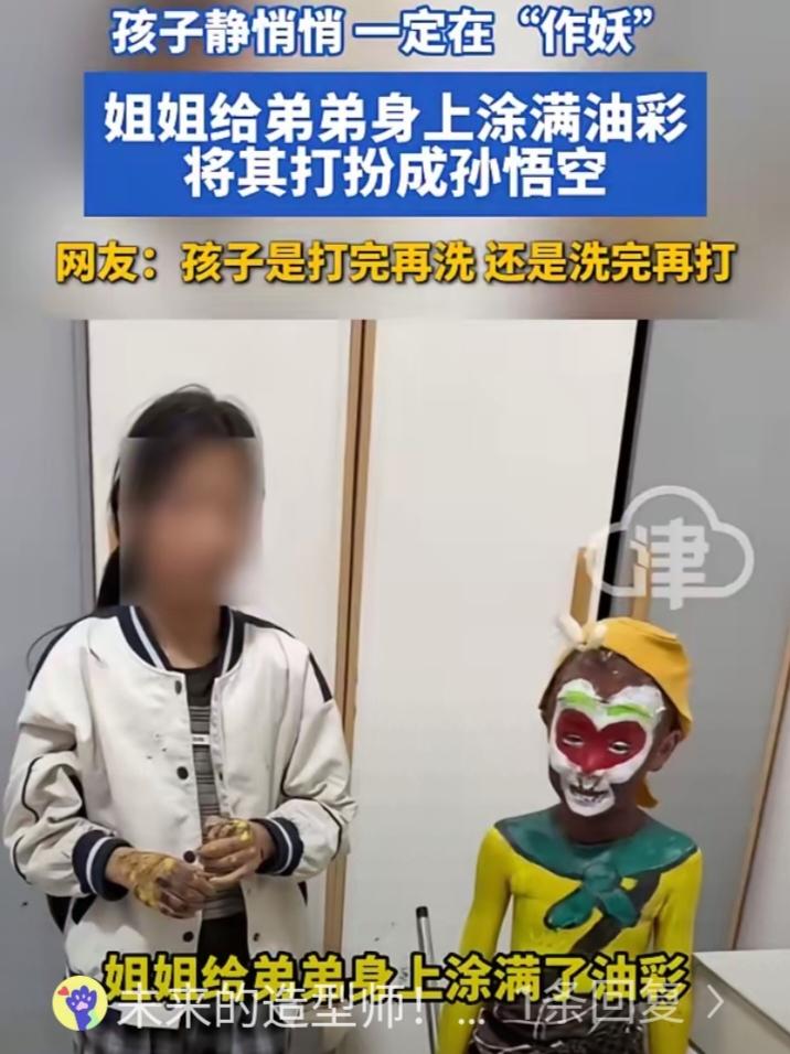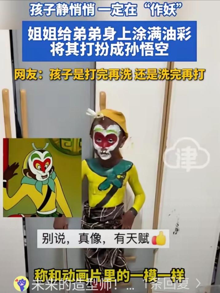 笑不活了!山东,一位妈妈下班回到家,发现家里两个孩子静悄悄的,等进屋一看,发现姐姐竟然把油彩涂到了弟弟身上,把他装扮成孙悟空的模样,而且像模像样,但看到一地的涂料,妈妈却瞬间上头了:小孩静悄悄,一定在"作妖"。 当天妈妈回到家,推开门,家里静悄悄的。两个孩子,一个七岁,一个四岁,平常这个点早就闹翻天了,今天居然一点动静都没有。这位妈妈当时就觉得不太对劲。 果然,走进客厅一看,场面直接让她血压拉满。地上全是油彩,红的黄的绿的,瓷砖都快看不出原来的颜色了。再往旁边一看,弟弟浑身上下被涂得满满当当,活脱脱一个孙悟空。金黄的衣服,虎皮围裙,甚至连额头上都被画上了紧箍咒,愣是整出了一套完整的猴王行头。 而姐姐正拿着画笔,认认真真地给弟弟最后收尾,一脸得意,丝毫不觉得有什么问题。妈妈看到后也是哭笑不得,开玩笑询问网友:孩子是打完再洗,还是洗完再打。 有网友表示:人才啊,这大闹天宫的扮相,完美还原cosplay。还有网友说:姐姐是老天爷赏的化妆师。这话说得确实没毛病。 七岁的孩子能把孙悟空的形象还原到这个程度,说明她是真的仔细观察过,认真琢磨过的。不是随便乱涂,而是在做一件自己觉得特别有成就感的事。 其实很多家长都有过类似的经历。回家发现墙上被画满了,面粉撒了一地,或者所有玩具都被拆得七零八落。第一反应永远是火冒三丈,但过了那个劲儿再回头看,又觉得又气又好笑,孩子就是这样长大的。 没有哪个孩子从小到大没闯过祸,没把家里折腾得乱七八糟过。翻箱倒柜、乱涂乱画、把家里造得一片狼藉,都是娃成长路上的常态。 家长们看到满地狼藉,难免会生气,毕竟收拾起来又费时间又费精力。可换个角度想,这些在大人眼里头疼不已的灾难现场,藏着的都是孩子最纯粹的快乐。姐姐用心给弟弟扮孙悟空,是满满的想象力和动手能力,弟弟乖乖配合,也是享受和姐姐玩耍的时光。 孩子的童真从来都藏在这些看似调皮的举动里,他们不懂什么是脏乱,只知道沉浸在自己的小世界里创造快乐。比起指责和生气,更难得的是看见孩子藏在调皮背后的闪光点,不扼杀他们的好奇心和创造力。毕竟童年就这么短短几年,这些让人又气又笑的瞬间,回头看都是珍贵的回忆。 各位读者你们怎么看?欢迎在评论区讨论。