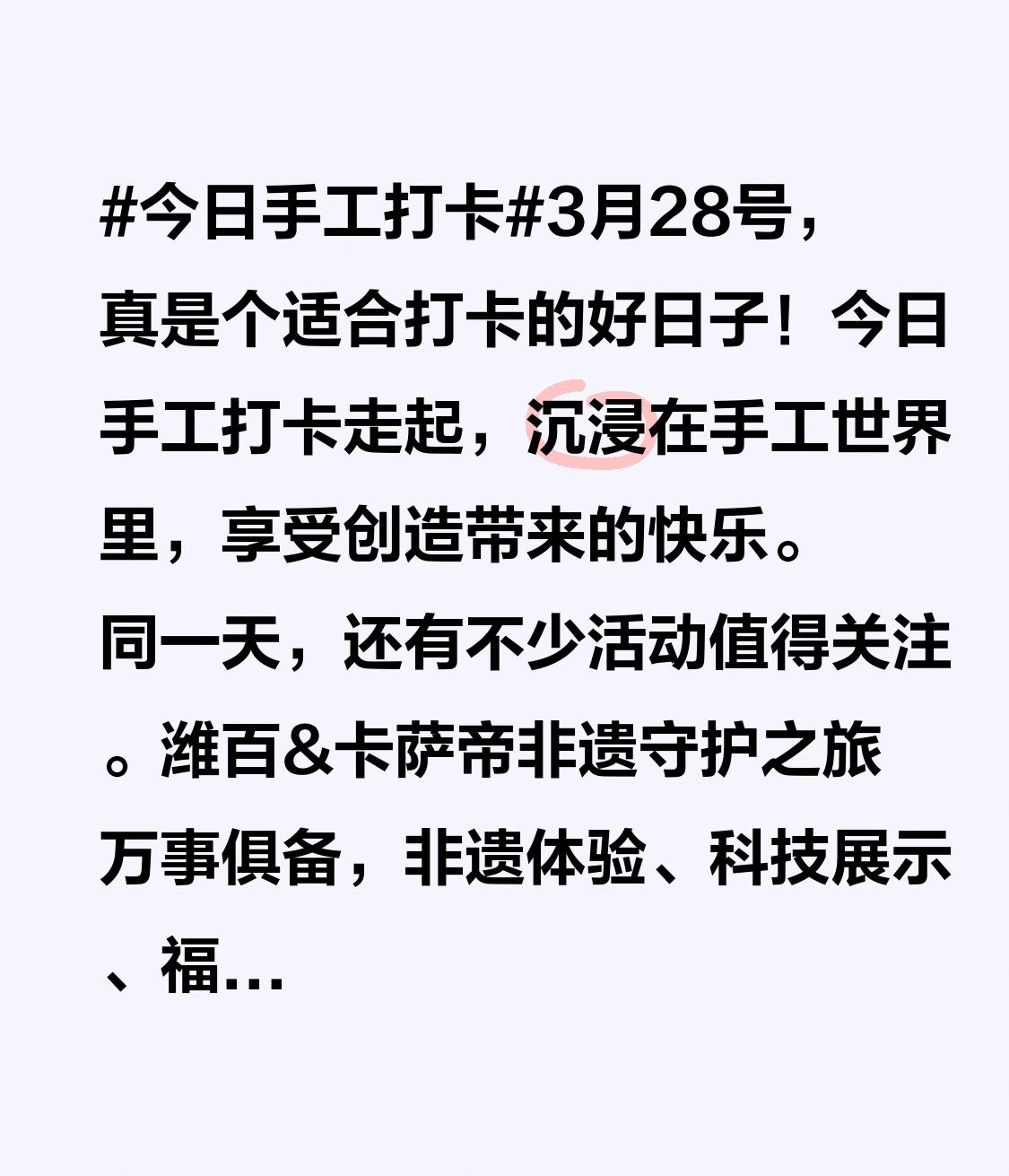 同一天,还有不少活动值得关注。潍百&卡萨帝非遗守护之旅万事俱备,非遗体验、科技展示、福利互动等区域已布置好,能让人共赏千年非遗,体验高端AI科技。佘山兰笋文化季也在这天启幕,有寻亭记打卡活动,完成打卡能抽神秘好礼,开幕式还有可爱的NPC互动。此外,还能去佘山体验挖笋,品尝“东笋西厨”的创意笋肴。这一天,手工打卡快乐加倍,活动也丰富多彩!