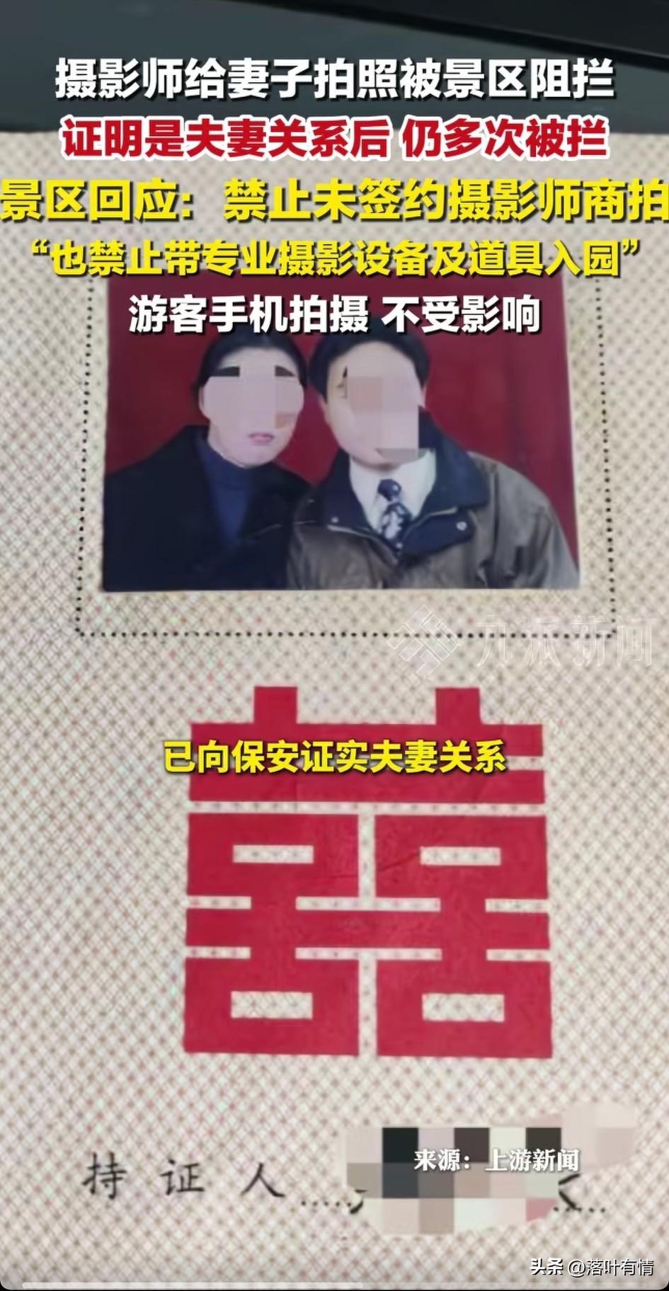 大家都知道开封万岁山比较火, 近日,万岁山发生了大新闻, 一名摄影师给穿古装的妻子拍照, 被里面的保安劝返了三次, 第一次劝他的时候, 他已经证明了这是他的媳妇儿, 结果还没有拍多久, 又来了第二波,第三波保安, 保安提醒他禁止商业拍摄, 他表明这是他的妻子, 但是保安根本不听, 直接告诉他,让他看园区的规定, 摄影师很生气的,把精力放在了网上, 记者采访了景区工作人员, 园区的工作人员告诉他们, 万岁山为了给游客更好的游玩体验, 禁止未签约的专业摄影师进行商拍, 包括禁止携带专业拍摄设备进入, 言外之意就是给你媳妇儿拍也不行, 如果用普通手机拍摄没有关系, 但是一旦拿着专业设备进入拍摄, 就是违反园区的规定, 大家觉得万岁山这个规定合理吗? 万岁山开封 万岁山旅游公司 再游万岁山 万岁山影视街 万岁山旅游广告