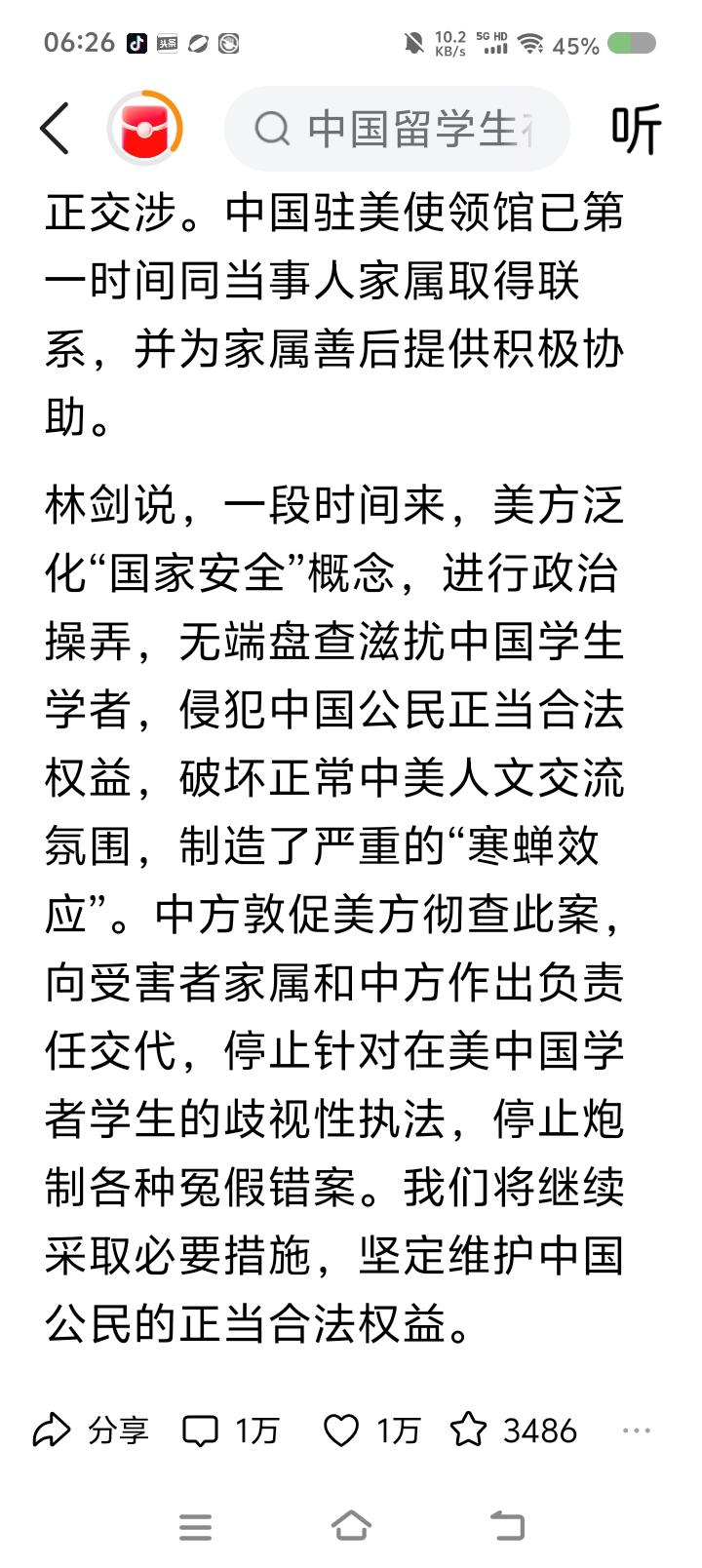 中国博士后在美国遭执法人员盘问后自杀—— 据报道,近日,我国一名博士后,在美国遭执法人员约谈盘问,次日自杀。 有记者问我外交部发言人对此事看法。发言人说:“深感痛心。美国无端盘查滋扰我国学生学者,侵犯其合法权益,制造‘寒蝉效应’,中国敦促美国彻查此案,停止歧视性执法……” 点评: 发言人的话表明了此案的性质:美国政府的系统性的迫害导致的中国公民非正常死亡。 如何减少和防范此类悲剧? 一、要求美国严惩违法操作人员。 二、支持我国在外人员成立维权联盟,在法律框架内开展斗争。 三、加强中国使领馆警戒力量。任何对中国公民的袭击和威胁,中国外交人员应强势回应。 四、及时发布中国人赴外留学、旅游、投资警告。
