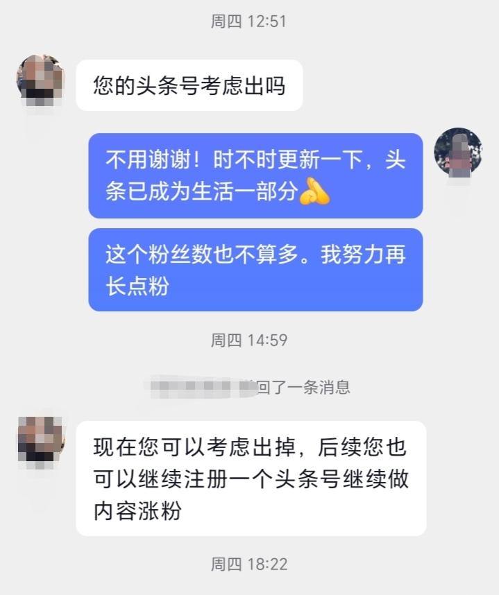 头条账号还能出让吗? 这几天有人私信我,问我要不要转让头条账号。她说可以把这个账号转让出去,然后让我重新再注册一个新号。 我的头条账号平时不怎么活跃,很少有爆款文章,阅读量也一般,但我是不会转让的。其一,小编有正经工作,不靠网络维持生计。其二,头条已成为我日常生活的一部分。这个账号从2021年9月开始注册至今,陪伴我快5年了,我当然舍不得放弃了。 工作之余刷刷头条,看这世间百态,风云变幻。不忙的时候,不管有没有看,都会更新一下。火不火都在其次。朋友们,你们觉得呢?