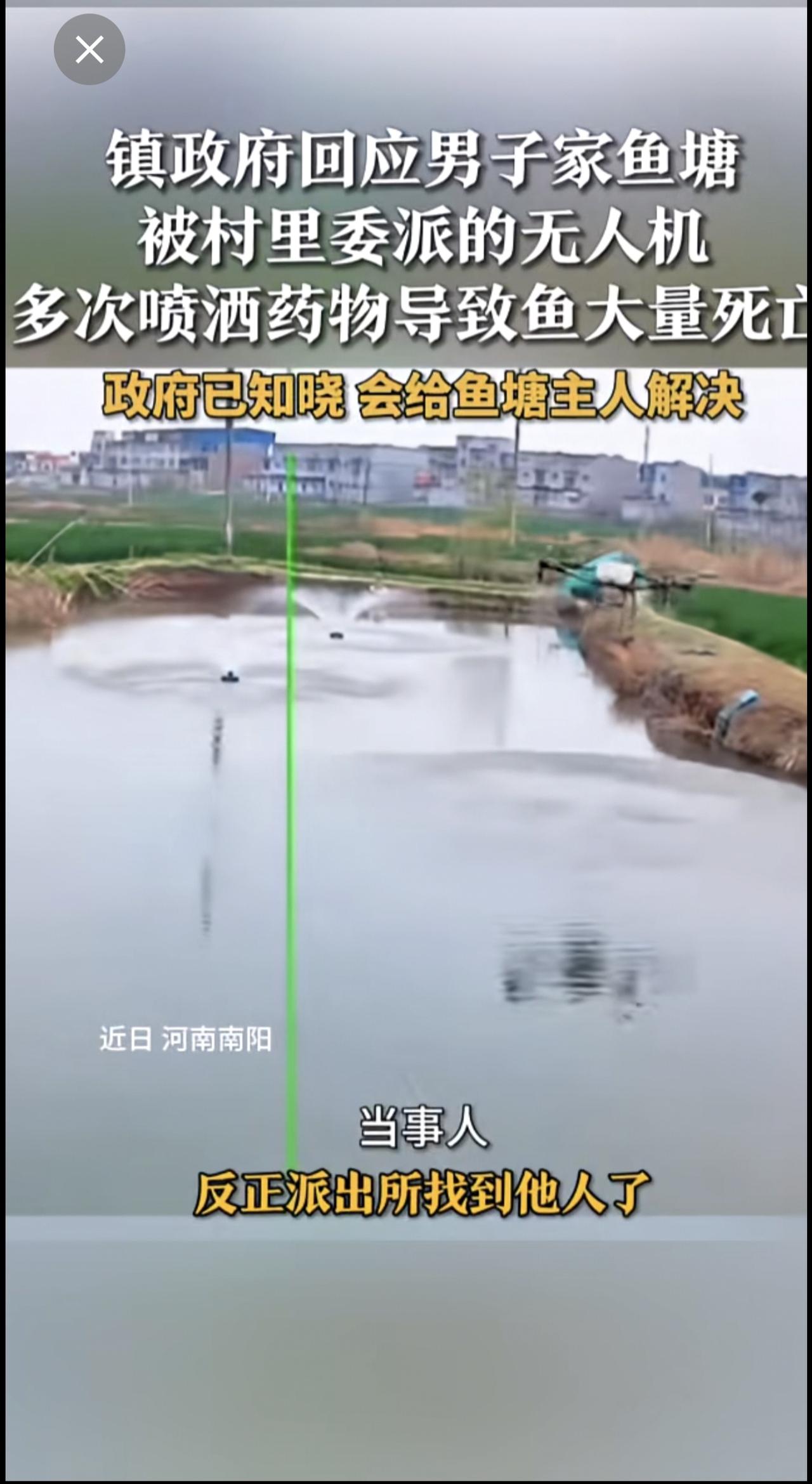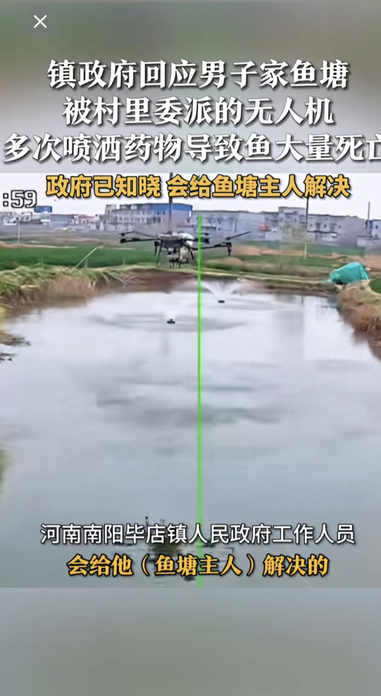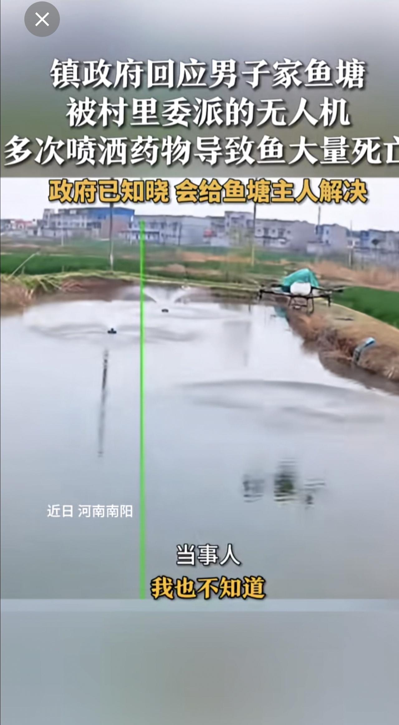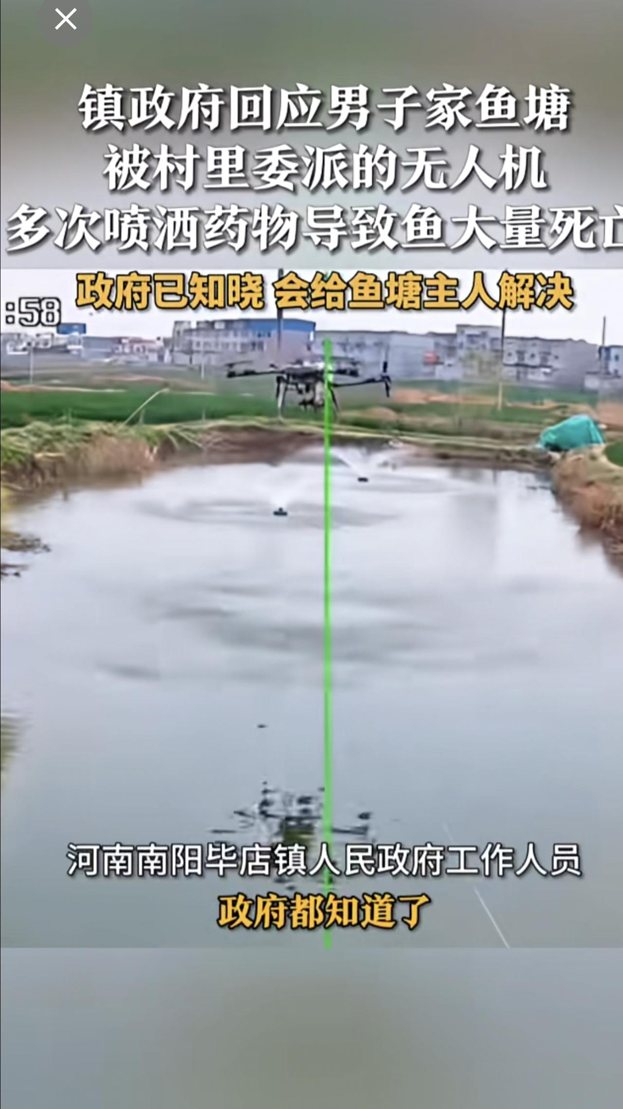 近日,河南南阳。男子家鱼塘被村里委派的无人机多次喷洒药物导致鱼大量死亡。当地镇政府回应已知晓,会给鱼塘主人解决。(来源:荔枝新闻)