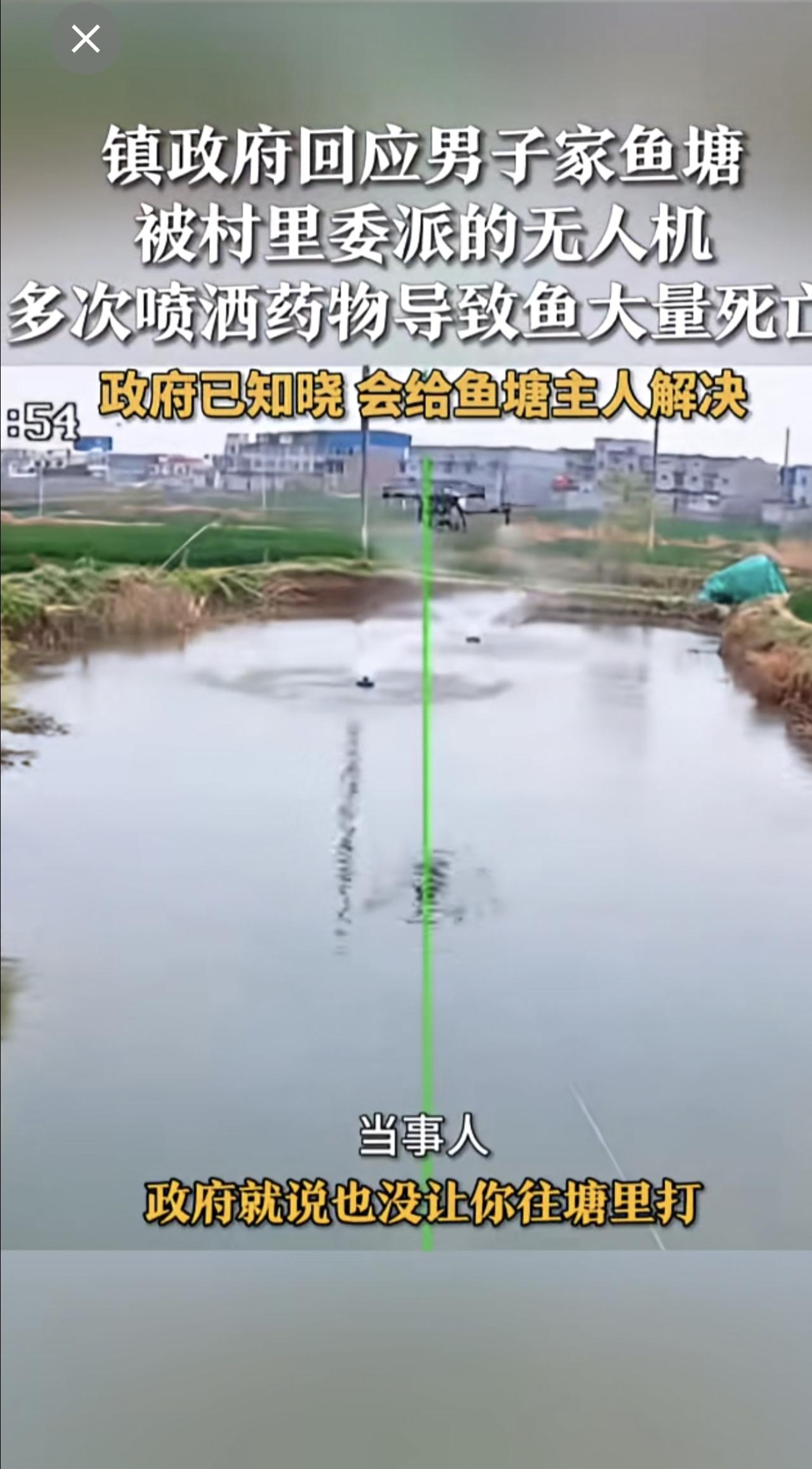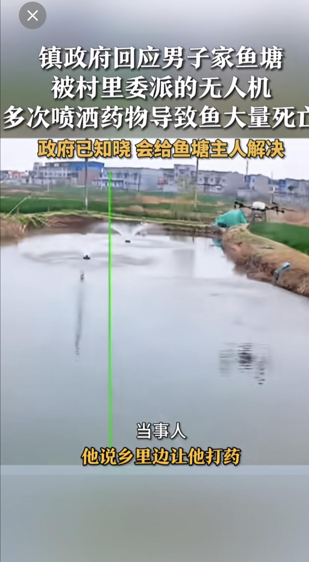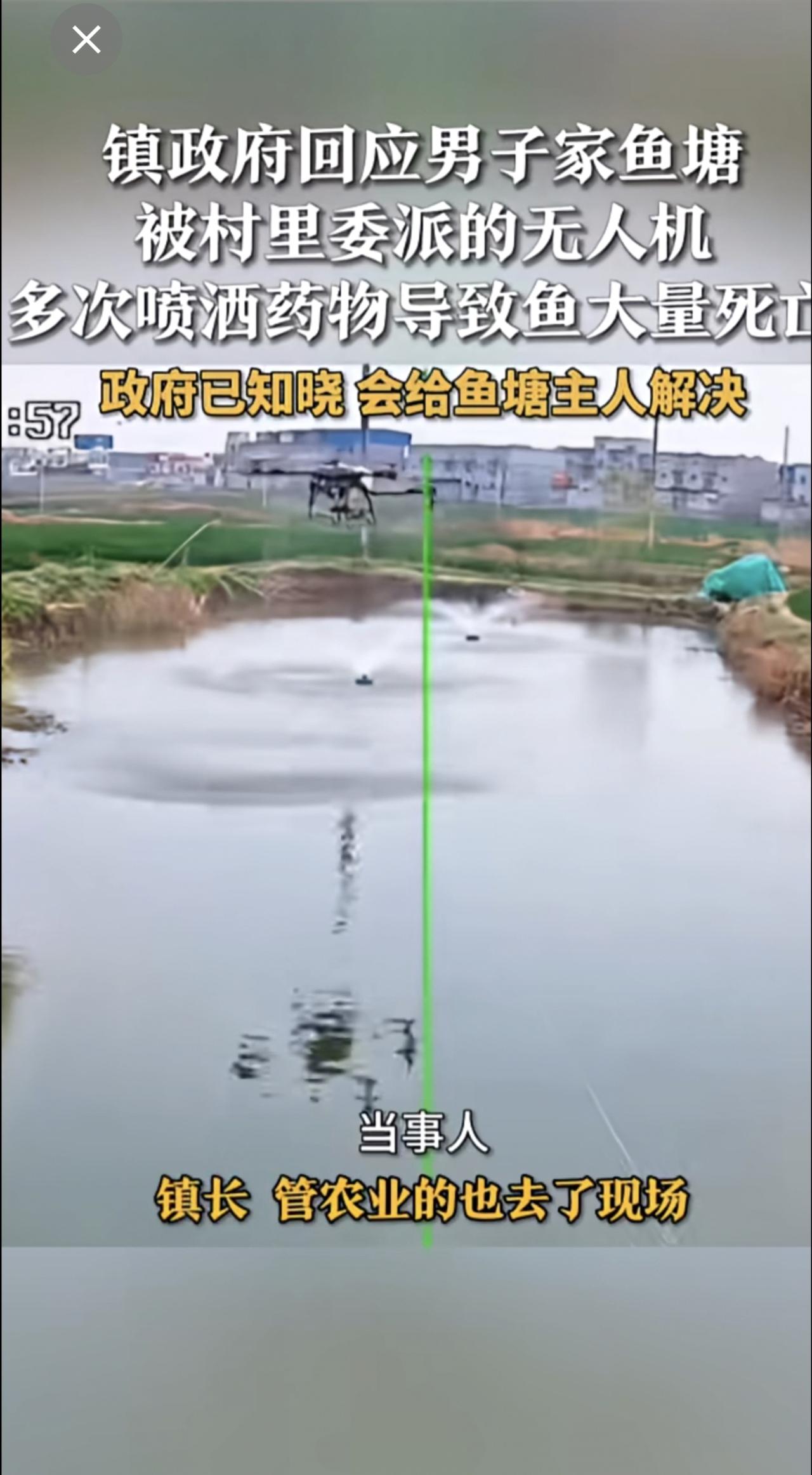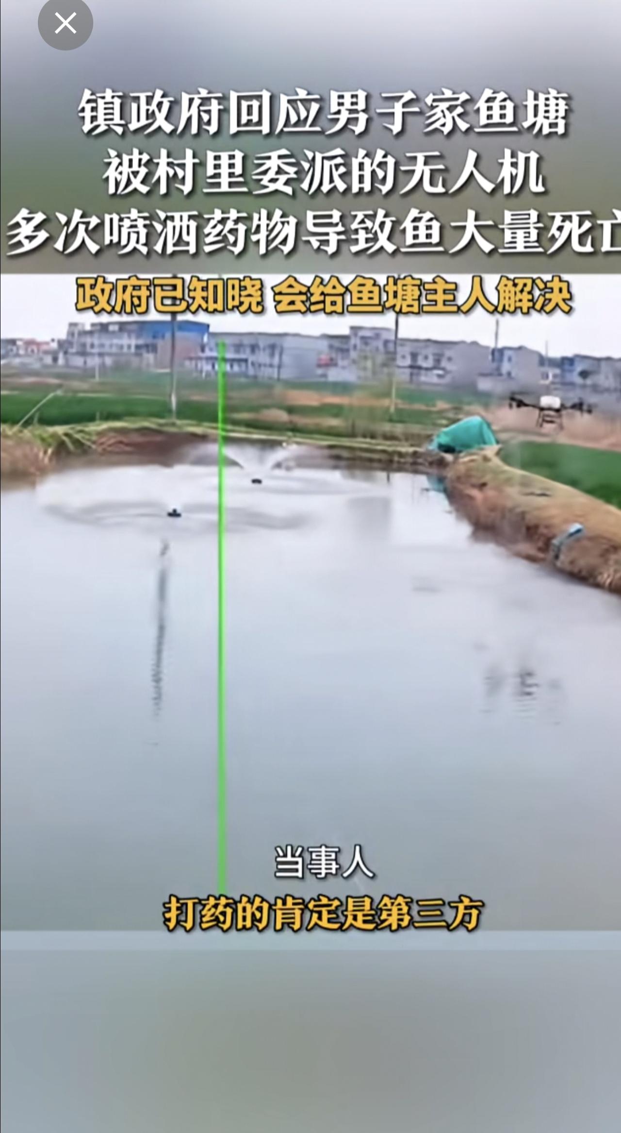 近日,河南南阳。男子家鱼塘被村里委派的无人机多次喷洒药物导致鱼大量死亡。当地镇政府回应已知晓,会给鱼塘主人解决。(来源:荔枝新闻)