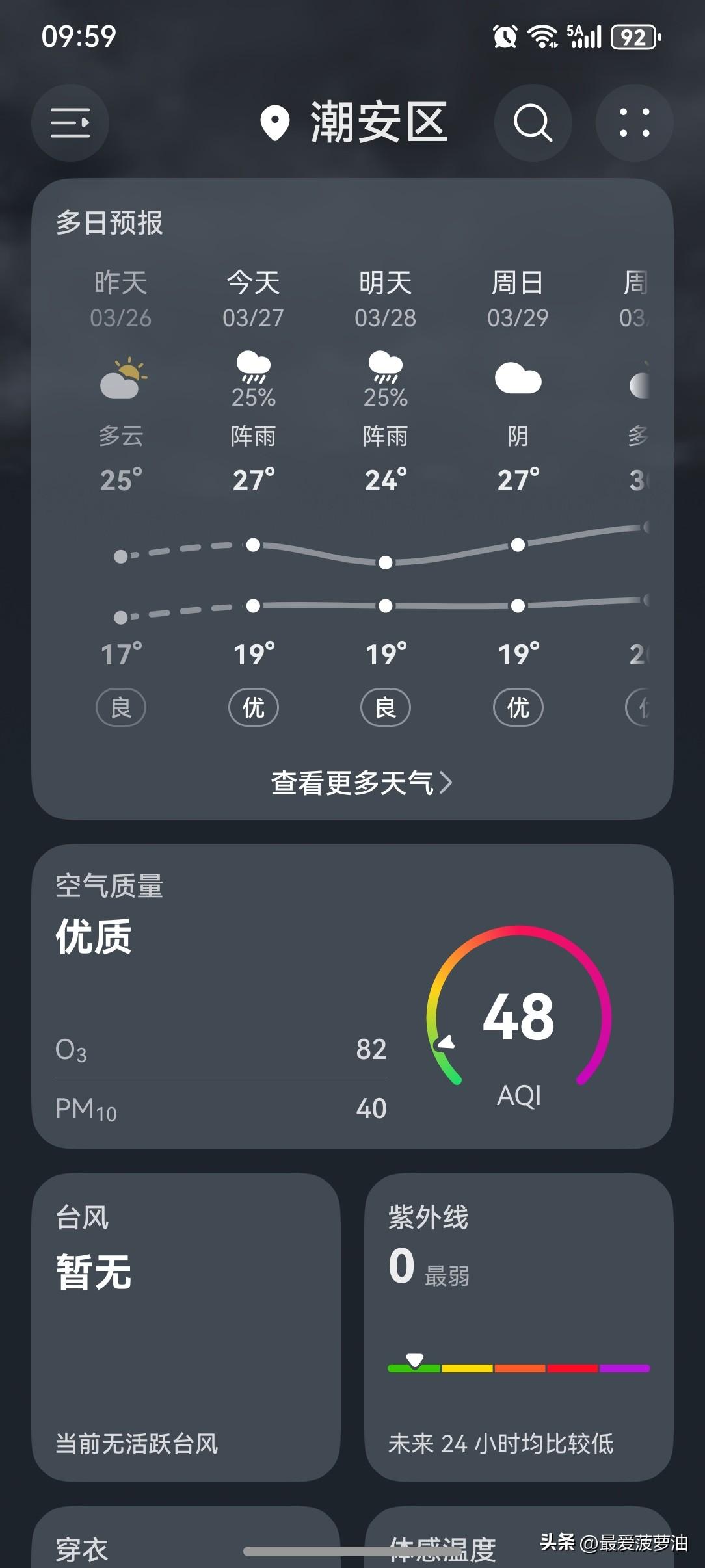 今天(28日),潮州喜提一个雷阵雨转阴天,气温18~27℃,此刻气温20℃,体感温度20℃。