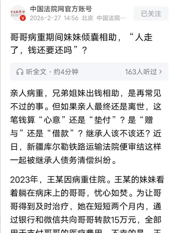 新疆库尔勒暖心姑姑倾家荡产15万救兄,一年后反遭亲侄子冷血赖账:一句客套话竟成白眼狼的免死金牌?法院判决大快人心! 医院的走廊冰冷刺骨,消毒水的气味钻进鼻腔。王燕攥着缴费单,手指关节捏得发白。卡里最后一笔钱转出去的时候,她没犹豫——那是她起早贪黑、从牙缝里省出的养老钱,整整十五万。病床上躺着的是她从小护着她的哥哥,她不能眼睁睁看着他被死神拖走。 钱像流水一样花出去,希望却像指缝里的沙一样溜走。一年后,哥哥还是走了。悲痛尚未平息,现实的冰水便兜头浇下。王燕找到刚继承父亲房产和存款的侄子,只想商量拿回垫付的救命钱。她甚至没想要利息,只求本金。 侄子的反应却让她如坠冰窟。那个她看着长大的孩子,此刻满脸不耐与算计:“姑姑,你转账时说的‘兄妹之间客气啥’,聊天记录白纸黑字,这分明就是赠与!哪有送出去的钱还要回去的道理?”温情脉脉的安慰话,成了对方抵赖的“铁证”。王燕的心,那一刻比库尔勒冬天的风更凉。 亲情在巨额医药费面前,迎来最残酷的试炼。侄子紧紧抱着继承的遗产,却对姑姑掏空的积蓄视而不见。他理直气壮地享受着“赠与”带来的利益,却忘了这份“赠与”背后,是一个妹妹砸锅卖铁、近乎本能的拯救。这不是慷慨,这是倾其所有的救急! 法律没有让善良的人绝望。法庭之上,法官的目光如炬,穿透了亲情包裹下的算计。判决书明确指出:巨额款项往来,不能仅凭几句日常客套就定性为无偿赠与。王燕在其他记录中“报销后还我”的表述,才是真实意图。最终,法院判决侄子小王在继承遗产范围内,偿还姑姑十五万元。 这场官司,赢回的不仅仅是钱。它捍卫了一个朴素的道理:情分是情分,本金是本金。我们不能用“一家人”的道德高帽,去绑架另一个人的毕生积蓄。姑姑的付出源于爱,但这份爱不该成为被索取的软肋。侄子的行为,则赤裸裸展现了人性中“忘恩”与“利己”的阴暗面——接受帮助时觉得理所应当,需要回报时便搬出“亲情”当挡箭牌。 这个故事之所以引发全网愤慨,是因为它戳中了人们心中最深的恐惧:我们害怕自己拼尽全力的雪中送炭,在别人眼里只是廉价的锦上添花;我们害怕血脉至亲,在利益面前会毫不犹豫地选择算计。法院的判决,不仅给了王燕一个公道,更是给所有善良的人一颗定心丸:你的善意,法律为你护航;你的付出,不应被亲情绑架。 洵哥认为:从此,库尔勒少了一门亲戚,多了一个令人唏嘘的故事。十五万,照见了生死关头的手足情深,也照见了利益面前的亲情崩塌。它提醒我们,善良必须带有清醒的边界,否则,暖了别人的炕,可能凉透了自己的心。 人性与金钱 亲情考验 法律守护善良 (来源:中国法院网官方帐号、洵哥根据新疆库尔勒地区真实民事纠纷案例及网络热议事件综合撰写)