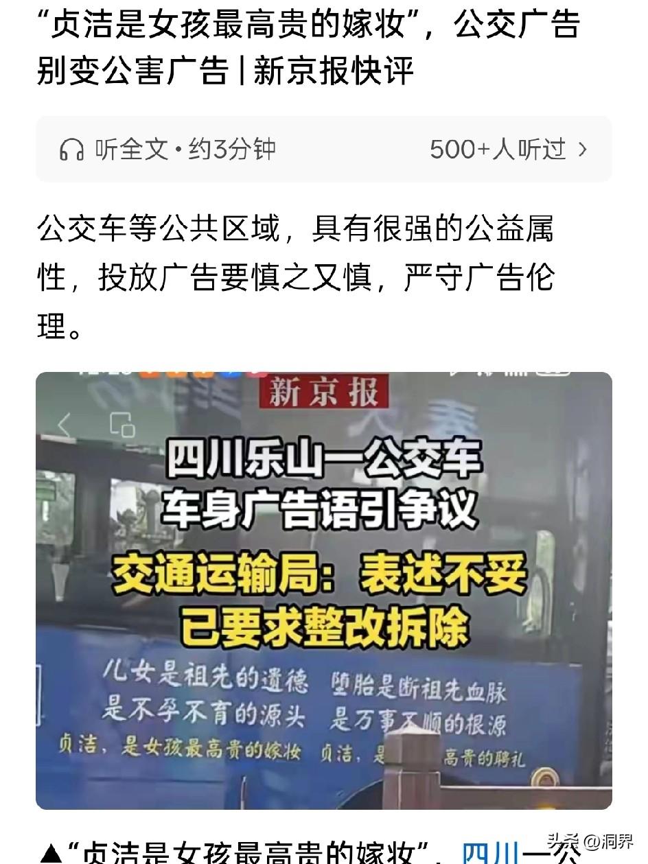 你们觉得公交车的这广告有问题吗? 为什么那么多人批评媒体,支持这样的宣语?个人觉得,我们崇尚道德,但不能绑架道德,更不能在公众场合下用如此粗俗的话语。 公交公司的这种标语,固然是不对的,言语里充满了极端和偏激,把“贞洁”作为观人待物的唯一标准,明显是有意挑起对立面和矛盾。 也不知道当地zf工作人员是怎么想的?思想如此简单,行为如此粗鲁,就这水平怎么也配当人民的公仆?