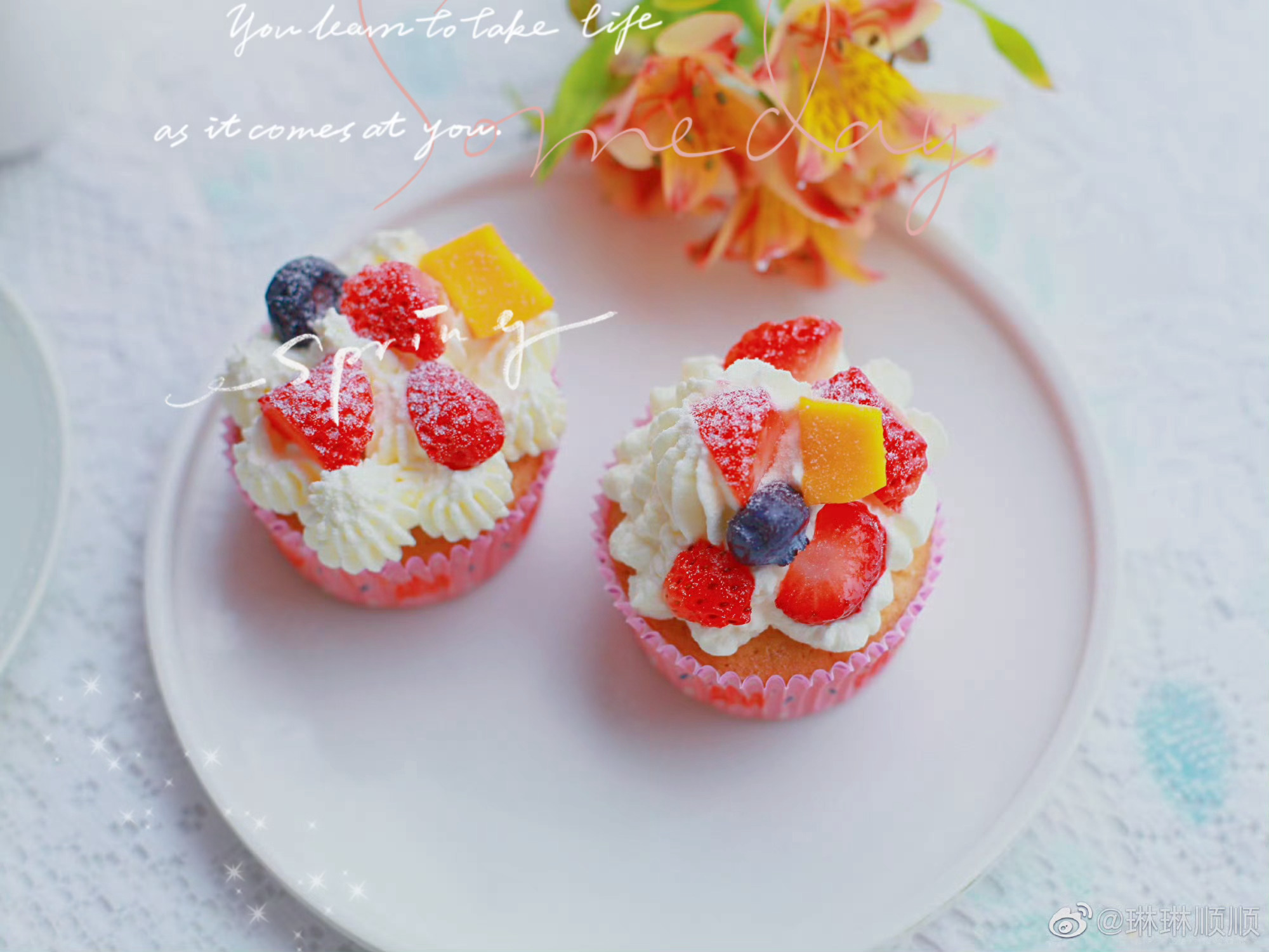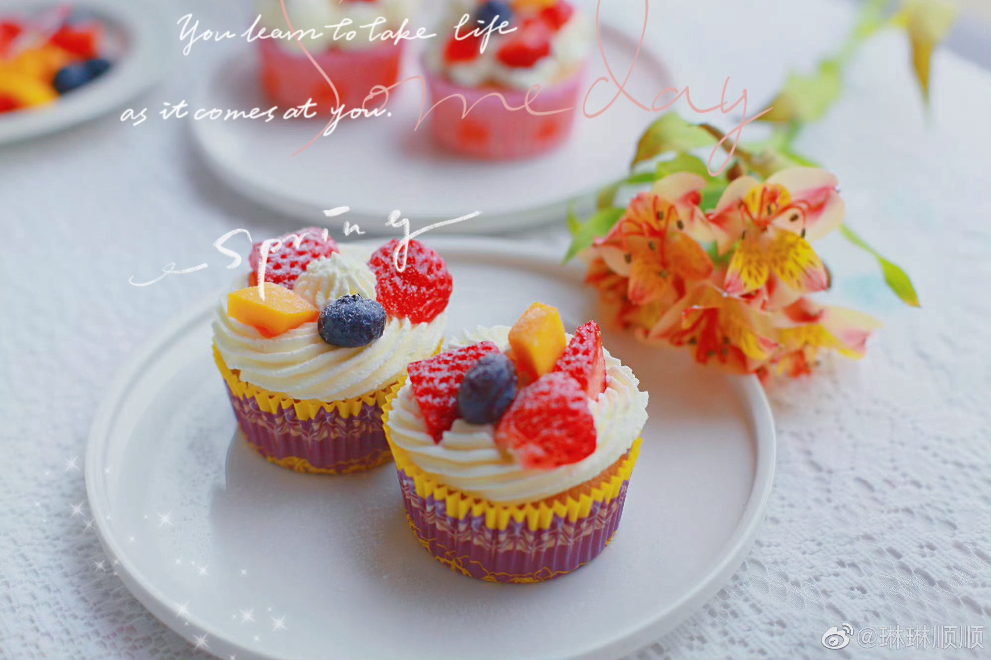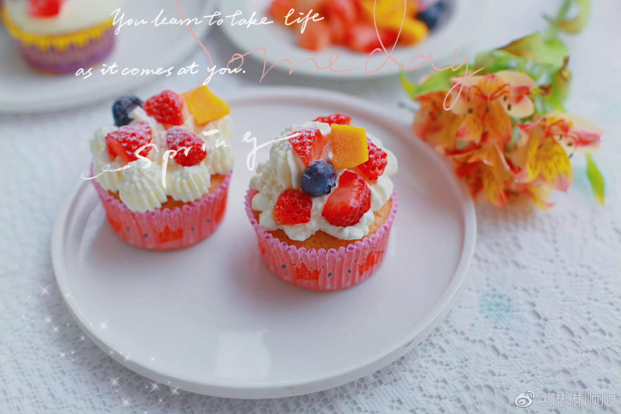 软乎乎的纸杯蛋糕,挤上奶油,再摆上新鲜的草莓、蓝莓和芒果块,最后撒点糖粉,看着就开心。