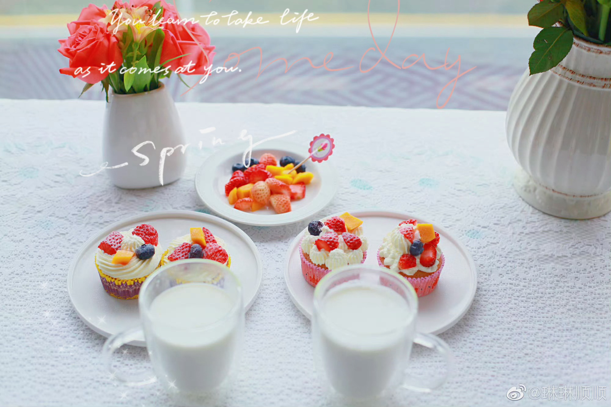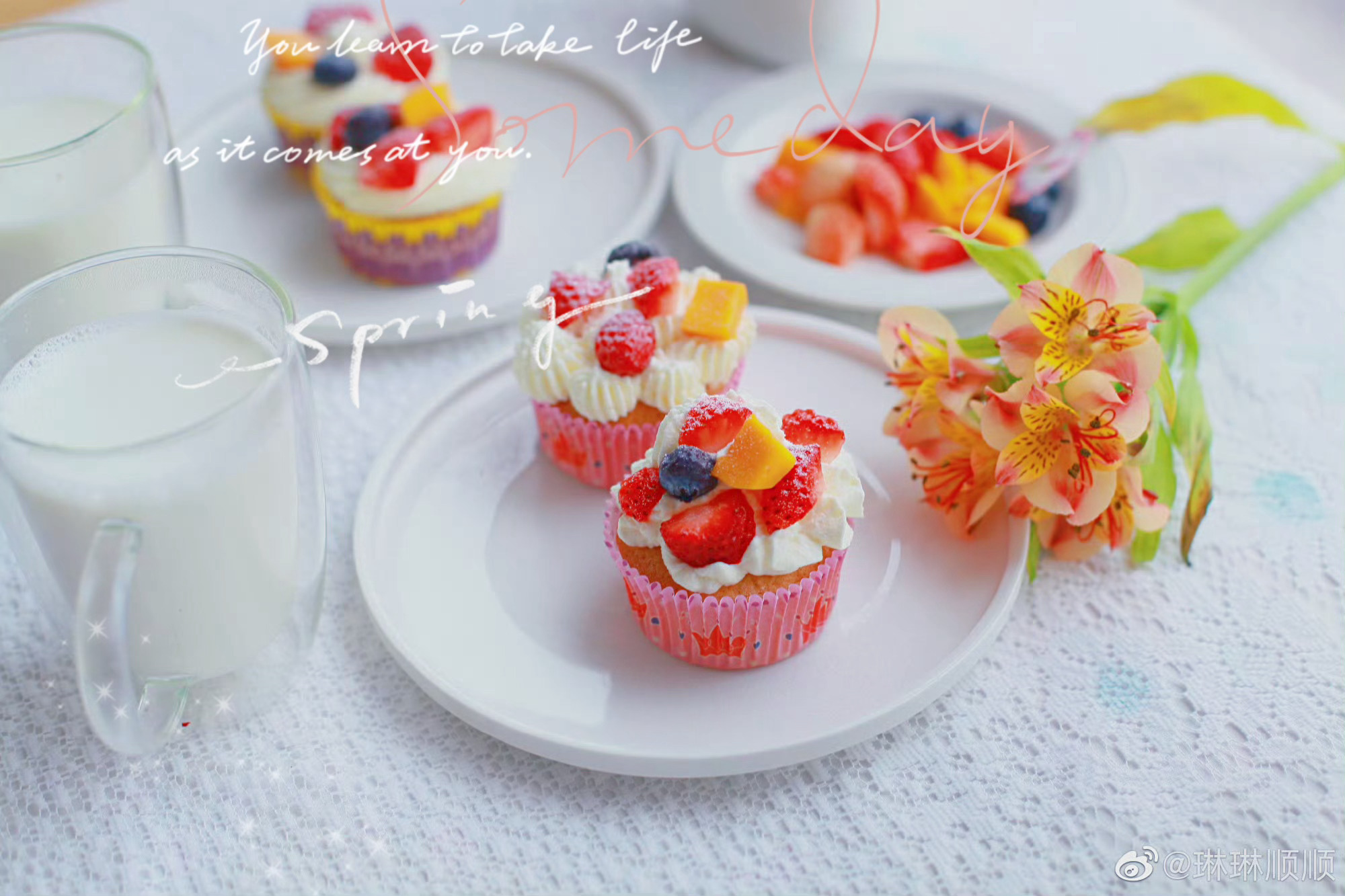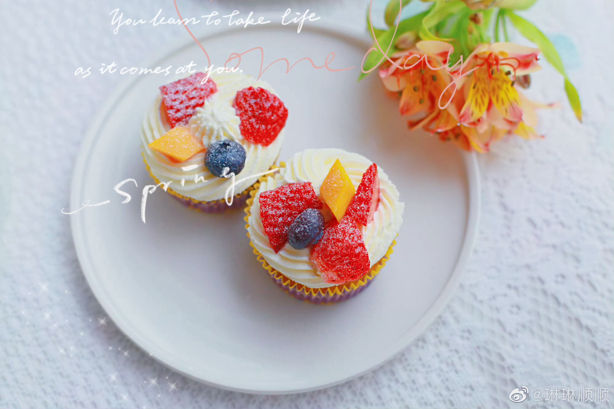 软乎乎的纸杯蛋糕,挤上奶油,再摆上新鲜的草莓、蓝莓和芒果块,最后撒点糖粉,看着就开心。