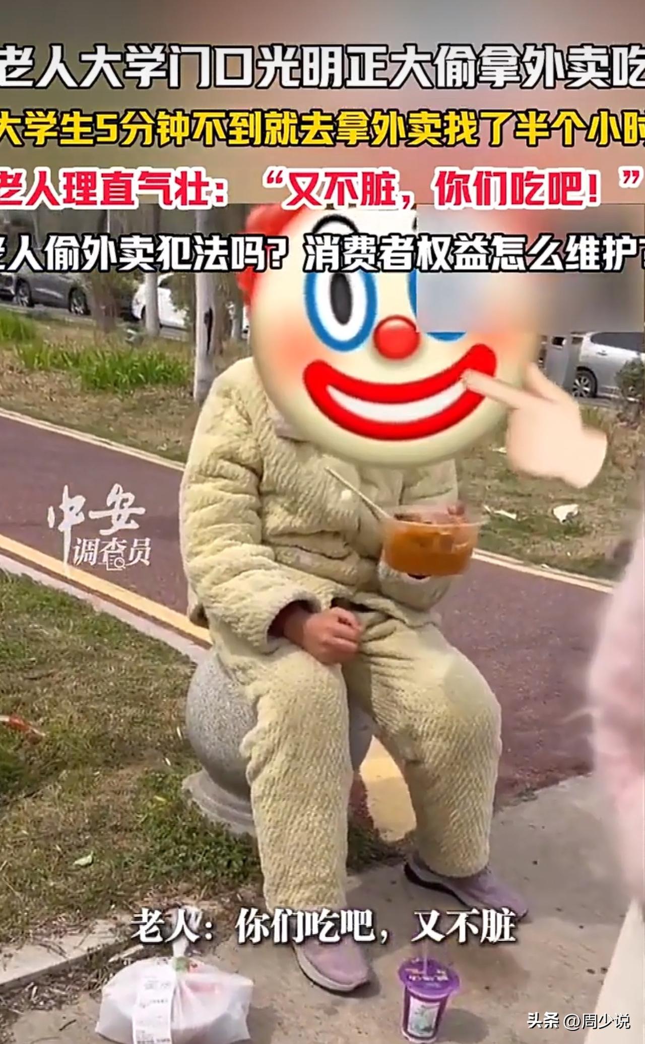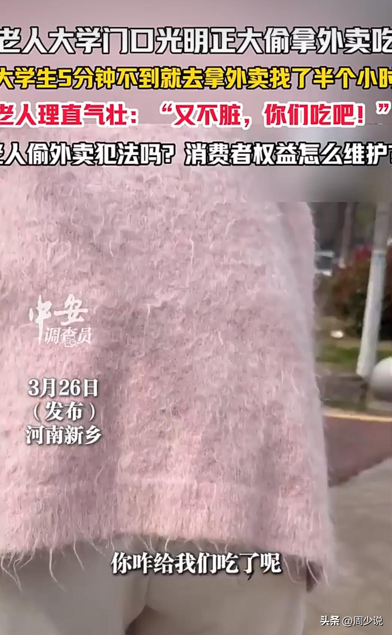 “又不脏,你们吃吧!”河南新乡一所大学门口,上演了让人哭笑不得又气愤的一幕。几名女大学生不过离开5分钟去取外卖,来回找了足足半小时,愣是没见踪影。结果,最后发现这份外卖竟被一位老太偷偷拿走,还坐在校门口旁若无人地吃了起来。 被学生当场抓包后,老人的反应更是让人意外,她丝毫没有愧疚之意,反倒把吃剩的外卖往学生面前一递,理直气壮地撂下一句:又不脏,你们吃吧,那副坦然的模样,反倒让学生们一时语塞。 这事在网上传开后,网友们纷纷发表看法。有网友直言:“年纪大不是没规矩的理由,偷拿别人的东西本身就不对,还这么理直气壮,真的说不过去。” 也有网友感慨:“学生的外卖没多少钱,可这种占小便宜的行为,实在不该有。” 在周少看来,这件小事看似不起眼,却藏着值得我们深思的教育和公德问题。不少人总觉得,拿一份外卖不值钱,算不上大错,可恰恰是这种小事,最能体现一个人的底线。 不管是老人还是年轻人,都该明白,不属于自己的东西,哪怕再微不足道,也不能随意触碰,这是最基本的做人准则。 年纪从不是逾越规则、忽视公德的借口,真正的体面,从来和年龄无关,而是藏在对他人的尊重、对规则的敬畏里。 这类小事也在提醒我们,公德教育从来不分年龄,守住内心的底线,不贪小便宜、尊重他人的劳动成果,才是最该守住的本分,别让一时的贪念,丢了最基本的教养。#寻美三湘# #周少说教育# #寻美湖南#