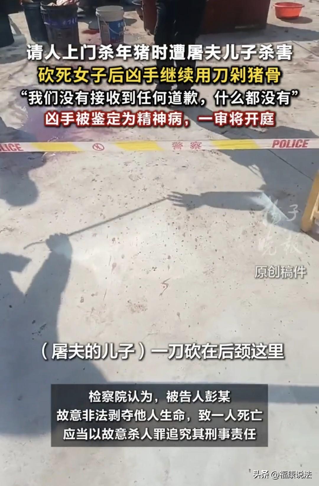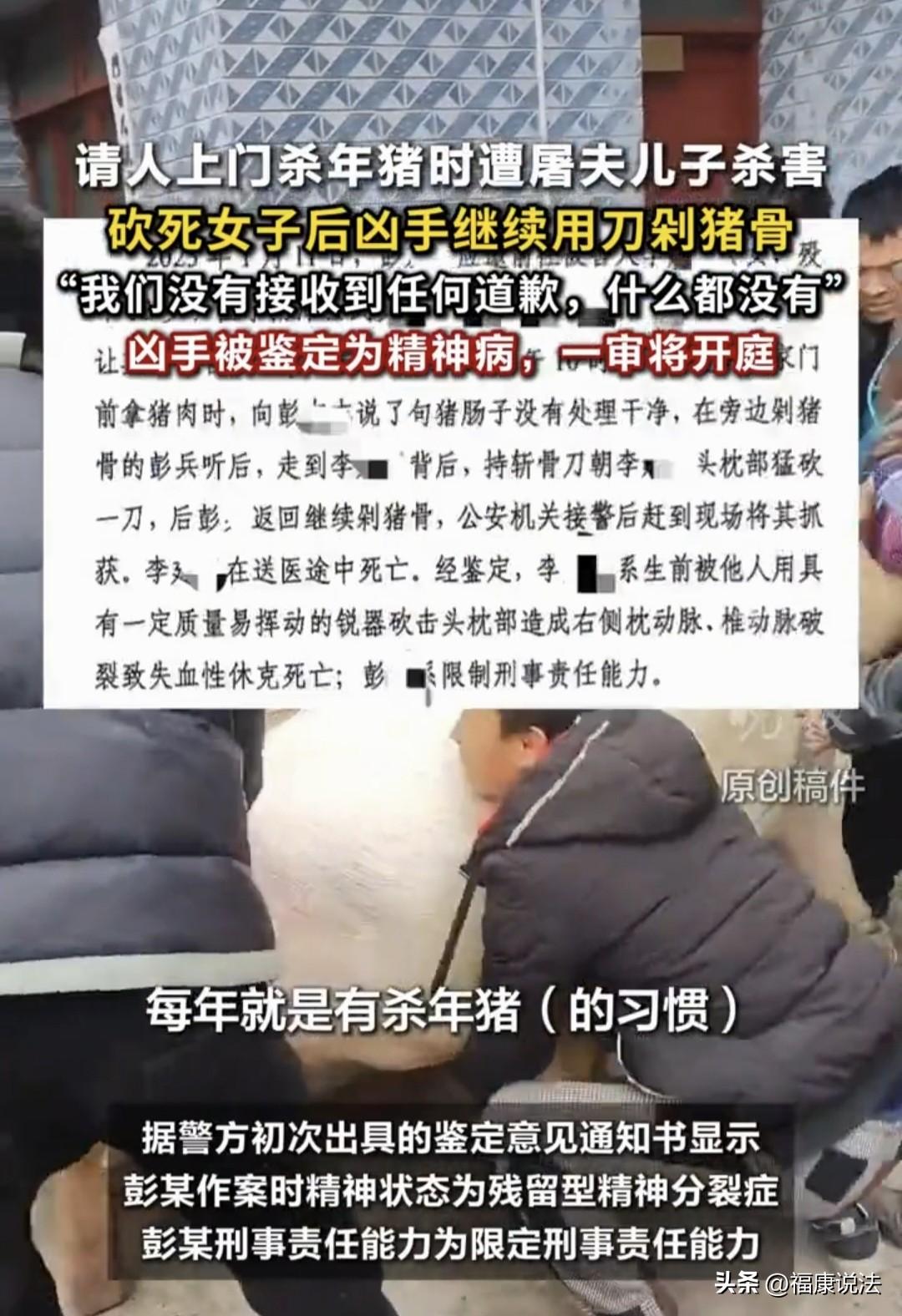 “一句抱怨的血案!”湖北,62岁女子从上海回老家,请一屠夫上门杀年猪,谁料,女子说了一句:猪肠子没搞干净。屠夫的儿子一旁在剁猪骨,突然拿刀对着女子后脖子砍了一刀,女子在送医途中死亡,事后,鉴定屠夫儿子有心因性偏执性精神病,而屠夫只赔偿了5万,也没道歉,就不管了,女子的儿子希望能严惩凶手。 2025年春节前,一直在上海跟儿子黄先生生活的老太太李某,眼看要过年,她提前回老家置办年货,想着杀头年猪,热热闹闹过个年。 她特意请了同乡的屠夫老彭来家里杀猪,彭某某还带上了自己的儿子彭某帮忙。 那天上午10点多,来了很多亲戚,都在忙活,而老太太李某在门前收拾猪肉,随口跟老彭提了一句,猪肠子处理得不干净。 这话被旁边剁猪骨头的彭某听了进去,谁也没料到,这个平时看着正常的男人,突然抄起手里的斩骨刀,悄悄绕到老太太身后,对着她的后脖子猛砍了一刀。 更让人毛骨悚然的是,砍完人之后,彭某像没事人一样,转身回去继续剁猪骨头。 当时家里还有不少亲戚在,但大家都在各自聊天,谁也没留意到背后发生的惨剧。 等发现李某倒在地上时,人已经不行了,送到医院的路上就没了气息。 警方很快把彭某抓了起来,鉴定结果显示,他是限制刑事责任能力人,第一次鉴定说是残留型精神分裂症,后来家属申请二次鉴定,又改成了心因性偏执性精神病,意思就是他作案时辨认和控制自己行为的能力都弱一些。 黄先生接到母亲遇害的消息时,还在外地出差,好好的团圆年,瞬间变成了天人永隔。 而屠夫老彭事后只给了5万块丧葬费,之后就没了动静,连句道歉都没有。 从法律角度来看,彭某有精神疾病,到底该不该承担法律责任呢? 本案中,限制刑事责任能力意味着彭某作案时辨认和控制自己行为的能力有所削弱,但还没到完全不能辨认的程度。 《刑法》第18条第3款规定:尚未完全丧失辨认或者控制自己行为能力的精神病人犯罪的,应当负刑事责任,但是可以从轻或者减轻处罚。 彭某需要为杀人行为负责,但量刑时可以比完全刑事责任能力的人轻一些。 不过,他杀人手段残忍,而且事后毫无悔意,法院会综合这些情节来决定从轻或减轻的幅度。 黄先生要求重判,也是希望法院能考虑案件的恶劣性,不要过度从轻处理。 这一年多来,黄先生一直在等着法院开庭,他最大的心愿就是凶手能得到应有的惩罚,告慰母亲的在天之灵。 据法院出具的出庭通知书:这个案子定于2026年4月1日上午9时30分在南漳县人民法院第一审判庭开庭审理。 有人说,既然是精神有问题的,为什么还带出来?为什么不送精神病医院?为什么家人不派人严管在家?还让他出来帮什忙? 本案中,彭某是限制刑事责任能力人,他的父亲彭某某(老彭)作为监护人,如果没有尽到监护职责,比如明知儿子精神状态不稳定还带他去帮忙,就需要承担民事赔偿责任。 《民法典》第1188条规定:无民事行为能力人、限制民事行为能力人造成他人损害的,由监护人承担侵权责任。 虽然,彭某某已经支付了5万元丧葬费,但黄先生家还可以主张死亡赔偿金、精神损害抚慰金等赔偿。 如果彭某自己有财产,先从他的财产里出,不够的部分再由彭某某补充赔偿。 好好的杀年猪,变成了一场惨剧,谁也没想到一句随口的抱怨,会引来杀身之祸。 这事也提醒所有人,身边要是有精神状态不太稳定的人,可得多留个心眼,尽量离远点,不然不知道什么时候就会出意外。