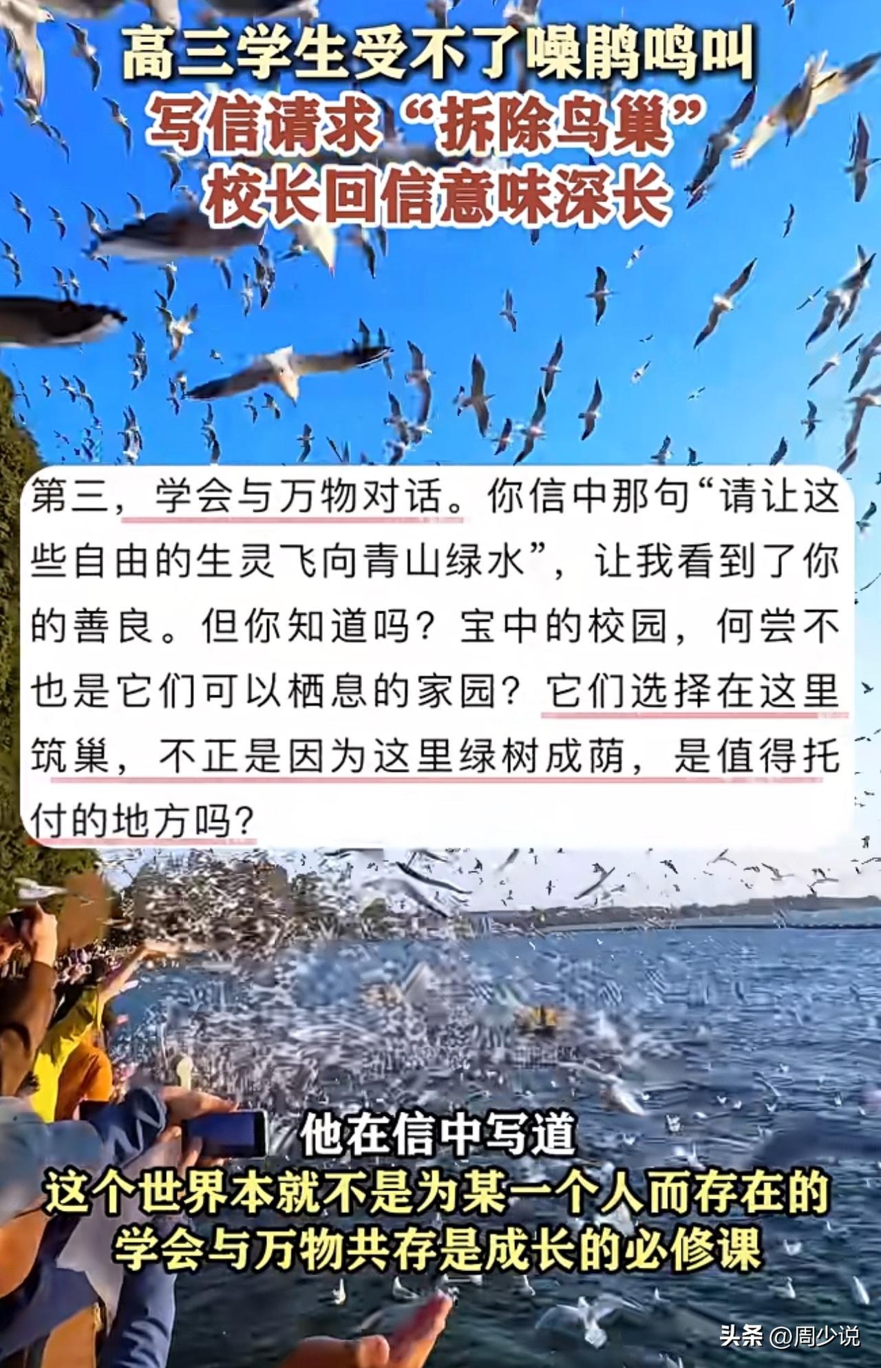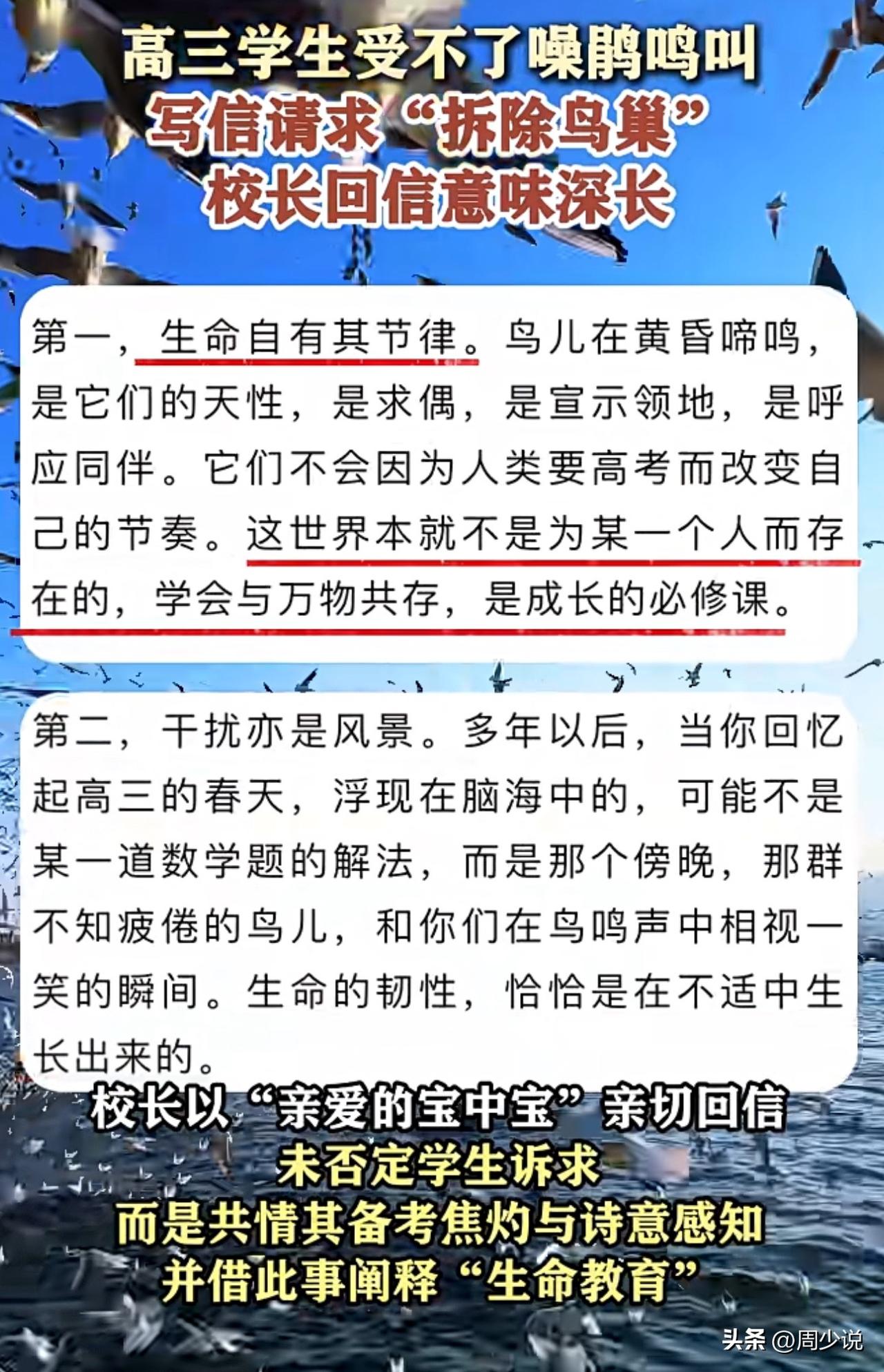 “这校长真有智慧!”高三学生为备考请求拆除鸟巢,只因受不了躁鹊鸣叫!校长回应:教育的终极目标是让我们学会与世界相处,这个世界本就不是为某一个人而存在的,学会与万物共存是成长的必修课。一番话,让众多网友纷纷称赞,太有智慧了!#周少说教育# #寻美三湘# #寻美湖南#