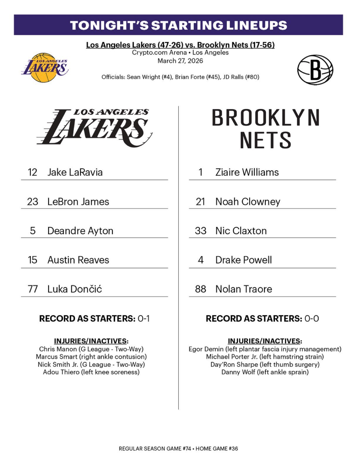 湖人首发:东契奇、里夫斯、拉拉维亚、詹姆斯、艾顿篮网首发:特拉奥雷、鲍威尔、威廉