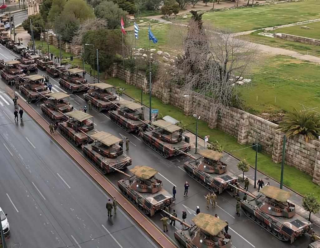 希腊这次也是学聪明了,把陆军的坦克部队,主装坦克都加了了雨棚设施,为的就是防止无人机的直接轰炸。 这是是有迹可循的,乌军就是用无人机这招,打得俄军坦克直接有心理阴影了,所以才吸取了经验教训。[看]