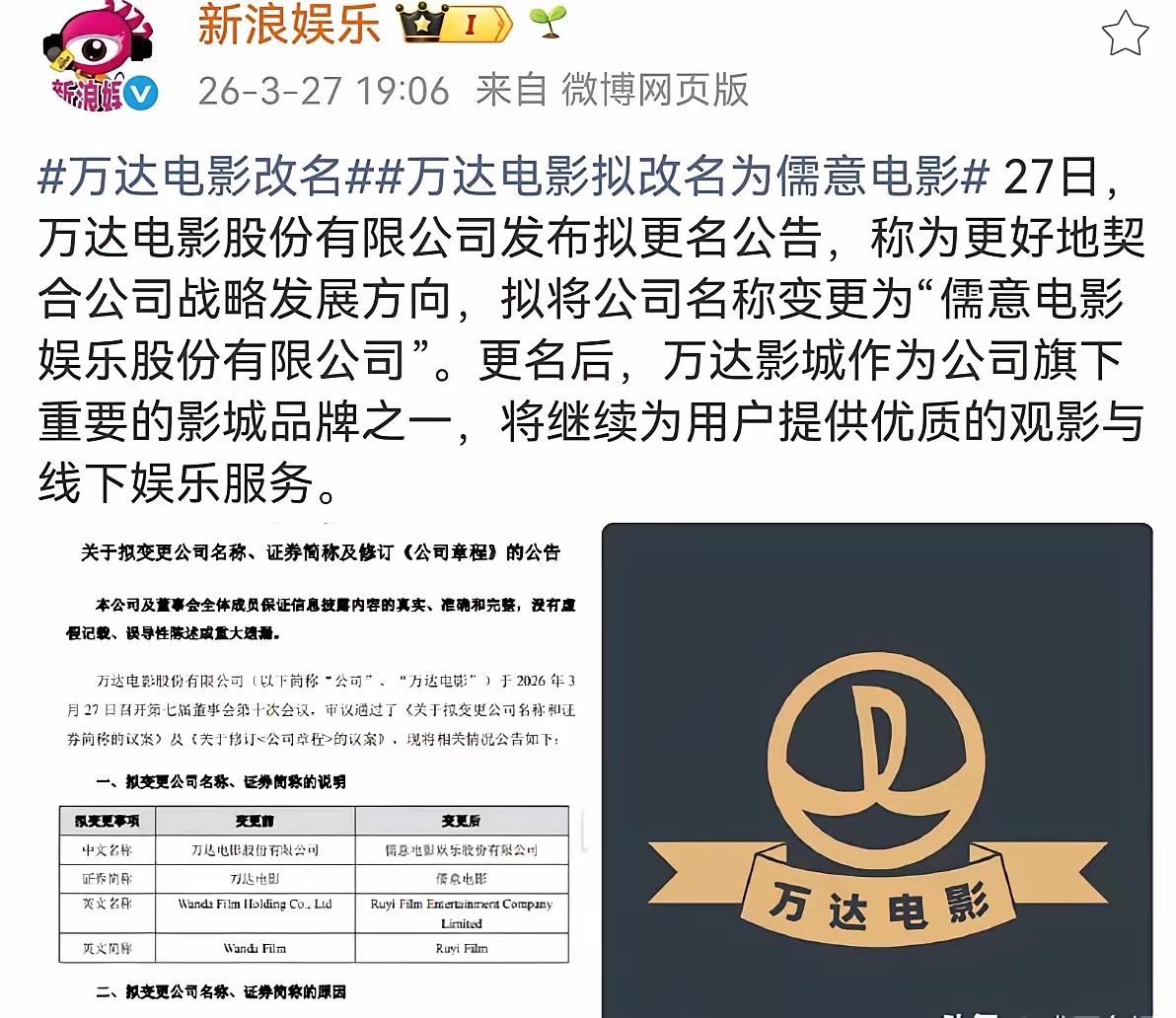 王思聪,彻底告别! 3月27日,王健林和王思聪父子俩,突然引发了网友的热议,这次不是啥好消息,曾经让家族引以为傲的“万达集团”,旗下的万达电影即将完全脱离万达体系了。 说真的,看到这个消息的时候,不少人都愣了一下。毕竟在很多人的印象里,万达电影和王健林、王思聪这对父子,早就绑得死死的,是万达商业版图里最亮眼的文娱招牌,也是王思聪早年最拿得出手的家族底气。 谁能想到,曾经风光无限的万达文娱版图,会以这样的方式落幕。这次更名不是简单换个牌子,而是王家父子彻底退出的终局信号。早在2023年底,王健林就把万达电影控股股东51%的股权卖给儒意系,拿到21.55亿元;到2024年4月,更是把剩余股份全部清仓,彻底失去控制权。如今把“万达电影”改成“儒意电影”,不过是把早已易主的事实,正式摆到台面上。 对王思聪来说,这更是青春与光环的彻底退场。当年他顶着“万达少东家”的名头,在文娱圈呼风唤雨,投资电竞、做直播、泡娱乐圈,背后全靠万达电影这块金字招牌撑腰。那时候他说句话都能上热搜,随便一个投资都被追捧,靠的不只是他自己,更是“万达”两个字带来的资本底气。可如今,连最后一块文娱招牌都被摘走,他和万达系的连接,被切得干干净净。 这一切的背后,是万达长达数年的债务困局。巅峰时期万达负债超6000亿,短期债务压顶,王健林只能不断“卖卖卖”续命。从海外资产到国内酒店、文旅项目,能卖的全卖了,万达电影作为最优质、最有辨识度的资产,自然成了抵债的关键棋子。对王健林而言,卖掉电影是断臂求生;可对王思聪来说,这是丢掉了最后一块属于他的“主场”。 曾经的王思聪,是娱乐圈“纪检委”,是资本圈新贵,走到哪里都是焦点。可随着万达一步步收缩,他也从神坛跌落。投资接连失败,从电竞到直播再到电商,几乎没一个成器;昔日的高调张扬,变成如今的低调沉默,甚至被拍到卖平价牛排,反差大到让人唏嘘。不是他不想折腾,而是没了万达的资本撑腰,他什么都不是。 更残酷的是,这场告别不只是个人命运的转折,更是一个时代的结束。万达电影曾连续17年领跑国内票房,手握700多家影城、6000多块银幕,是中国电影黄金十年的标志性符号。它见证了王健林从地产商到文娱巨头的野心,也承载了王思聪“文娱少帅”的梦想。可时代变了,流媒体冲击、行业下行、债务压顶,曾经的帝国梦碎,只剩下不断变卖资产的狼狈。 很多人惋惜,好好的文娱帝国怎么说塌就塌。可资本世界从来这么现实,没有永远的帝国,只有永远的利益。王健林为了还债,只能割舍最心爱的资产;王思聪没了家族光环,也只能褪去锋芒,回归平凡。曾经的高高在上,如今的跌落尘埃,不过是人性与资本的真实写照。 万达电影变成儒意电影,王家父子彻底告别。这不仅是一个品牌的终结,更是一代豪门神话的落幕。曾经的风光无限,终究抵不过现实的残酷,再耀眼的光环,也有褪色的一天。 各位读者你们怎么看?欢迎在评论区讨论。