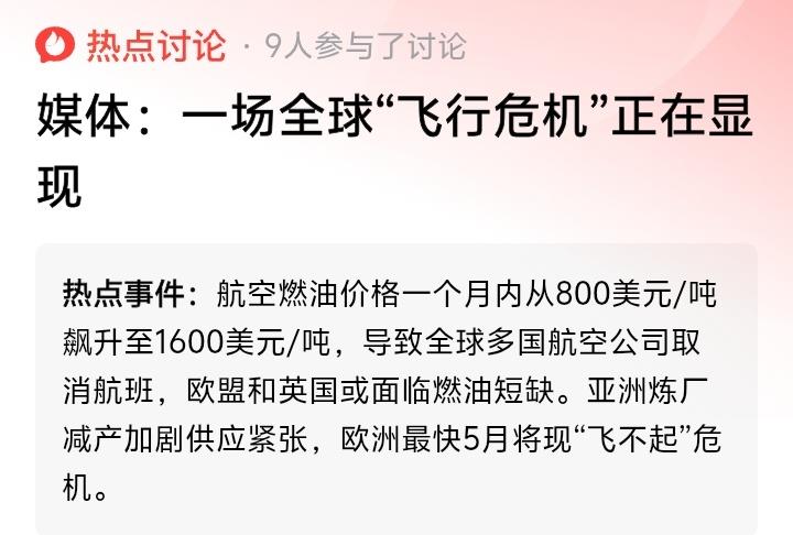 全球航空燃油价格一个月内翻倍!你的五一旅行计划要泡汤?亚洲航班已取消千余次,欧洲五月恐陷“飞不起”危机! 当你在手机屏幕上滑动,焦急地查看五一假期的机票价格时,一场无声的风暴正在席卷全球的天空。航空燃油价格如同脱缰野马,短短一个月从每吨800美元飙升至1600美元。这不仅仅是新闻里冰冷的数字,而是即将压垮你旅行梦想的最后一块巨石。 越南航空已经暂停了部分国内航线,新西兰航空取消了上千个航班。遥远的欧洲,分析师们预测最快五月就会出现“飞不起”的窘境。这一切,都源于那条连接世界能源心脏的霍尔木兹海峡的阻塞。我们以为战争很遥远,但它的触手已悄然扼住了每个人的出行咽喉。 你或许会疑惑,为什么偏偏是航空业首当其冲?因为飞机喝的不是普通油料,而是需要特殊炼制的航空煤油。亚洲炼厂因缺乏中东原油正在减产,全球供应每天锐减约60万桶。当需求在夏季旅行旺季前攀升,供需的天平瞬间崩塌。这不是局部阵痛,而是一场全球性的“飞行危机”。 更令人焦虑的是,这场危机正以机票价格的形式,直接砸进你的钱包。跨大西洋航线的成本已为每位乘客增加了近300美元。国内航司的国际航线燃油附加费普遍暴涨50%以上,飞往部分东南亚国家的单段附加费甚至高达600元。你的旅行预算,正在被这场远方的风暴无声吞噬。 于是,一个前所未有的景象出现了:人们开始像囤积生活物资一样“囤积机票”。五一机票预订量同比激增近两成,许多人试图在4月5日国内燃油附加费可能再次上调前,锁定那张昂贵的出行凭证。这背后,是普通人对失控成本最原始的恐惧和无奈应对。 然而,盲目囤票真的是解药吗?民航专家发出警告,不确定行程的预防性购票,可能面临更高的退改签费用。这场危机逼迫我们重新审视旅行的意义——当飞行成为一种奢侈,我们是否更应珍惜每一次脚踏实地或精心规划的远方? 这场“飞行危机”的本质,是一次深刻的全球能源依赖警示。它暴露出在高度联通的全球化表象下,链条的脆弱性。当一条海峡的通行受阻,就能让半个世界的天空陷入困顿。它迫使每个国家、每个行业,乃至每个计划出行的人,都不得不思考关于安全、成本与可持续未来的沉重命题。 你的下一次飞行,或许不再是一次说走就走的浪漫,而是一场需要精打细算、权衡再三的决策。世界的天空正在收紧它的怀抱,而我们,都在学习如何适应这个“飞不起”的新常态。 (来源:综合财联社、光明网、北京新闻及网络热点讨论) 全球飞行危机 燃油暴涨