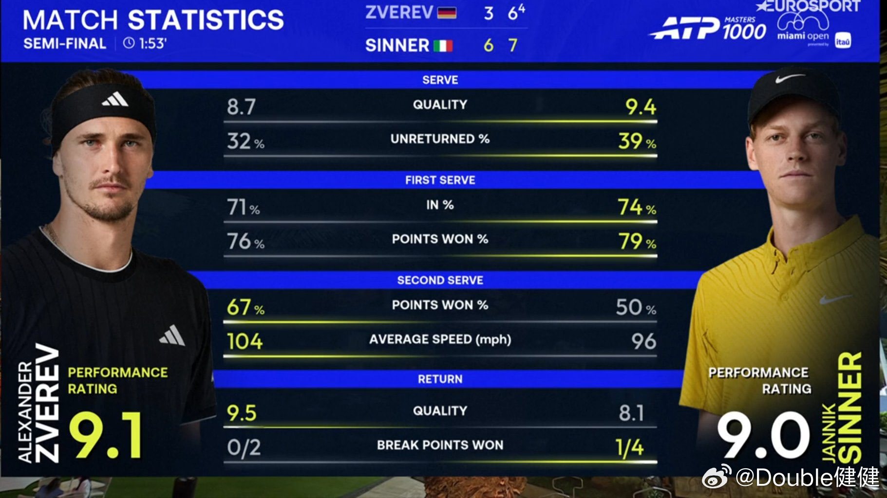这个数据扎心了!除了ATP年终总决赛,兹维列夫已经对TOP5选手遭遇12连败,自1973年排名首次发布以来,只有费雷尔(15场)有更多连续此类失利。其实兹维列夫本场比赛表现不差的,表现率9.1,还比辛纳高(9.0)。辛纳7连胜兹维列夫 ATP