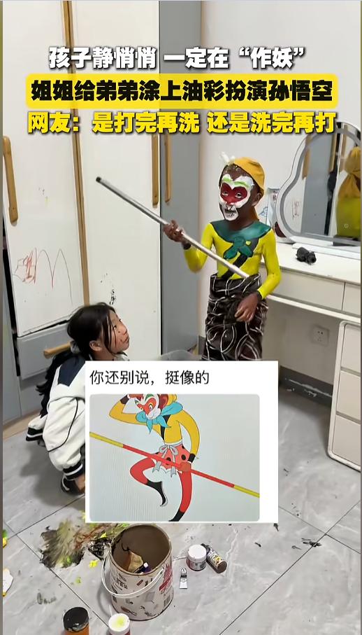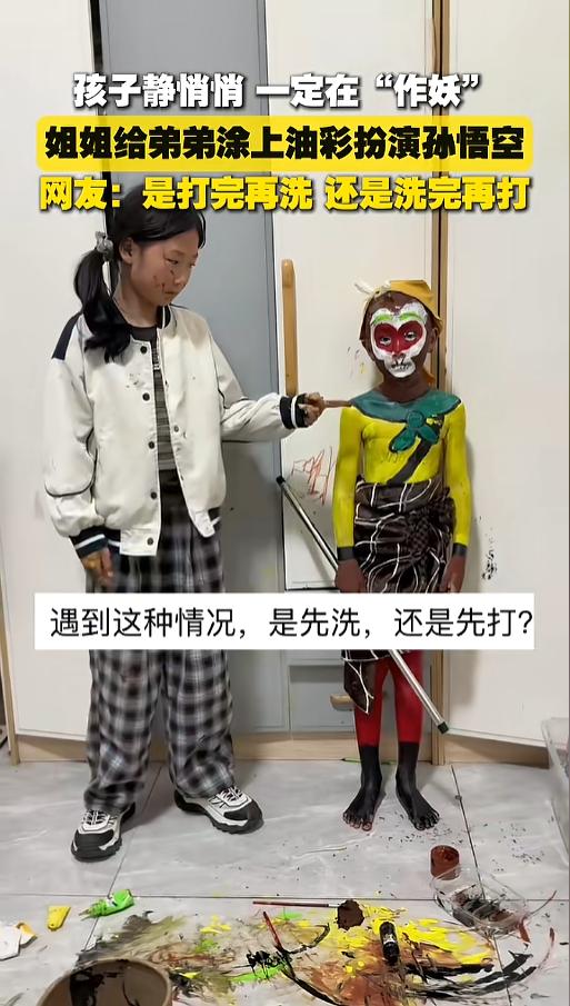 “笑不活了!”近日,山东,一位家长让姐弟在在屋里自己玩耍,一下午都挺安静的,家长推门一看,瞬间变脸。俩人作了一下午妖,姐姐用油彩给弟弟涂了一身,弄成了个孙悟空的形象,弟弟还搁那儿找了根笤帚棍当金箍棒。网友:别说,画的一模一样! 孩子们在一起吵吵闹闹的,有时候家长就会觉得糟心,想让孩子们自己安静点。可孩子天性好动,真当他们静悄悄的时候,未必是件好事,不是出意外了,就是在作妖。 据媒体3月25日报道,当日,姐弟俩在屋里玩,一下午都很安静,家长对此还挺开心呢。可当她推开门一看,天都塌了。姐弟俩玩起了人体彩绘,墙上地上也粘了不少油彩。 弟弟充当模特,浑身上下光溜溜的,就腰间围了条围裙,姐姐给他画了个孙悟空的形象。眼周围是红脸儿,嘴巴一圈是白色,脖子是棕色的,还画上了一个绿色的围脖。 再往下看,上身画成了黄色,裹着棕色的围裙,腿涂成了红色的。头上还戴上了一顶黄帽,又用胶带和泡沫板做了个金箍的造型。 弟弟自己有找来了笤帚,把头尾去了,就剩了中间拿根棍,拿在手里当金箍棒用。整体看上去,跟动画片《大闹天宫》里的大圣形象简直一模一样。 网友看后表示,能画成这样,这姐姐的天赋真不错,就是这一身好洗么?你说是先打一顿再洗呢,还是先洗完再打呢,还是边洗边打呢?这是一个值得思考的问题。 信息来源:《小孩静悄悄,一定在“作妖”,姐姐给弟弟涂油彩扮演孙悟空。(记者:张钟仁;来源:山东广电)》新华社