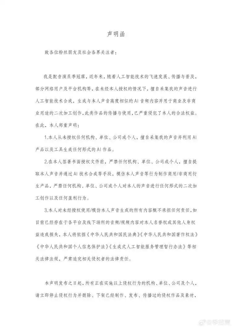 绝了! 3.28配音圈集体维权,AI偷声比抢钱还狠 边江、季冠霖等几十位配音大佬集体炸锅! 自己的声音被AI3秒克隆,拿去做广告、做直播,赚得盆满钵满,本尊一分钱没有,还被骂“恰烂钱”。 这哪是技术进步,分明是明火执仗的抢劫! 声音也是人格权,凭什么被白嫖?再不立法管管,以后人人都能当“影帝影后”,真演员全得失业! AI仿声侵权