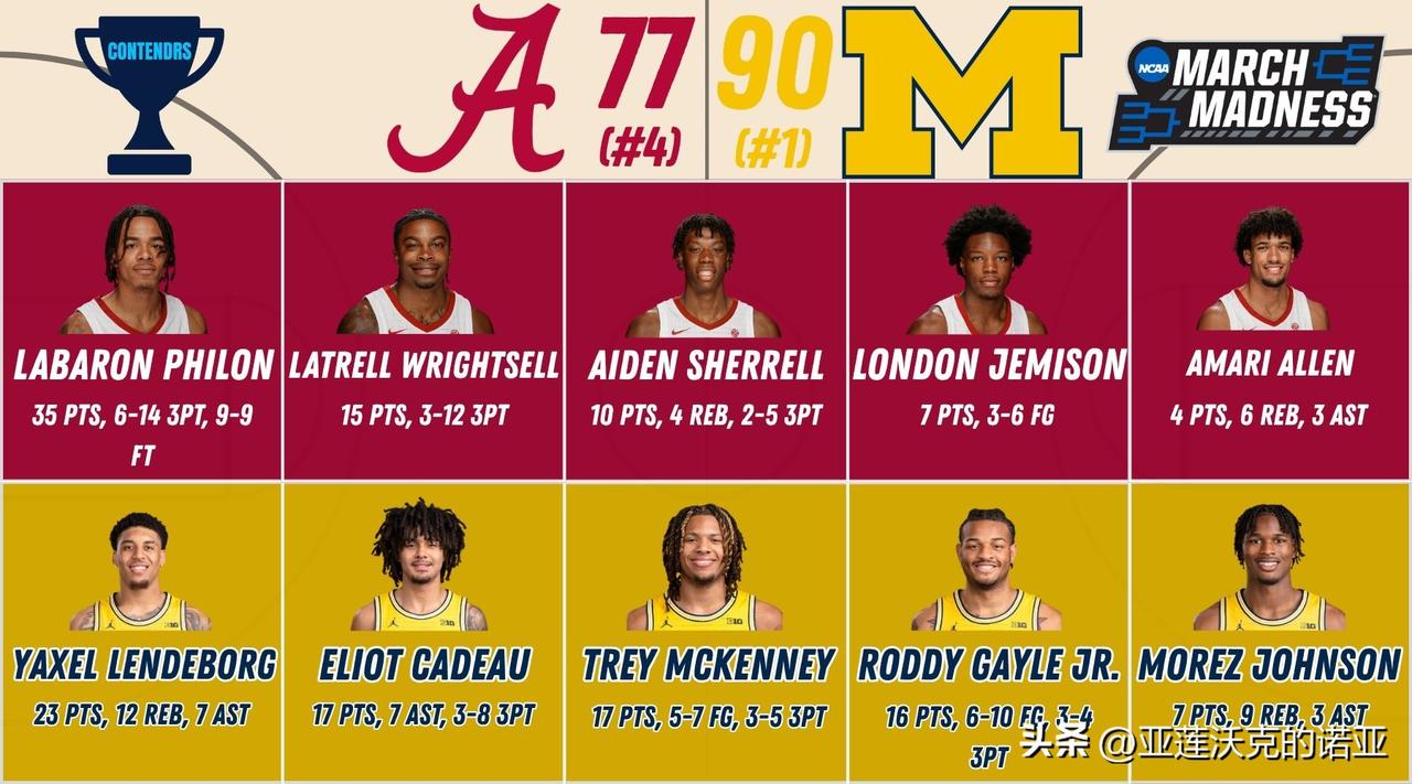 阿拉巴马在上半场还顶得住,但随着比赛深入,密歇根大学的身高优势终于显现出来,狼獾队在篮板方面以46比32碾压了对手,球队自2021年首次晋级疯狂三月 精英八强,Yaxel Lendeborg单场23分12篮板7助攻,赛后自信说我们就是全美头号强队,我们可能是密歇根大学队史最强的队伍。
