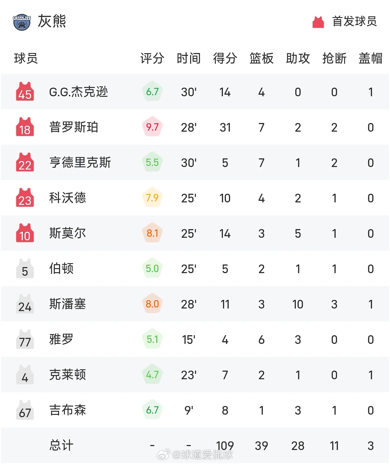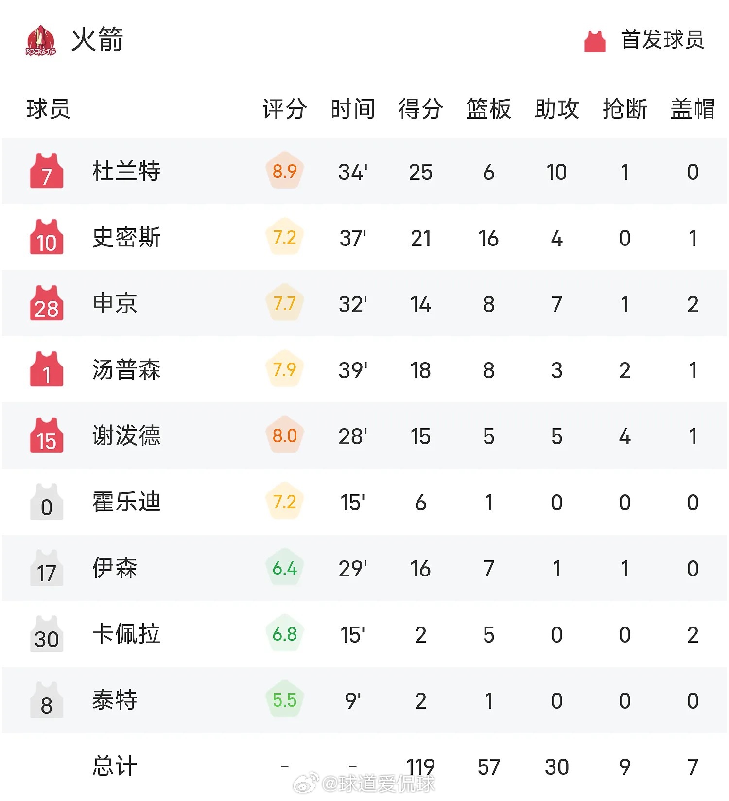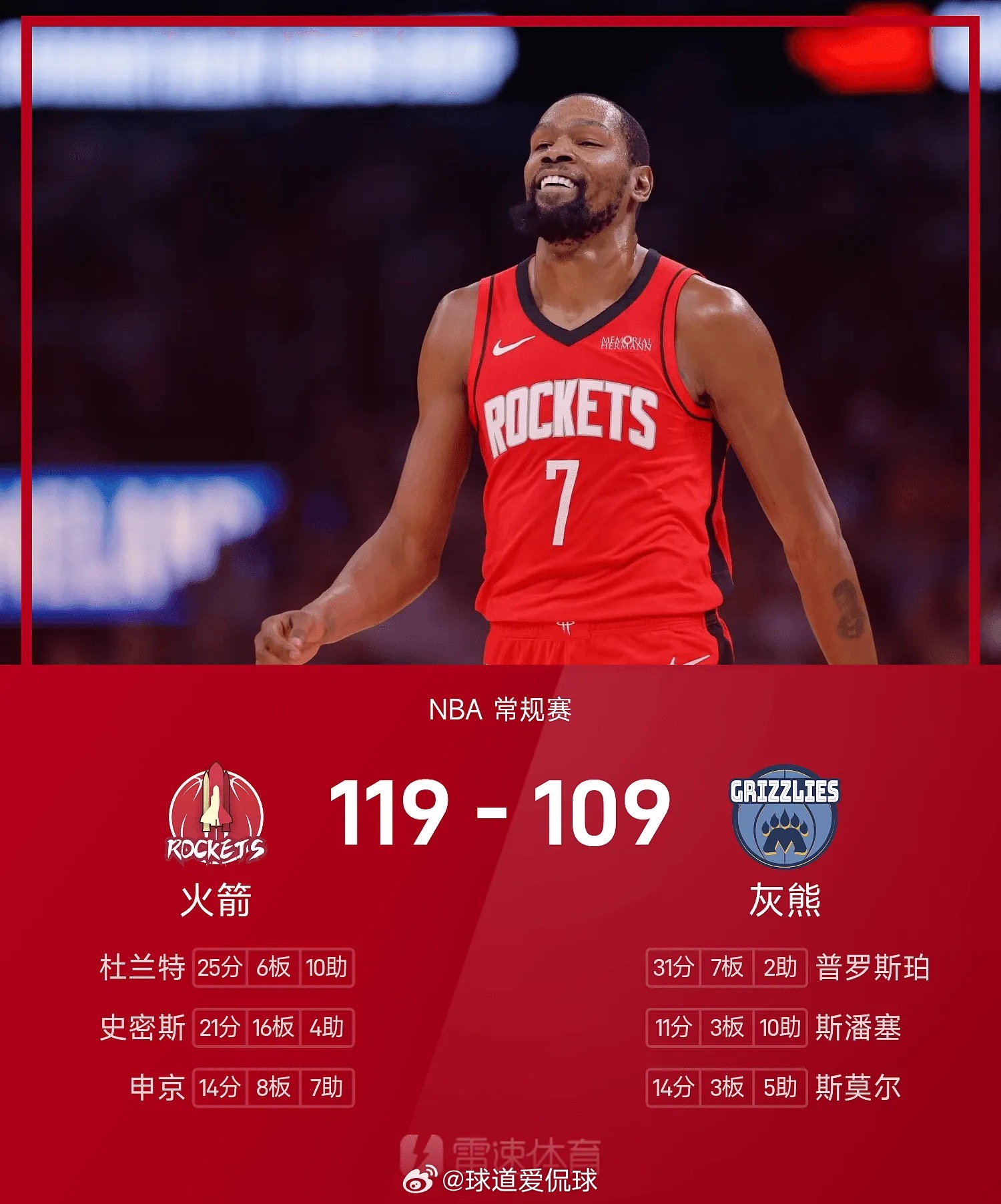 双方全场战罢,灰熊109-119不敌火箭。