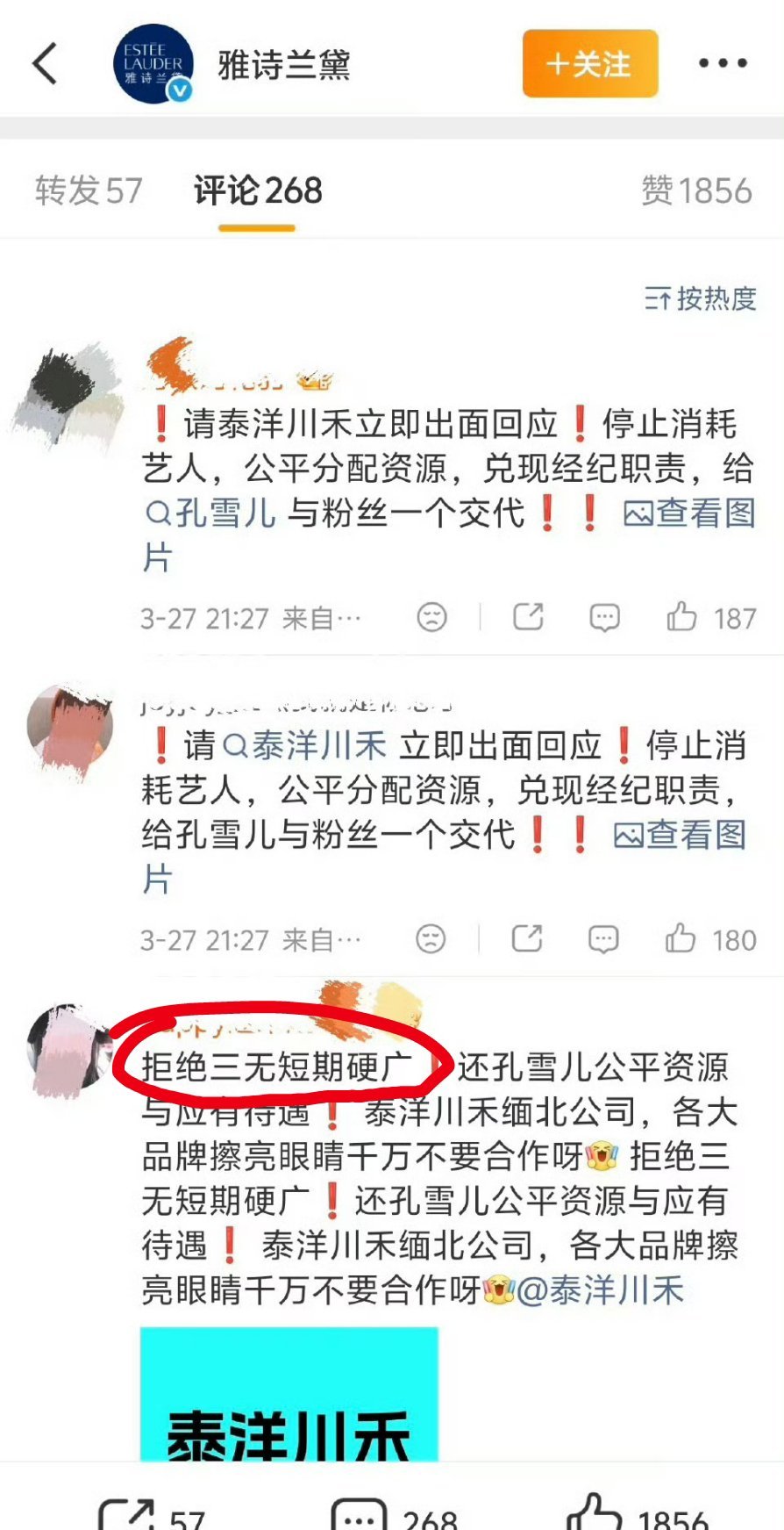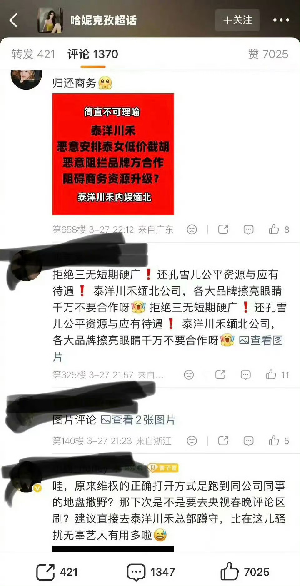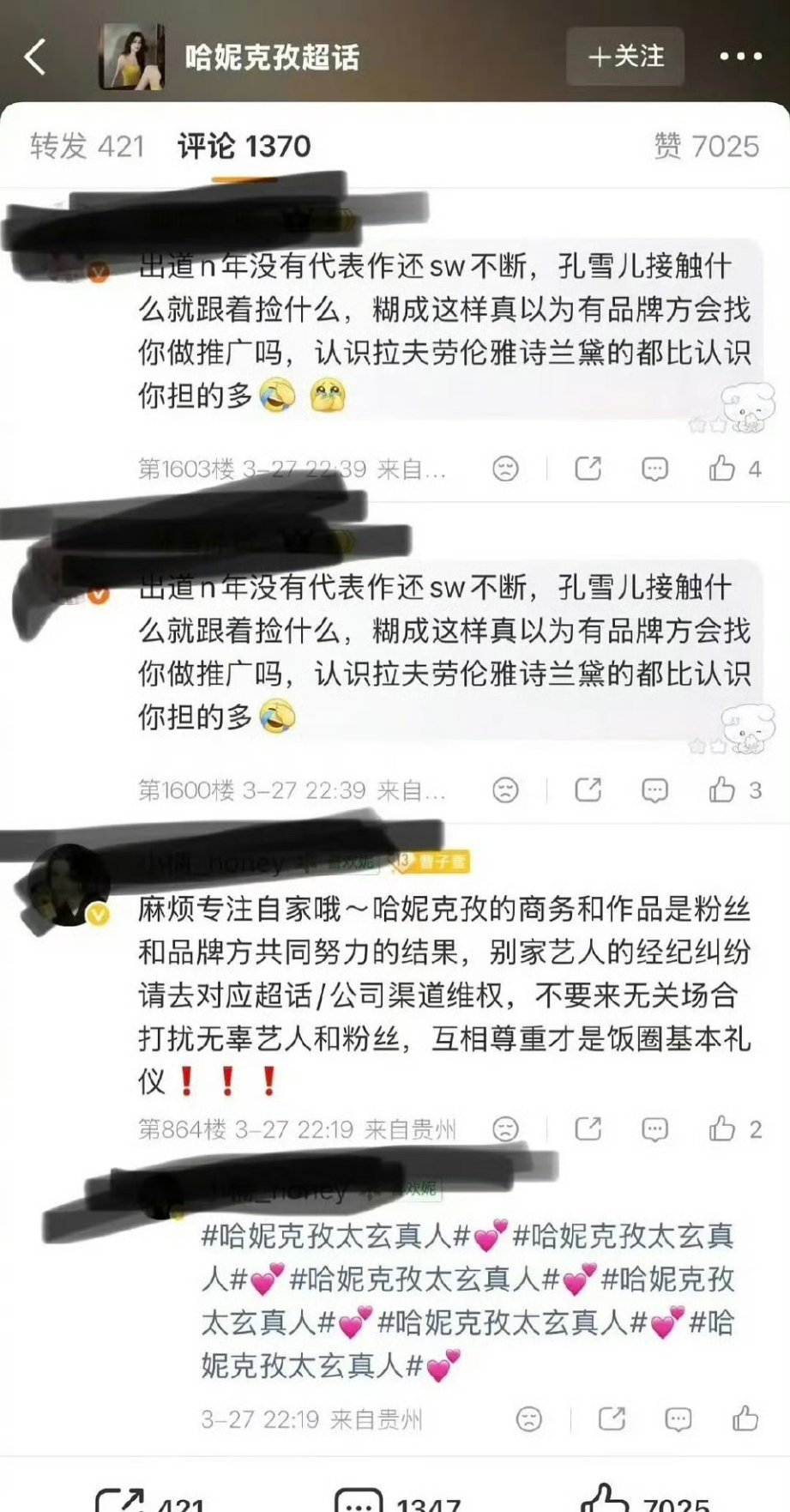 孔雪儿粉丝就觉得公司截胡资源给别人,于是跑去冲了哈妮克孜和品牌方。