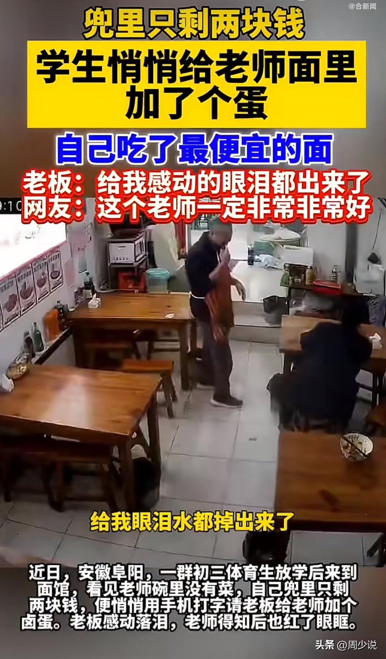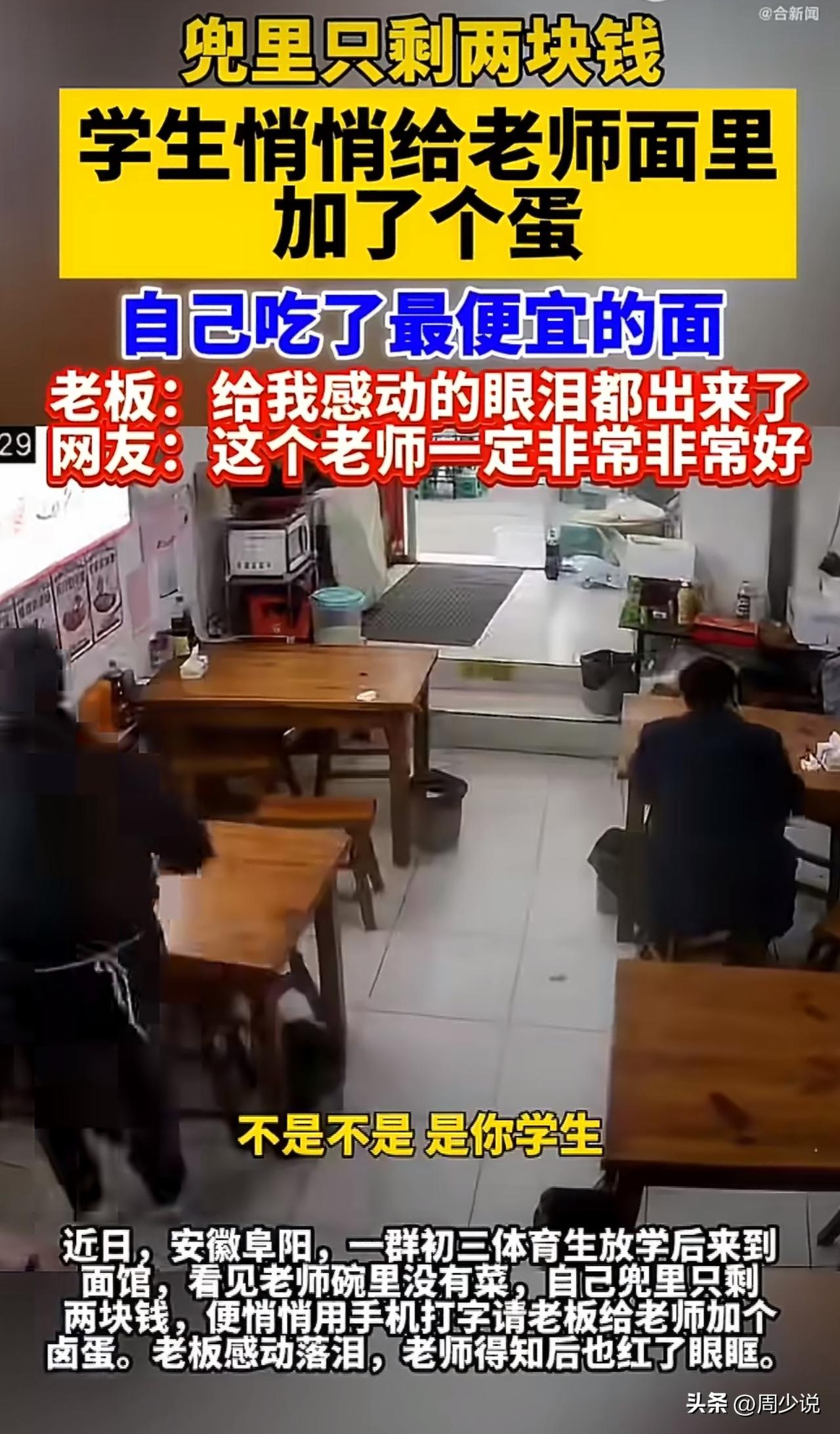 “泪目!”安徽阜阳,一则学生悄悄给老师面里加了个蛋,瞬间火上热搜,短短时间内收获大量点赞,网友们纷纷表示:“这才是教育最美好的模样!” 事情发生在一所中学附近的面馆里,一群初三体育生训练结束后,和老师一同来吃晚饭。无意间,有学生注意到老师碗里只有清汤面,没加任何配菜。这群孩子兜里凑一凑,也只剩两块钱,却没丝毫犹豫,怕当面说让老师难为情,便悄悄拿着手机打字,跟面馆老板商量,用这仅有的钱,给老师的碗里加一颗卤蛋。 老板得知缘由后,当场就红了眼眶,二话不说帮孩子完成了这个小心愿。老师吃到卤蛋时满心疑惑,问清来龙去脉后,看着眼前这群晒得黝黑的体育生,瞬间湿了眼眶,哽咽着说不出话。 网友们看完也纷纷破防,不少网友纷纷表示:“两块钱不多,却藏着孩子最纯粹的心意,能被学生这样惦记,这个老师多半是掏心掏肺对学生好。” 看完这一幕,周少也被感动到了。其实不难发现,好的师生关系从来都是双向奔赴的。老师平日里对学生的悉心陪伴、耐心教导,或许没有惊天动地的举动,却都被孩子看在眼里、记在心里。 教育本就是一场温暖的传递,从来不是单方面的付出,老师用真心对待学生,学生便会用最质朴的方式回馈这份温情。 这颗小小的卤蛋,远不止是一顿饭的暖意,更藏着孩子对老师最真挚的认可与感恩。它也在提醒着每一位教育者,真心换真心从来都不是空话,你对孩子的每一份关爱,都能在不经意间,收获最动人的回应。 如此纯粹的师生情,值得我们好好珍藏,也让我们看到了教育最本真的美好。给这些学生点赞!#周少说教育# #寻美三湘# #寻美湖南#