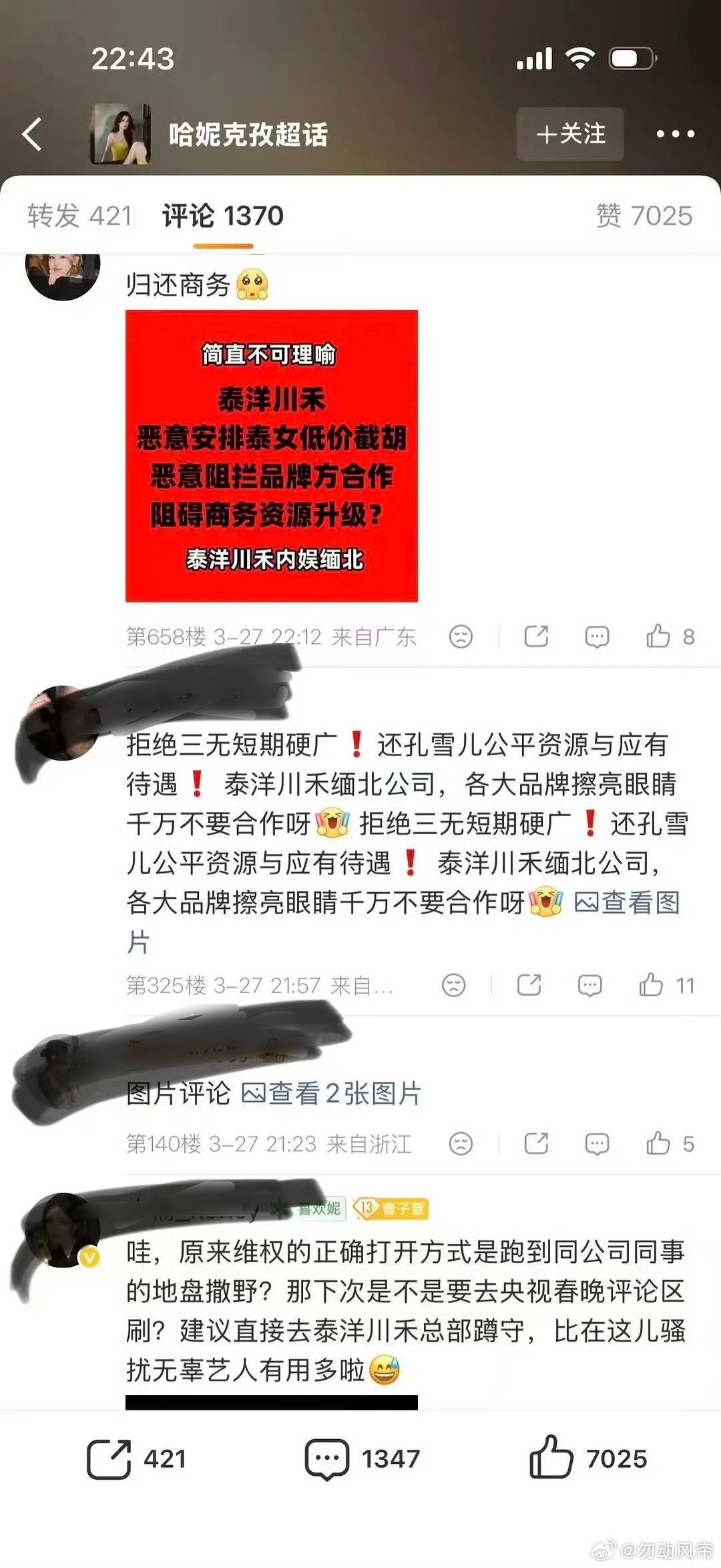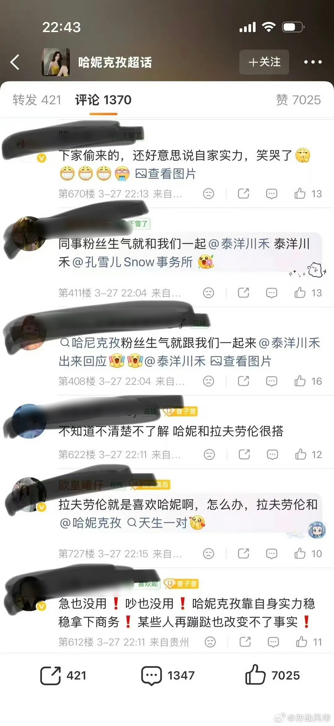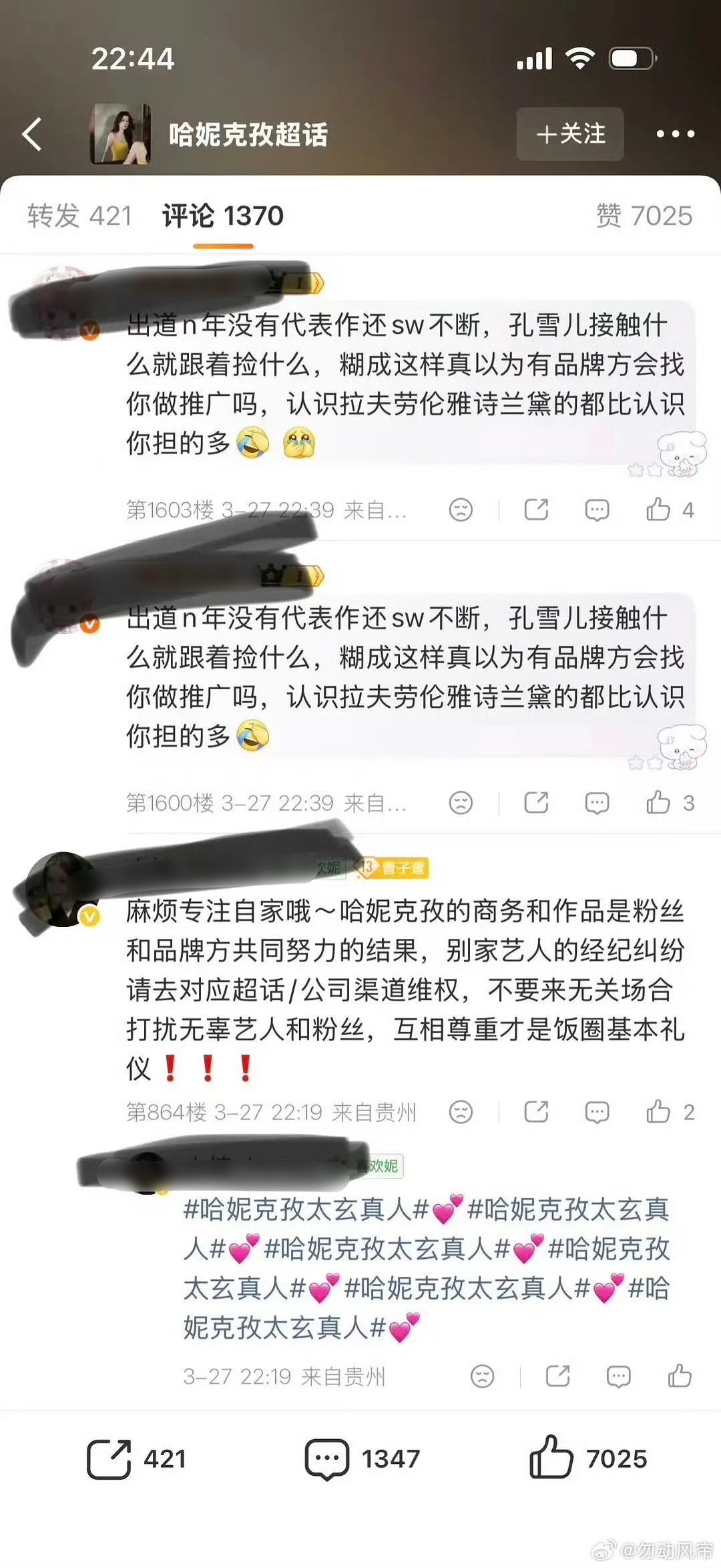 因为粉丝认为哈妮克孜和孔雪儿商务重合(拉夫劳伦和雅诗兰黛),然后粉丝去冲了哈妮和拉夫品牌的商务博,