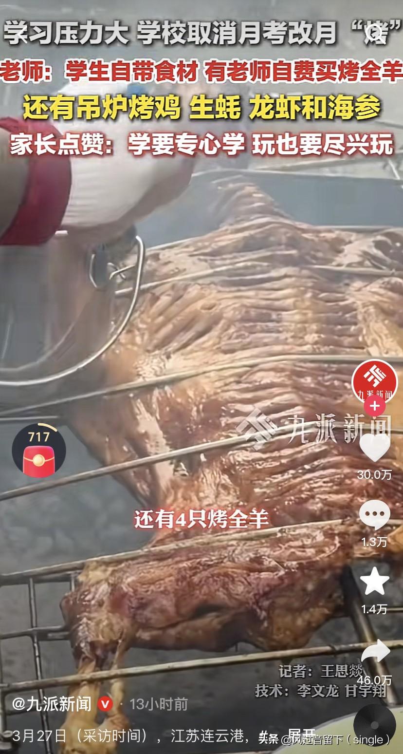 这学生这次月考绝对满分! 3月27日,江苏连云港赣榆外国语学校把月考变成了月“烤”。说是因为学生学习压力大,这个学期才上了不到20天课,于是就把月考取消了,改成了月“烤”。 学生肯定很高兴啊,都自带食材,原本只带少量东西,结果学生家长给带了很多,有生蚝、扇贝、龙虾、海参等。 还有4只烤全羊,三个由老师提供,一只由家长赞助,每只大概1400块。 还有十几只吊炉烤鸡。菜品十分丰盛! 这学生不就很高兴了么,不用面对试卷了,直接面对烤炉和肉串,这个可以说是一个很不错的放松方式。 我想说这次这次月考学生绝对能拿满分,毕竟这个烤肉都是自由发挥,想烤什么味就烤什么味。 我就想说这学校为啥我没遇到,每次考试时候压力特别大,一看到试卷头都很大。特别是一考完在看成绩和排名时候都是烦。 所以我感觉这个学校这个形式不错,让学生好好放松一下,毕竟这也锻炼学生的动手能力,比成绩好多了。 只能说还好学生不准喝酒、抽烟,要是可以,我估计有的学生就口袋装一包烟,边烤边抽,估计酒得几箱子。 还有就是一句话:不能浪费食物,量力而行!