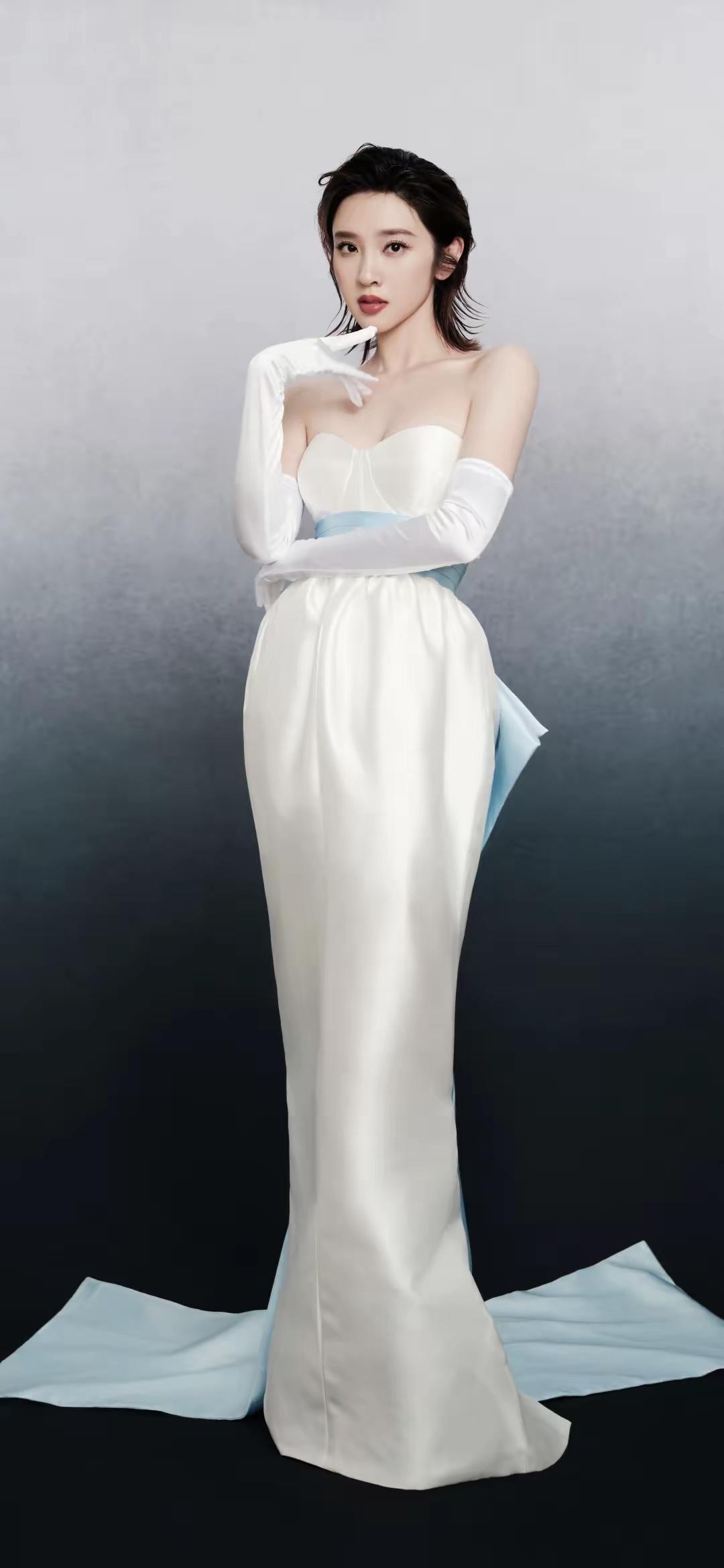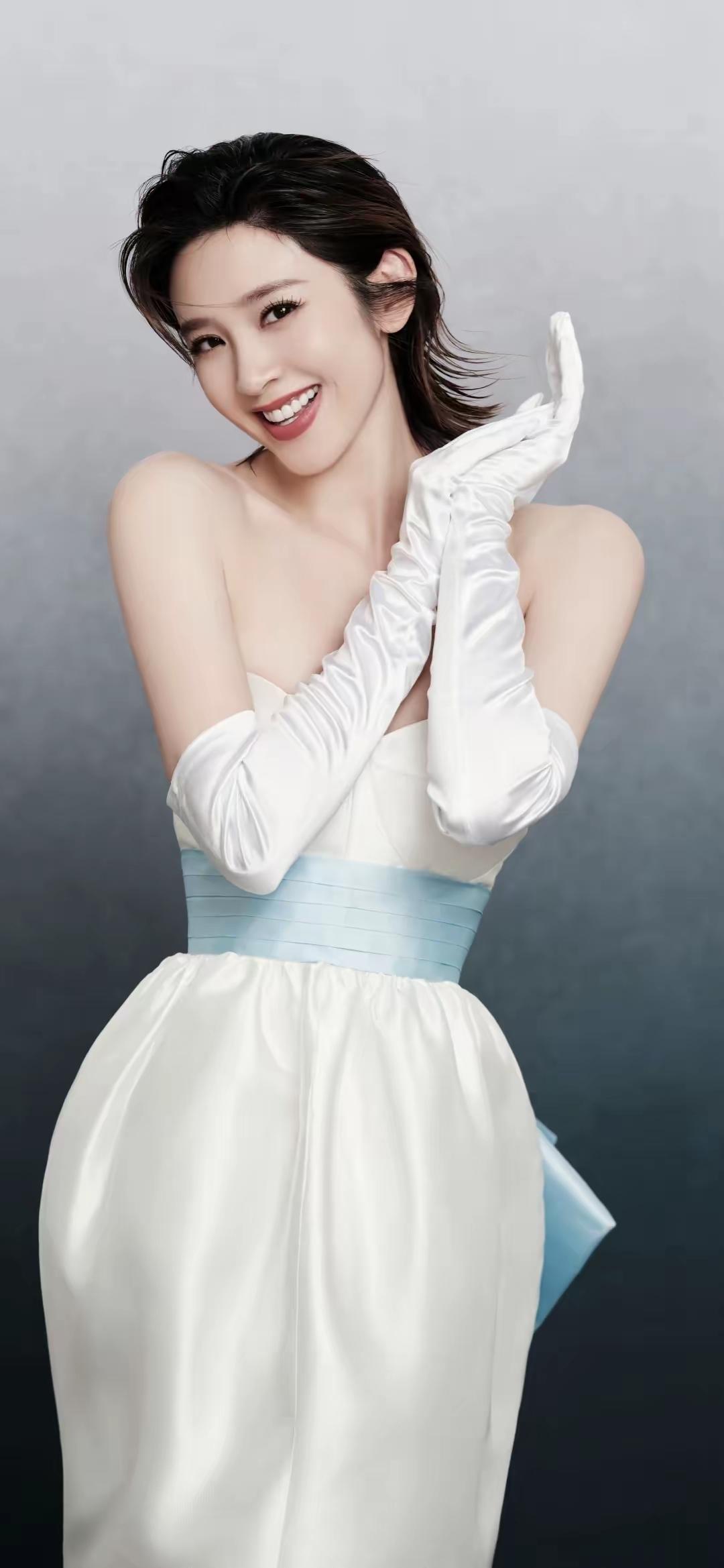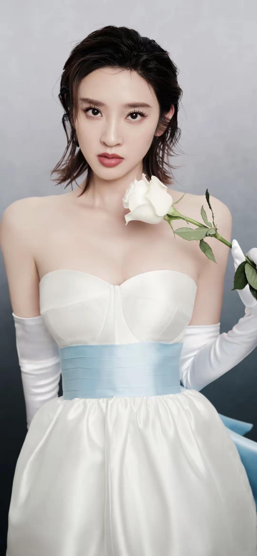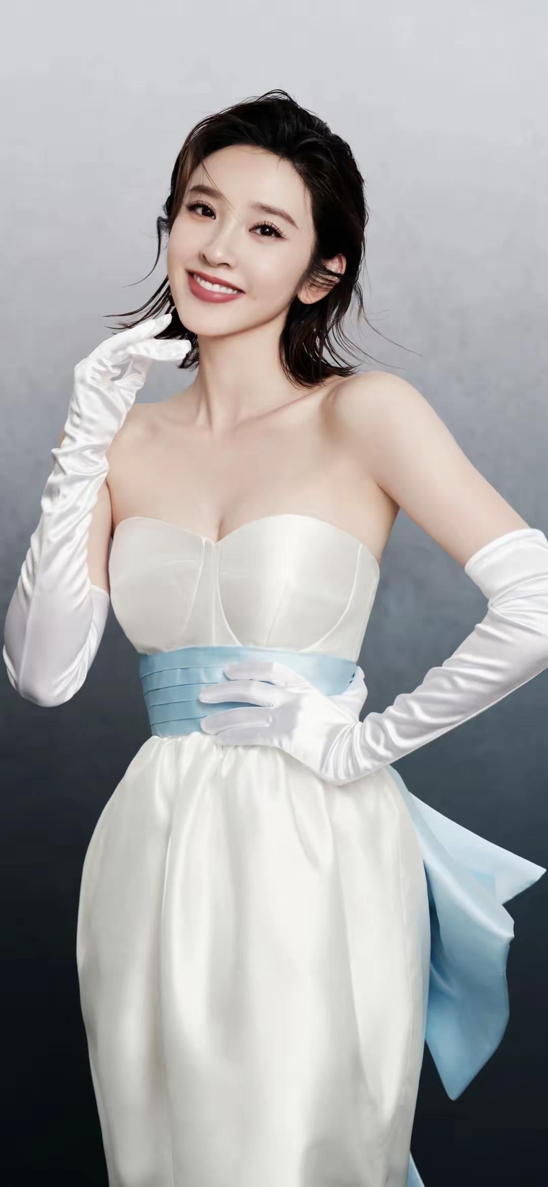 美女壁纸~唐艺昕,缎面白裙衬出清冷优雅,淡蓝缎带系出别样温柔。长款白手套添了复古韵味,那一抹红唇,是冷艳里的鲜活亮色