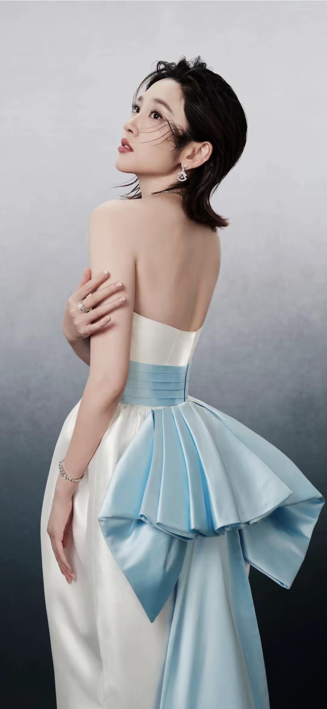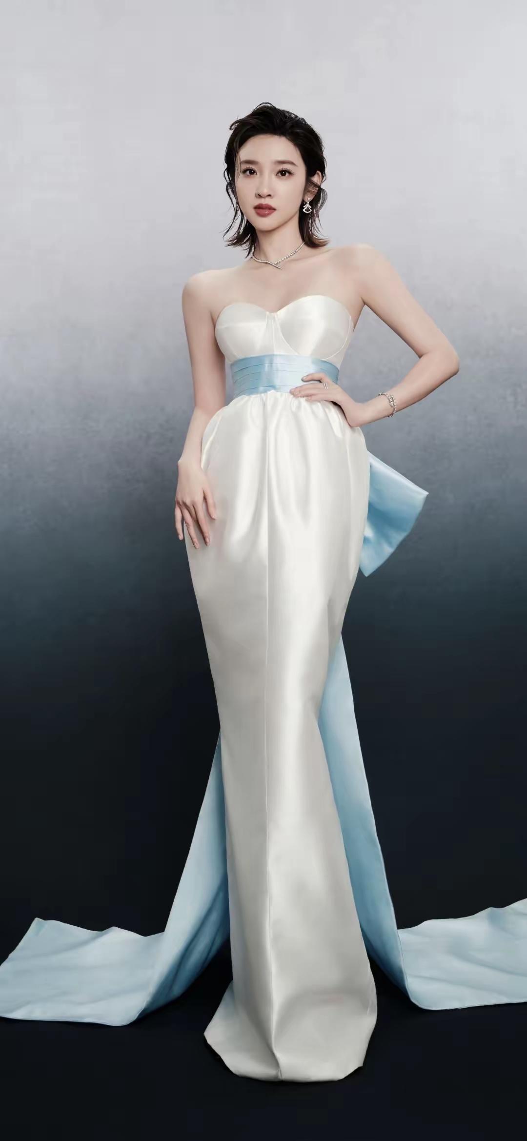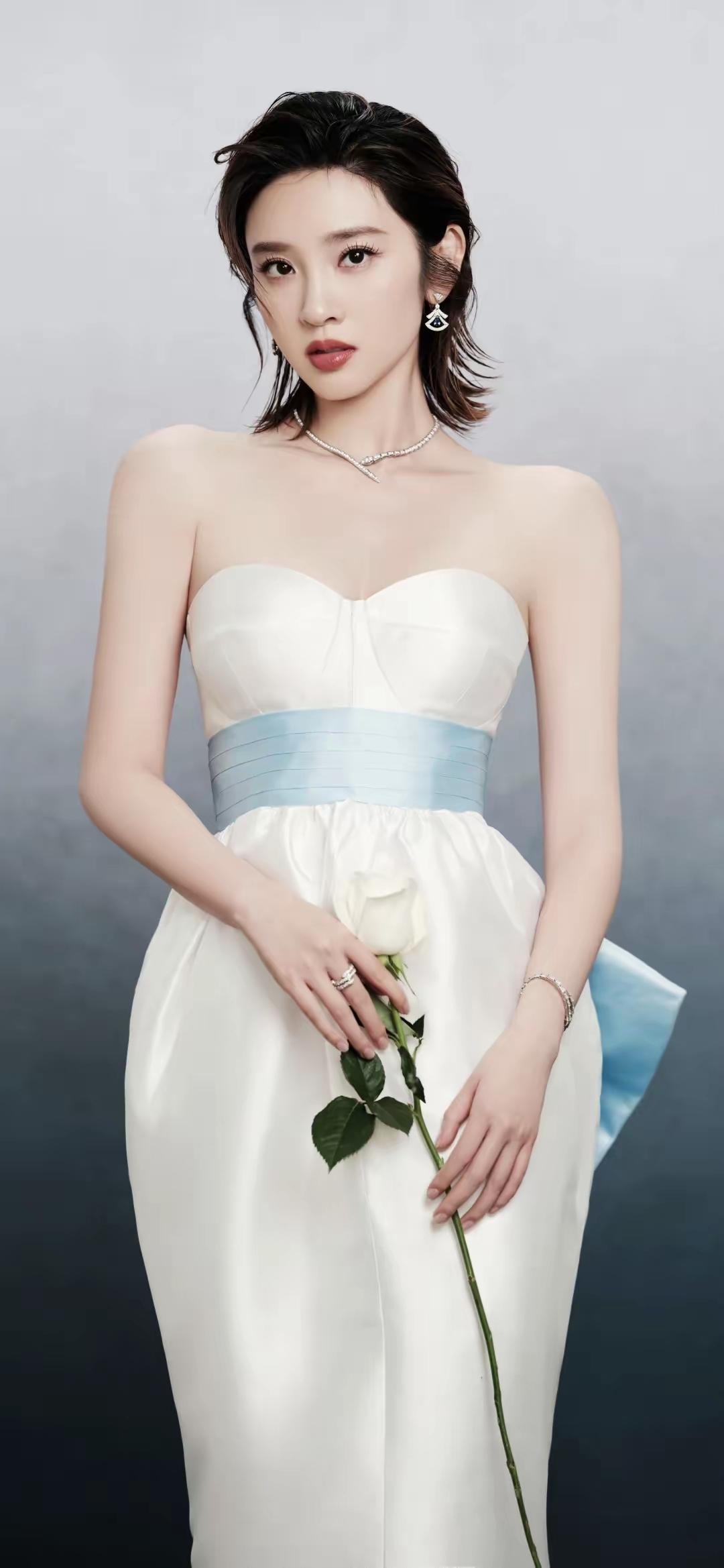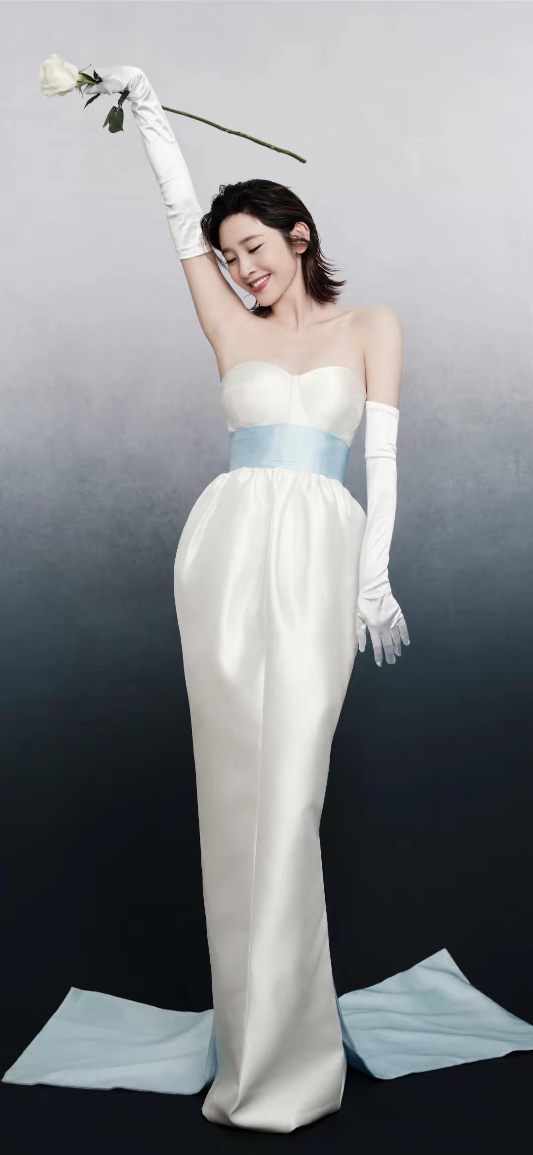 美女壁纸~唐艺昕,缎面白裙衬出清冷优雅,淡蓝缎带系出别样温柔。长款白手套添了复古韵味,那一抹红唇,是冷艳里的鲜活亮色