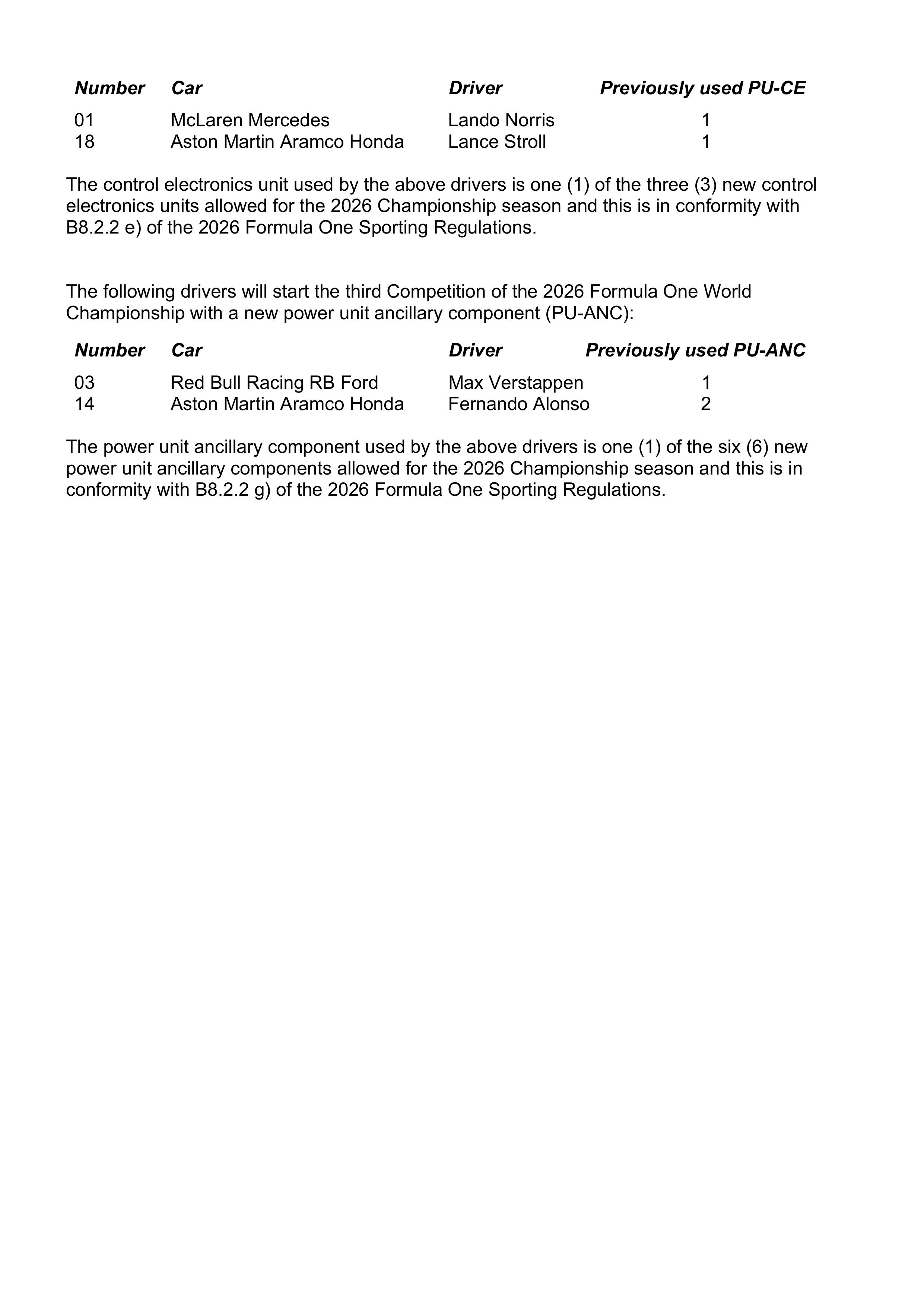 使用数量限制为:ICE内燃机 - 4套,TC涡轮 - 4套,MGU-K动能电机 - 3套,ES电池 - 3套,CE电控单元 - 3套,EX排气系统 - 4套,PU-ANC动力单元辅助部件 - 5套。
