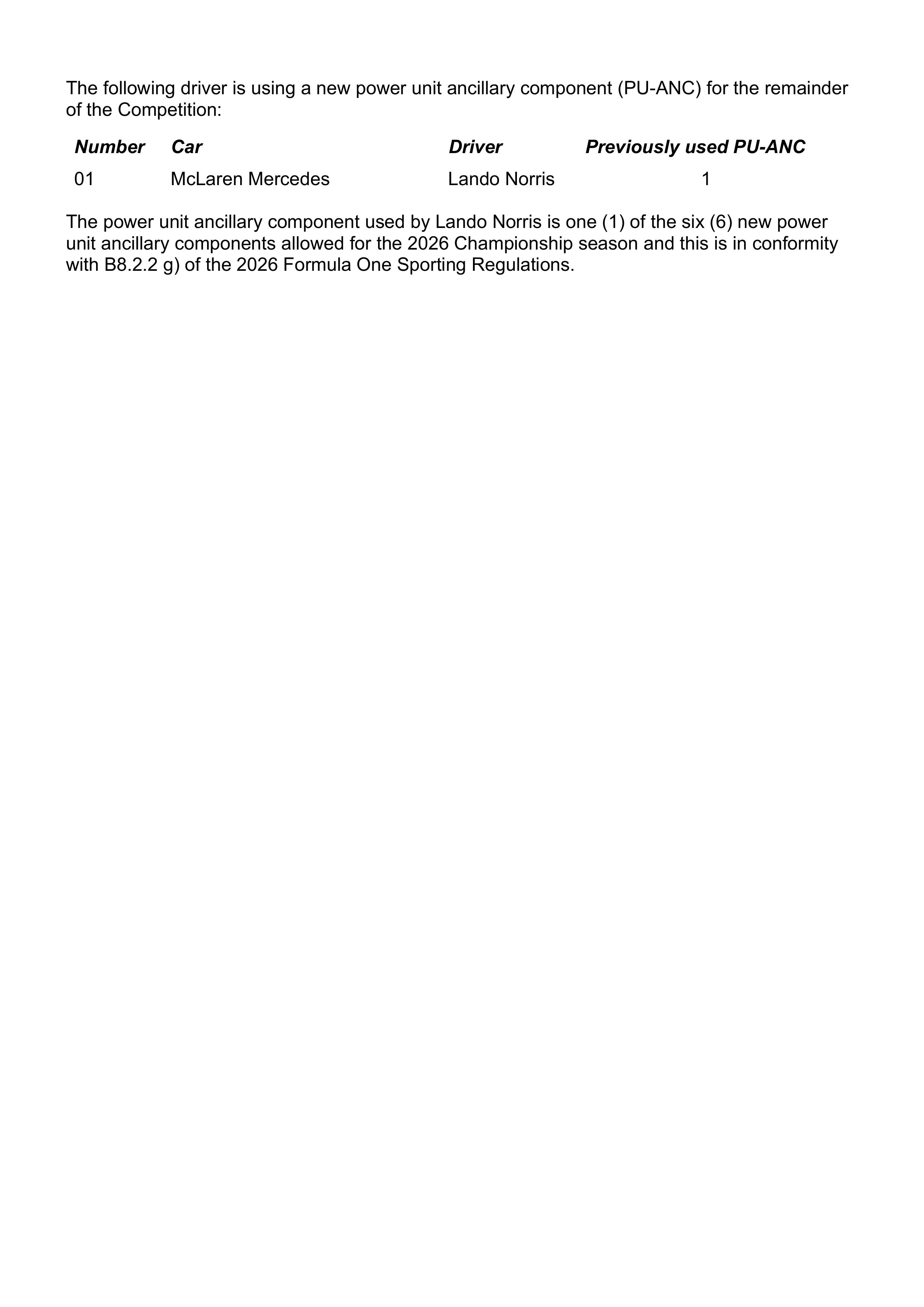新加入的动力单元制造商(奥迪、红牛-福特)可以在2026赛季元年中获得优待,使用这两家动力单元的车队/车手能多使用1套完整的动力单元。
