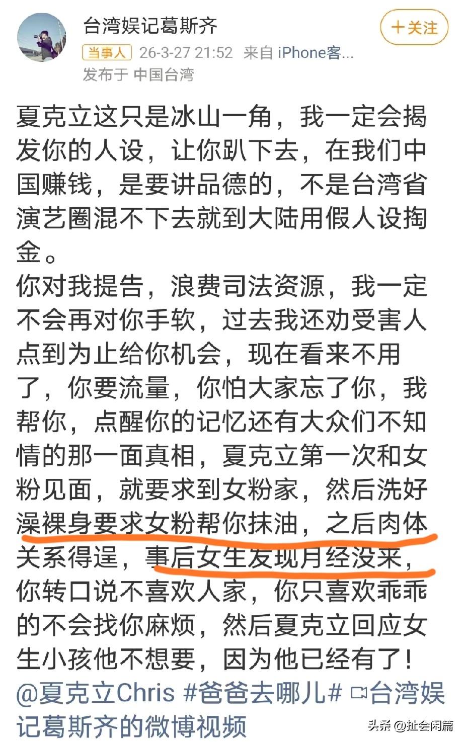 台湾省的狗仔葛思齐突然出来爆锤夏克立,说他约粉,睡粉,女孩怀孕之类的。 夏克立是加拿大籍艺人,因带女儿夏天参加《爸爸去哪儿3》被大众熟知。 早期曾从事电影动画制作(如参与过 《侏罗纪公园》动画制作),后转型为外景记者及儿童英语教学节目主持人。 前妻是台湾艺人黄嘉千。两人自2022年离婚诉讼以来,黄嘉千指控其家暴,夏克立否认并称被诬告,和女儿抚养权上存在激烈拉锯,官司至今仍有后续。