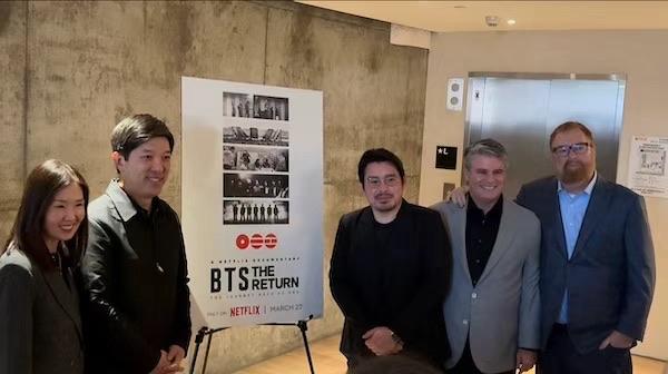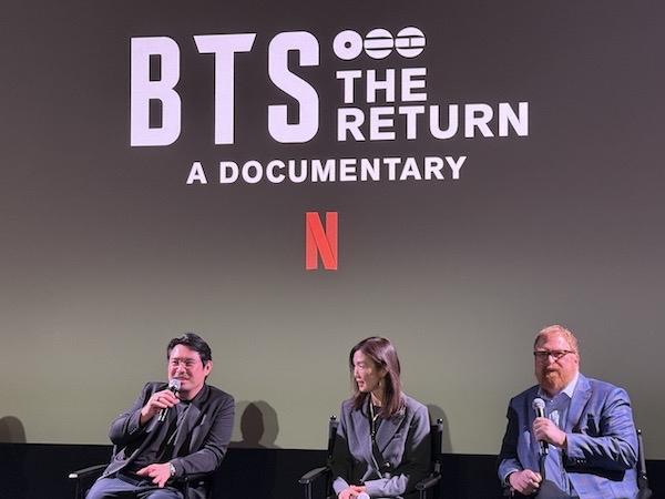 继直播BTS在首尔的现场演唱会后,Netflix在3月27日又推出了纪录片《BTS:天团回归》(BTS: The Return),记录了BTS(防弹少年团)在去年于洛杉矶制作新专辑《阿里郎》(Arirang)的经历,展示了因入伍停下团体活动三年的BTS是如何寻找新方向、挑战自我的。与此同时,这个纪录片也充满了7个成员在一个房子内居住生活、一起工作的温馨片段。本片的导演阮包( Bao Nguyen)和两位制片人R.J. Cutler 、Jane Cha Cutler在3月26日晚出席了本片首映礼,并向UNE新闻速递在内的美国媒体分享了拍摄幕后。