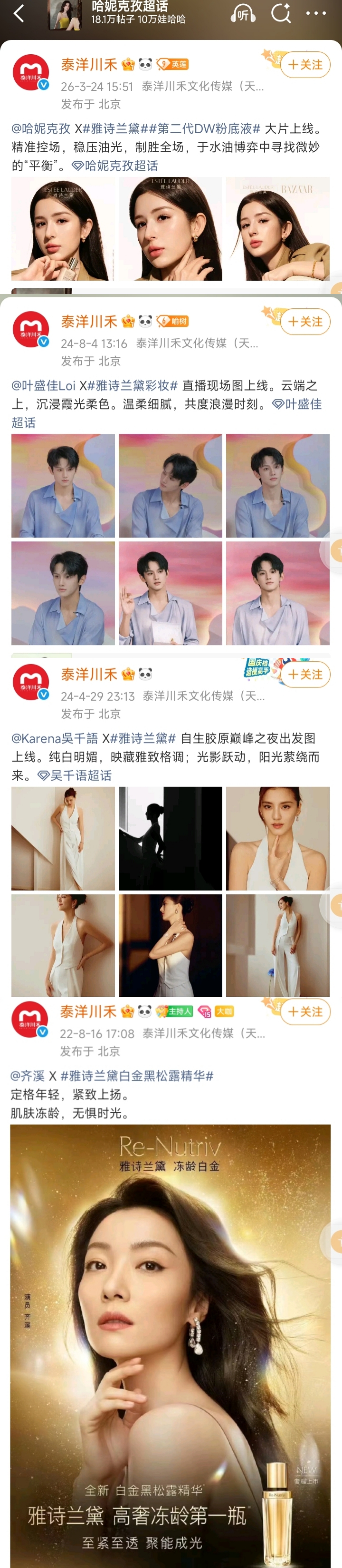 雅诗兰黛和泰洋川禾多个艺人都有商务合作.....