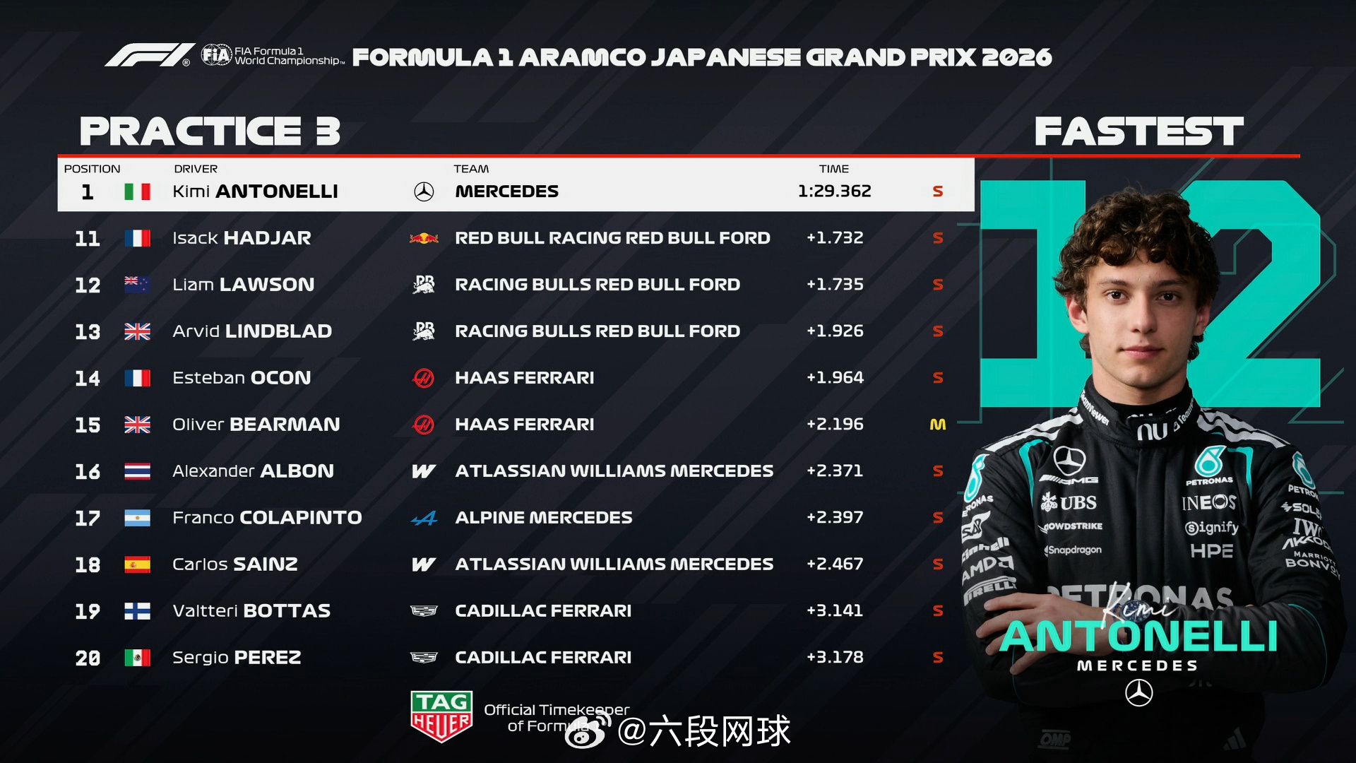 2026F1日本大奖赛三练结束!安东内利凭借1:29.362的最快圈速占据榜首拉