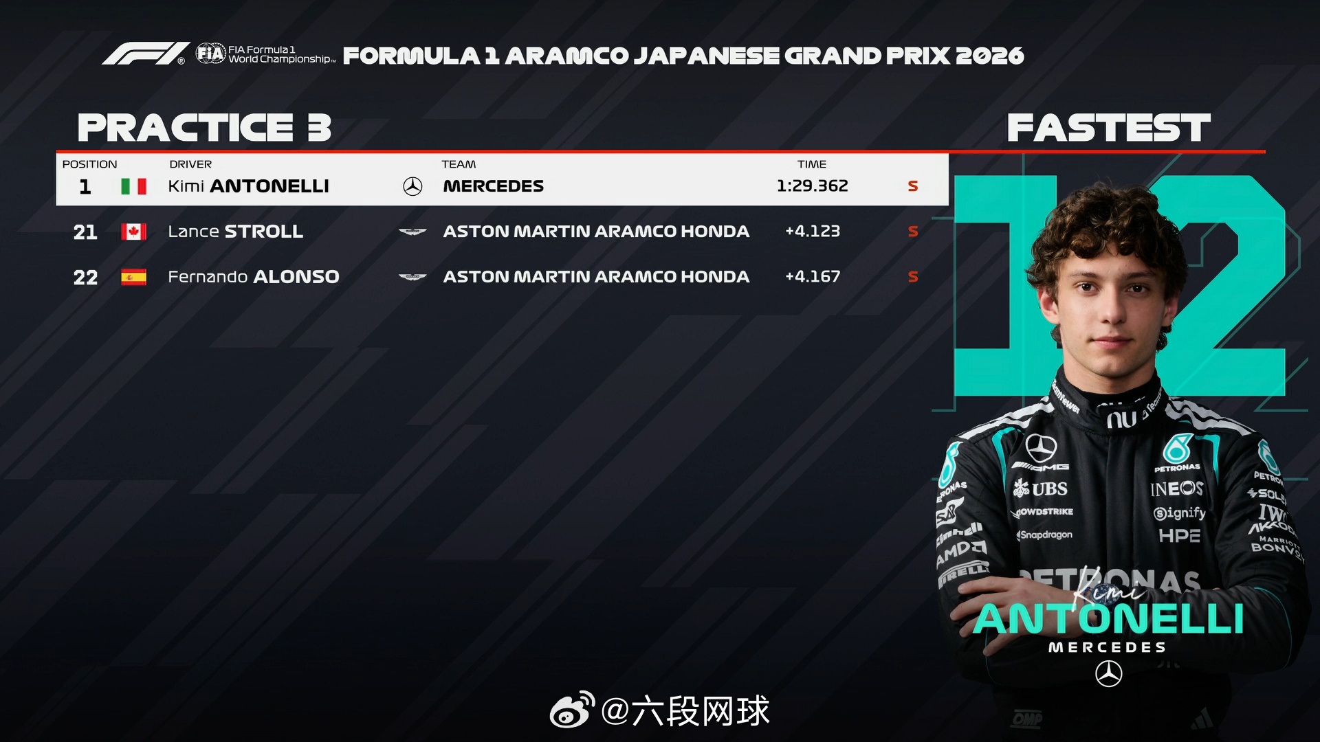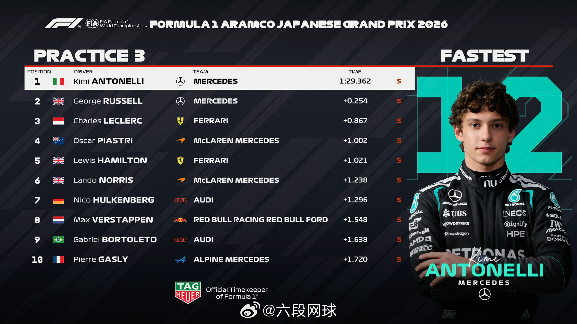 2026F1日本大奖赛三练结束!安东内利凭借1:29.362的最快圈速占据榜首拉塞尔落后0.254秒排在第二勒克莱尔落后0.867秒排在第三皮亚斯特里第四汉密尔顿第五梅赛德斯AMGF1车队 杭州
