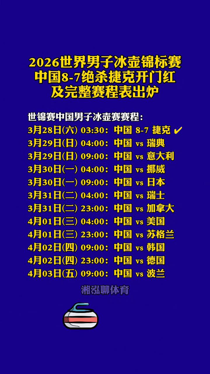 2026世界男子冰壶锦标赛,中国8-7绝杀捷克开门红及完整赛程表出炉。
