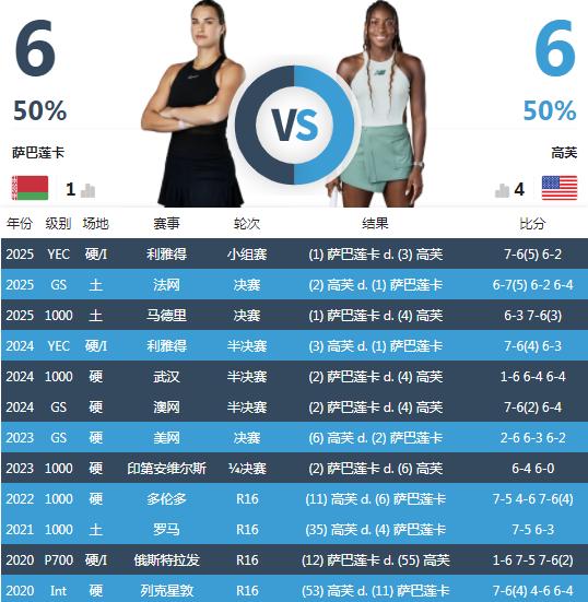WTA1000决赛预告(明晨) 03:00,1萨巴伦卡vs4高芙 过往交手6-6平分秋色 硬地记录: 萨巴伦卡5-4高芙 最近交手,2025利雅得年终, 萨巴伦卡7-6,6-2高芙 本场赔率: 萨巴伦卡1.36-3.20高芙 总体还是55开的情形, 萨巴稍微上风, 但高芙有主场加成。 谁是最后的冠军? 若萨巴夺冠, 将是2022斯瓦泰克之后首位拿下阳光双赛的球员。 你看好萨巴伦卡夺冠吗?