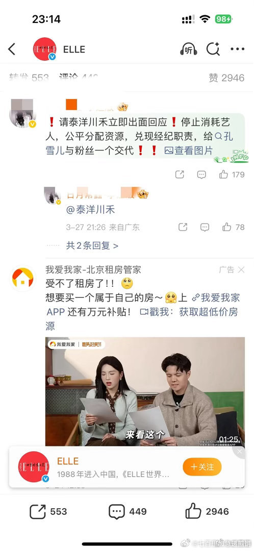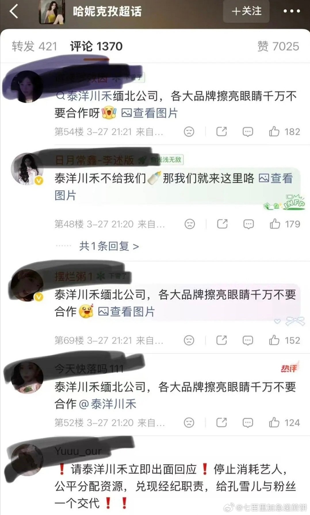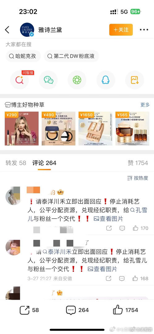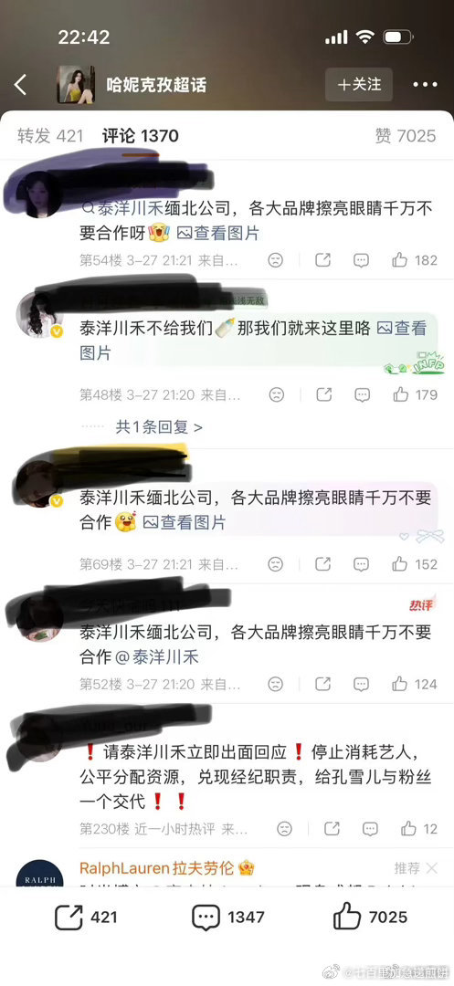 孔雪儿粉丝要求泰洋川禾归还商务,公平分配资源然后孔雪儿工作室发博,意思大品牌目前