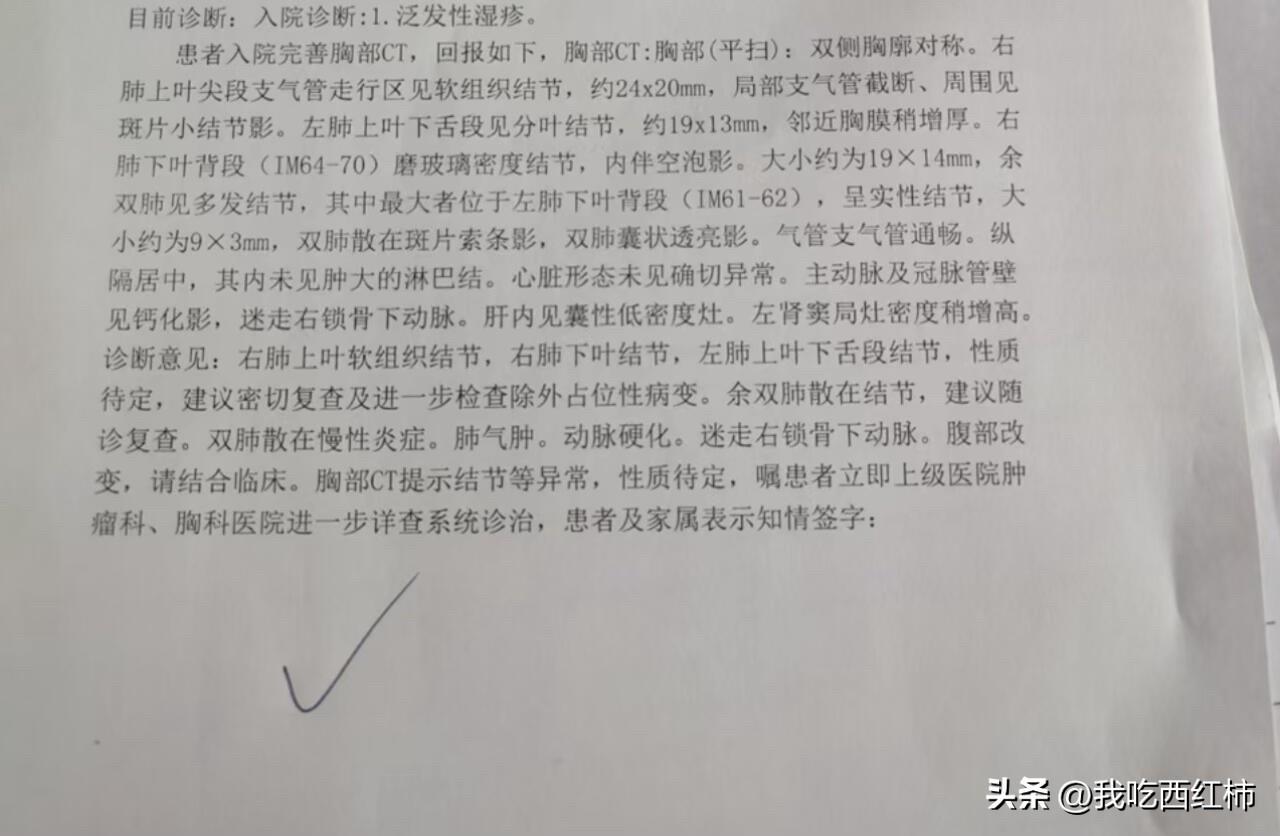 我爸爸身上痒了一段时间了,一直不肯去医院,上周开始加重,所以去了沈阳七院,初步检查是皮肤过敏湿疹,用了一周药也没有一点好转,所以一周后又去了,医生给换了更强力的药,还是不见好转,这周二又去,医生要求住院,入院检查肺部ct发现了如图,现在七院要求去十院,去了十院医生说挺严重…有没有懂的朋友,估计必须要手术吧,沈阳那个医院这方面更好呢?十院是市胸科医院还是医大?或是北京有更好的?